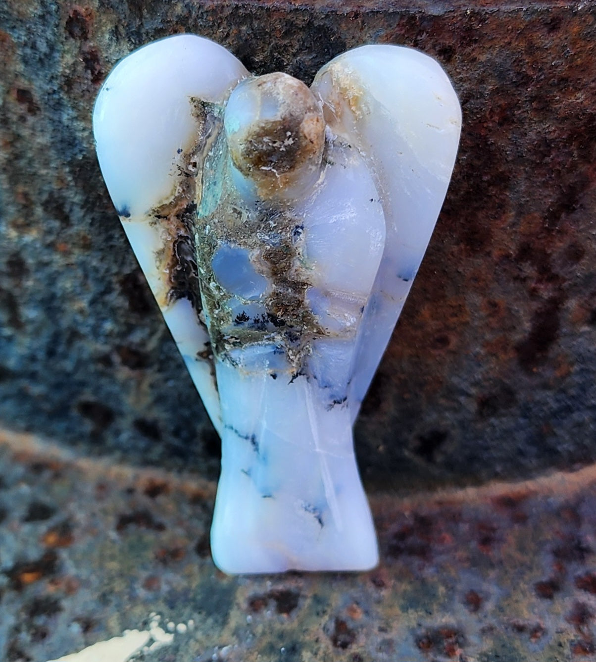The 2" Dendritic Angel is carved from Dendritic Agate, a form of chalcedony distinguished by its intricate, tree-like inclusions. Dendritic Agate is revered for its connection to nature, grounding energy, and ability to facilitate personal growth and transformation. This Dendritic Angel figurine emanates a serene and grounding energy that resonates with the essence of angelic guidance and natural beauty. Its translucent to opaque appearance reveals delicate, fern-like patterns that resemble miniature landscapes, evoking a sense of tranquility and connection to the earth.