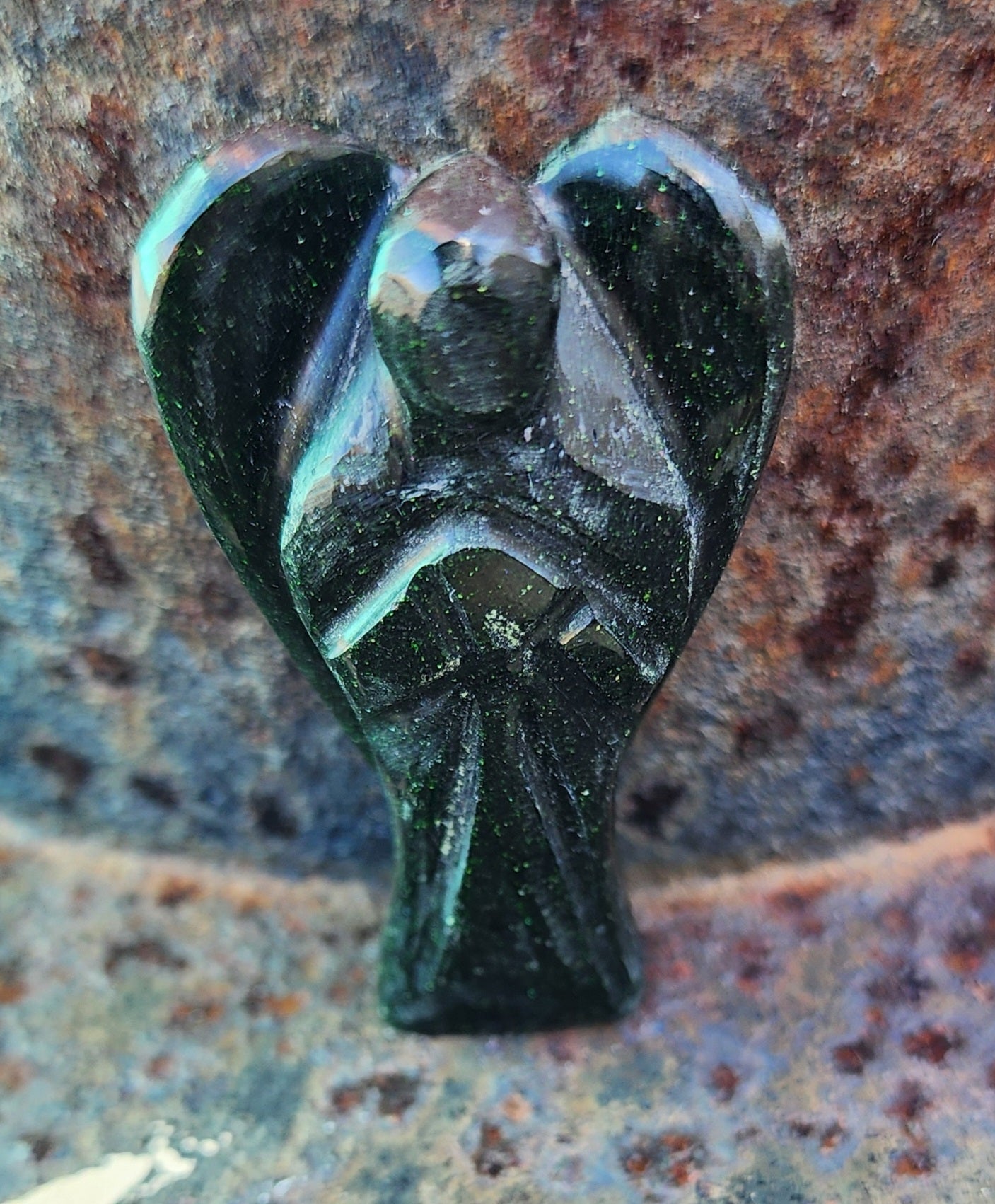 The 2" Green Goldstone Angel is a stunning crystal figurine carved from Green Goldstone, a man-made glass infused with copper flecks. Green Goldstone is celebrated for its vibrant green color and its ability to promote growth, abundance, and vitality. This Green Goldstone Angel figurine radiates a mesmerizing energy that resonates with the essence of angelic guidance and prosperity. Its lustrous green hue, speckled with shimmering copper flecks, evokes a sense of renewal and abundance, making it a cherished addition to any sacred space or crystal collection. It serves as a symbol of hope and transformation.