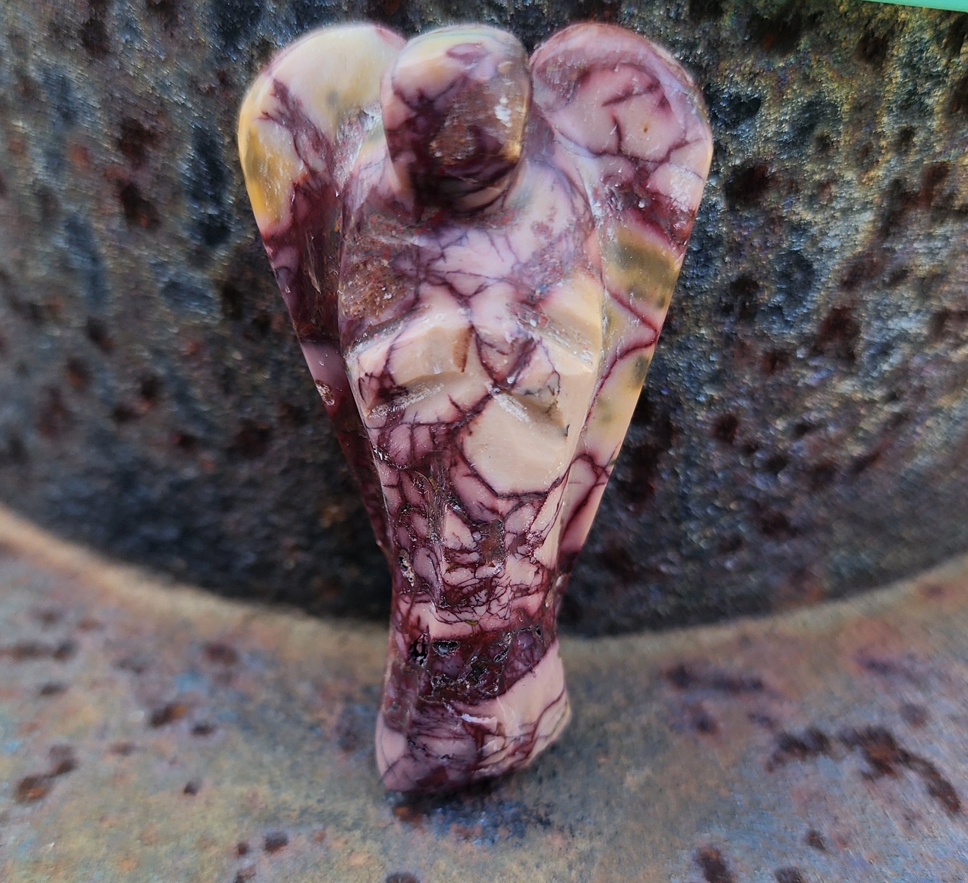 The 2" Mookite Angel is carved from Mookite Jasper, a unique and beautiful stone known for its vibrant earthy tones and nurturing energy. Mookite is revered for its ability to promote stability, vitality, and a deep connection to the earth. This Mookite Angel exudes a warm and comforting energy that resonates with the essence of angelic guidance and grounding. Its rich blend of colors, including shades of red, yellow, and brown, creates a beautiful and harmonious appearance, making it a cherished addition to any sacred space or crystal collection. The angelic figure is imbued with the energy of divine protection and nurturance, serving as a symbol of strength and reassurance.