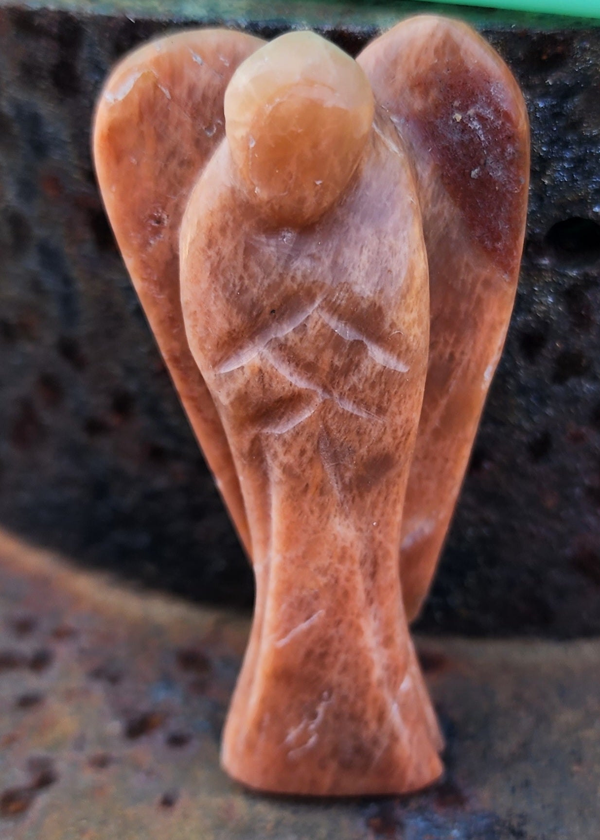 The 2" Peach Moonstone Angel is a crystal figurine carved from Peach Moonstone, a variety of Moonstone known for its soft, peachy hues and its connection to emotional healing and feminine energy. Peach Moonstone is revered for its ability to soothe emotions, enhance intuition, and promote self-discovery. This Peach Moonstone Angel exudes a gentle and nurturing energy that resonates with the essence of angelic guidance and emotional healing. Its soft peach color, with subtle iridescence, creates a warm and inviting appearance, making it a cherished addition to any sacred space or crystal collection. The angelic figure is meticulously carved, capturing the graceful curves of its wings and the serene expression on its face. Each detail is imbued with the energy of divine love and compassion, serving as a symbol of comfort and reassurance.