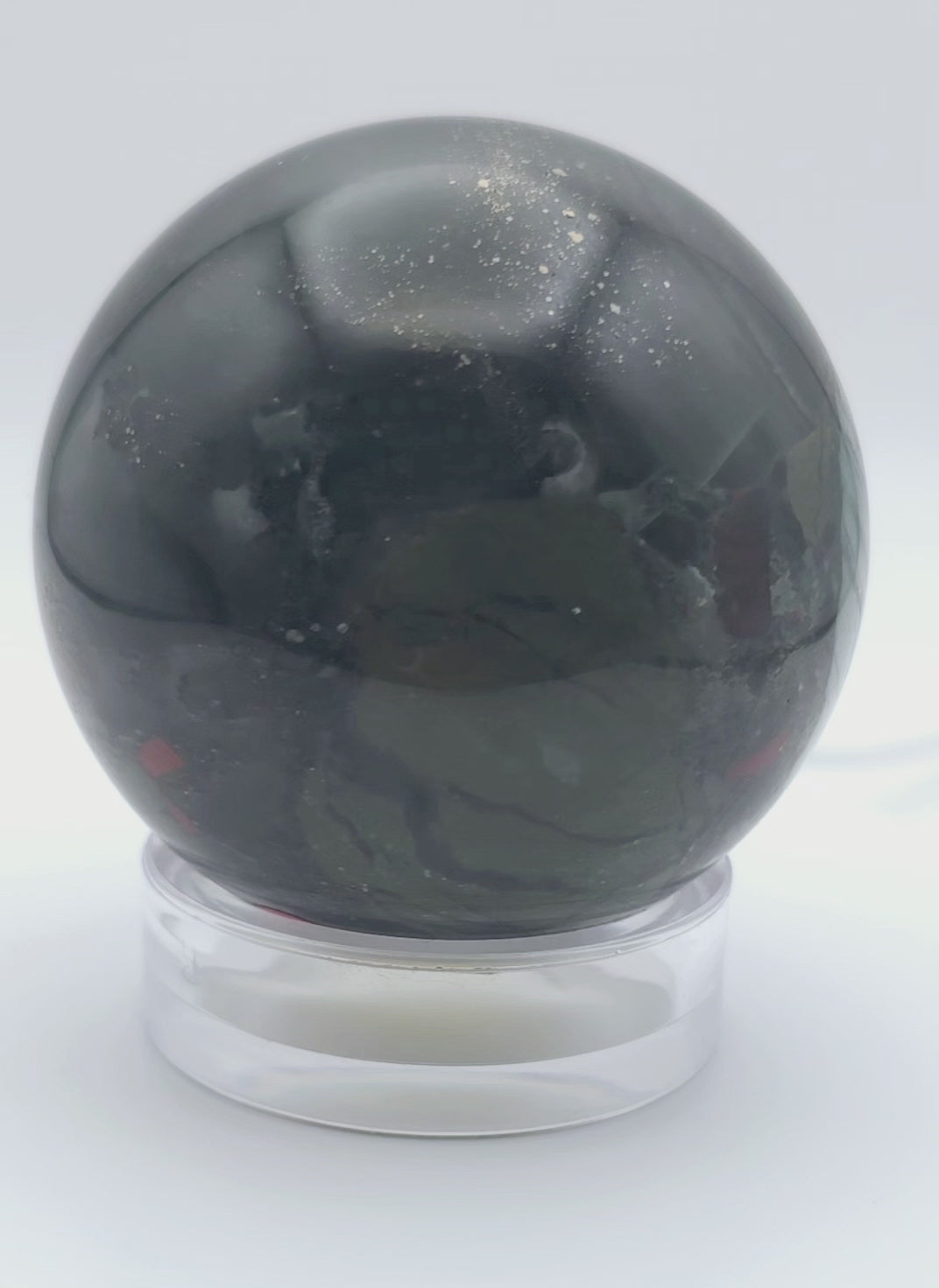 The African bloodstone sphere is a captivating work of nature's artistry, its polished surface adorned with a rich tapestry of deep green hues interspersed with vivid red or brown spots, reminiscent of droplets of blood scattered across a lush landscape. Crafted with precision and care, each sphere showcases the natural beauty of bloodstone, with its unique patterns and colors that evoke a sense of mystery and intrigue.