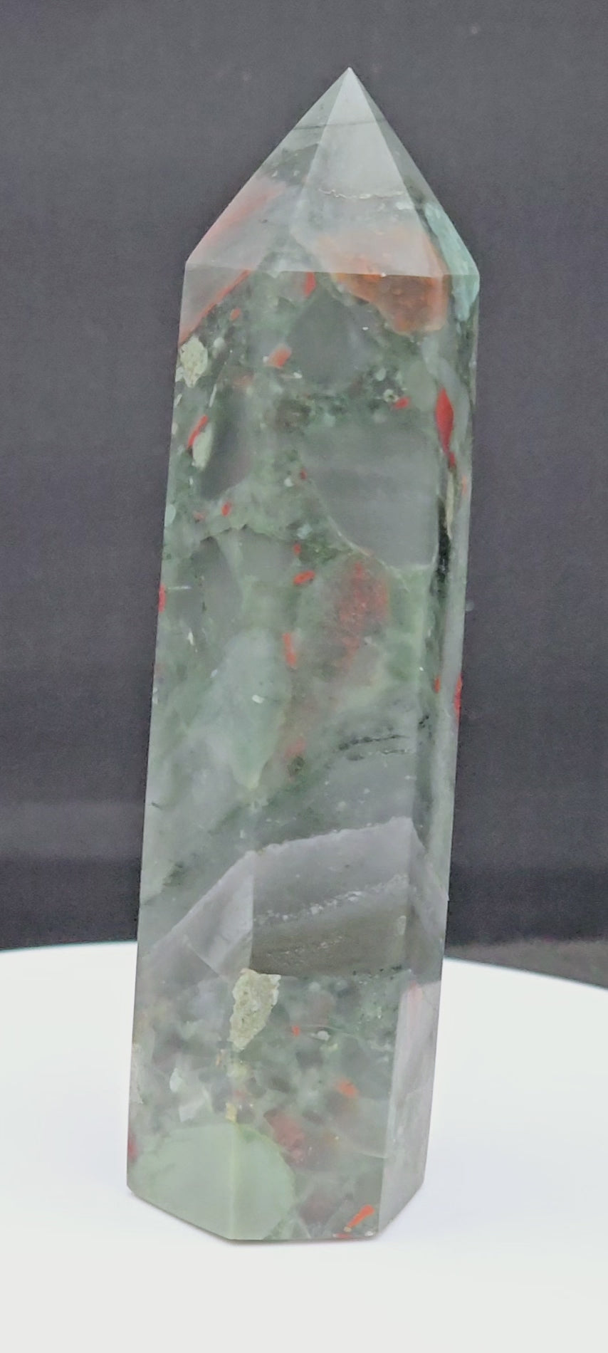 The African Bloodstone Tower is a striking crystal formation that embodies the unique properties of African Bloodstone while aligning with specific chakras for holistic balance and healing. Here's a description of an African Bloodstone Tower with corresponding chakras: