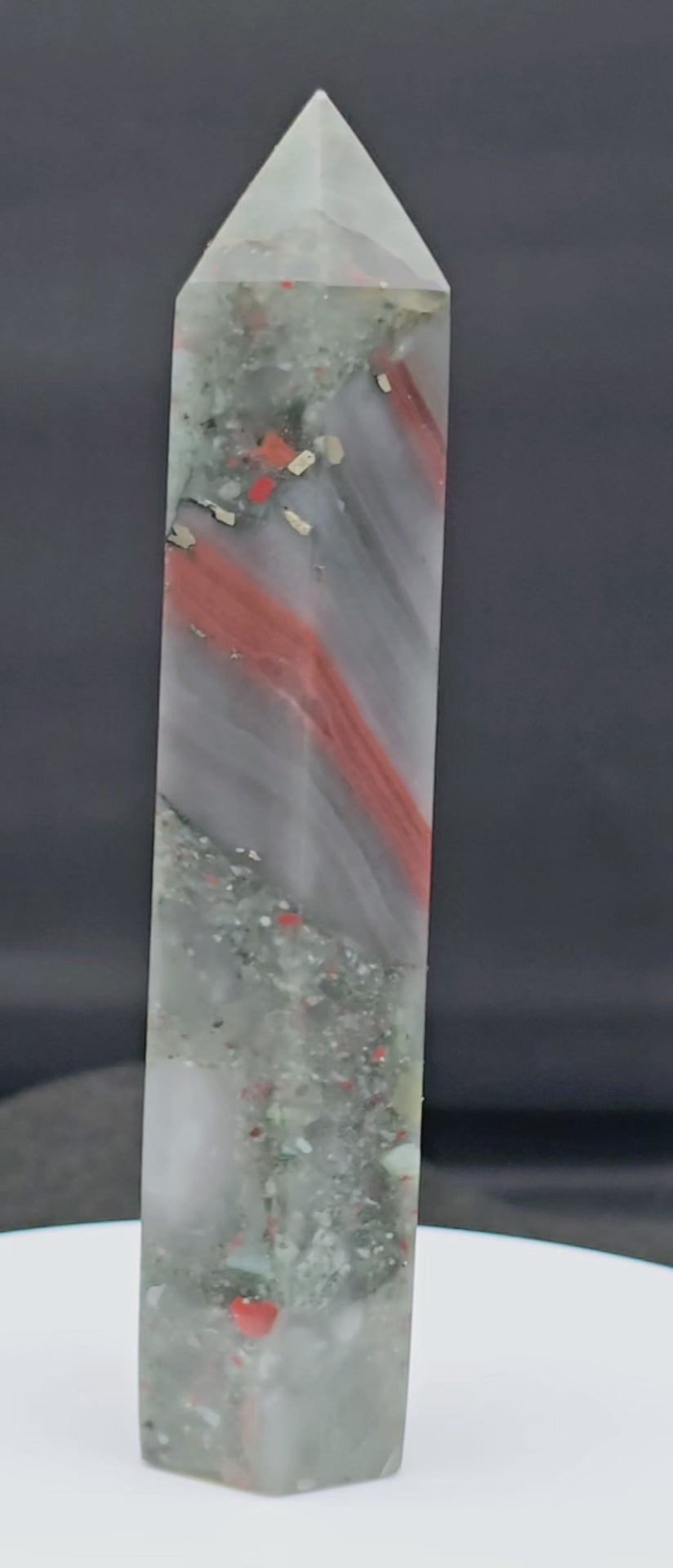 The African Bloodstone Tower is a striking crystal formation that embodies the unique properties of African Bloodstone while aligning with specific chakras for holistic balance and healing. Here's a description of an African Bloodstone Tower with corresponding chakras: