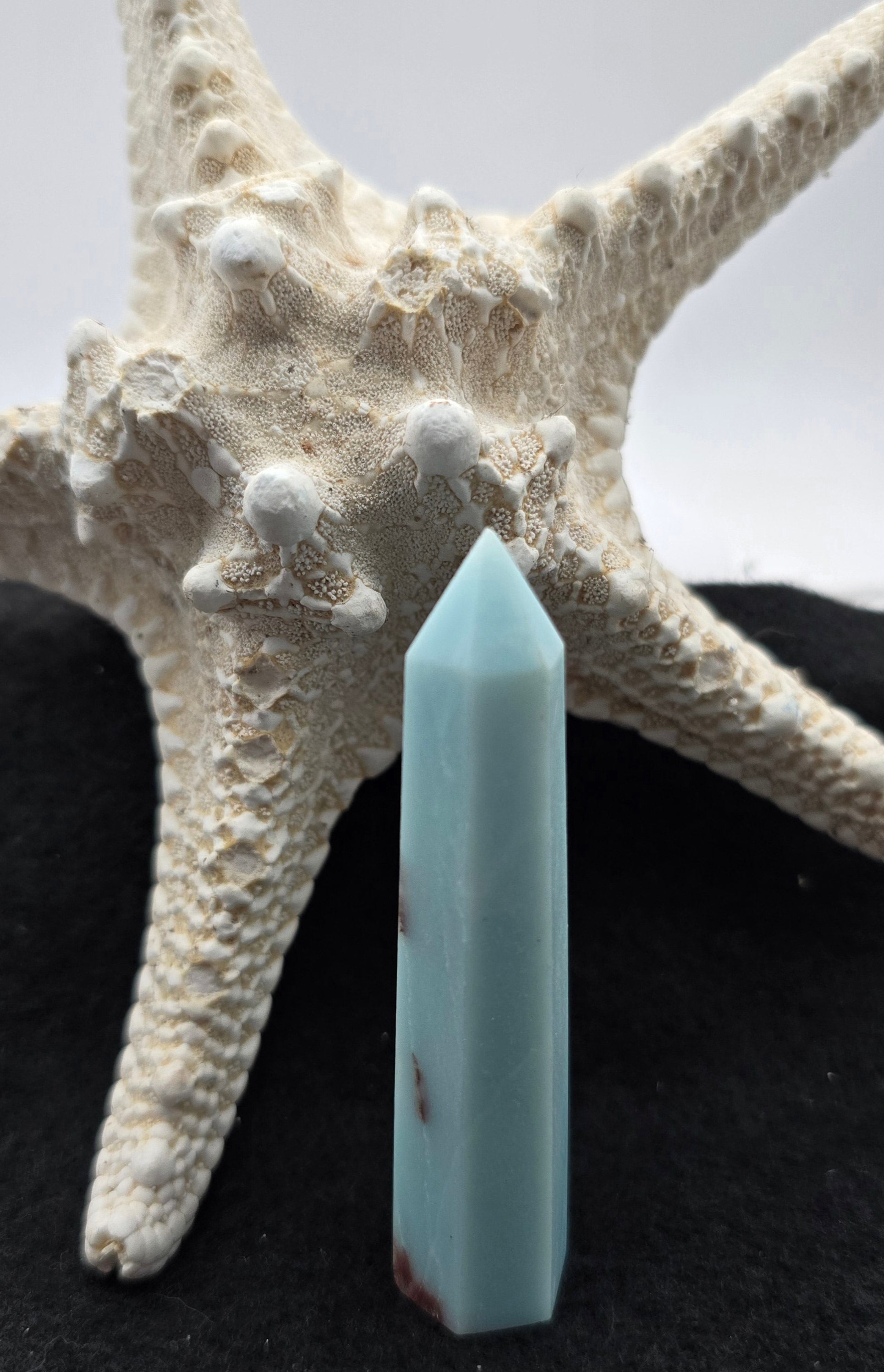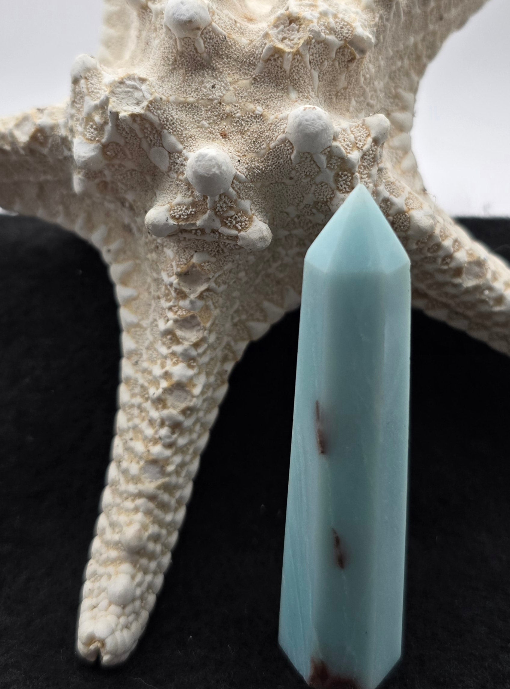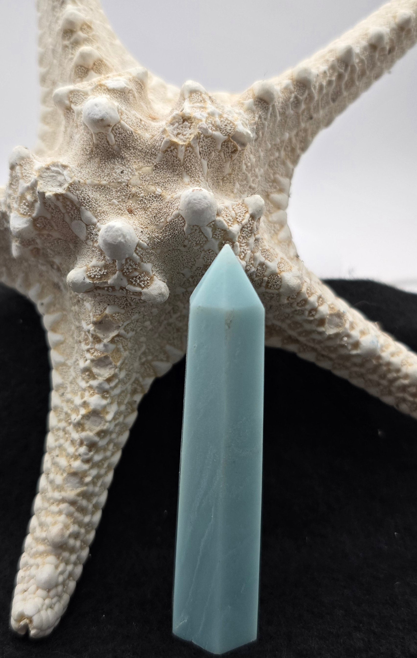 Emotional Healing: Caribbean calcite is known for its gentle, soothing energy that promotes emotional healing and inner peace. By holding or meditating with a Caribbean calcite tower, individuals can release stress and anxiety, allowing for a deeper sense of relaxation and tranquility. Spiritual Connection: The serene energy of Caribbean calcite facilitates spiritual growth and connection. It opens the heart and throat chakras, encouraging clear communication and fostering a deeper connection with one's intuition and spiritual guides. Creativity and Inspiration: Caribbean calcite is believed to stimulate creativity and imagination, making it an ideal companion for artists, writers, and musicians seeking inspiration. By keeping a Caribbean calcite tower nearby, individuals can access their creative flow more easily and express themselves with greater clarity and passion. Elevated Consciousness: The high vibrational energy of Caribbean calcite raises one's consciousness and helps to facilitate spiritual awakening. It encourages a greater awareness of the interconnectedness of all beings and promotes a sense of unity and harmony with the universe. Physical Healing: In addition to its spiritual benefits, Caribbean calcite is thought to have physical healing properties. It may aid in the relief of headaches, migraines, and other ailments related to tension and stress. Additionally, it is believed to support the immune system and promote overall well-being.