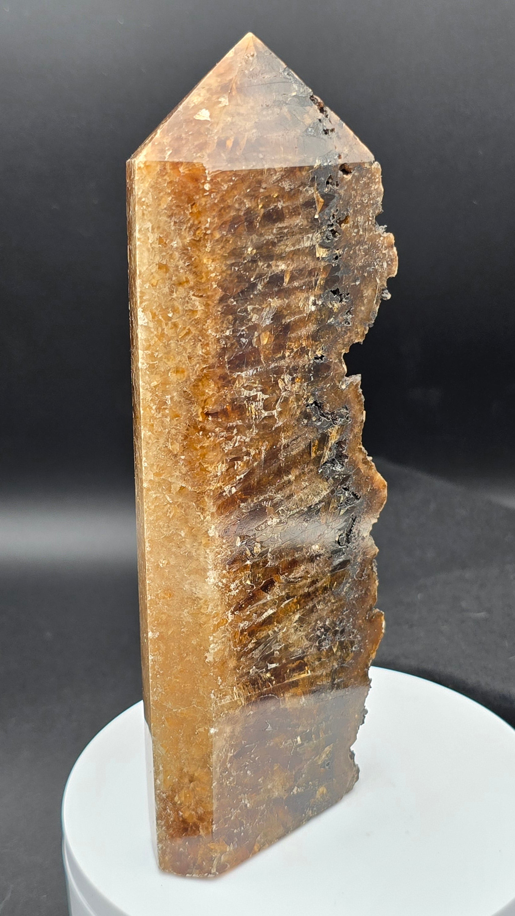 In summary, an Amber Raw Edge Tower is a beautiful and energetically potent crystal that supports emotional healing, creativity, protection, and spiritual growth. It radiates a warm and nurturing energy that benefits the entire being and promotes a sense of inner strength, balance, and vitality.