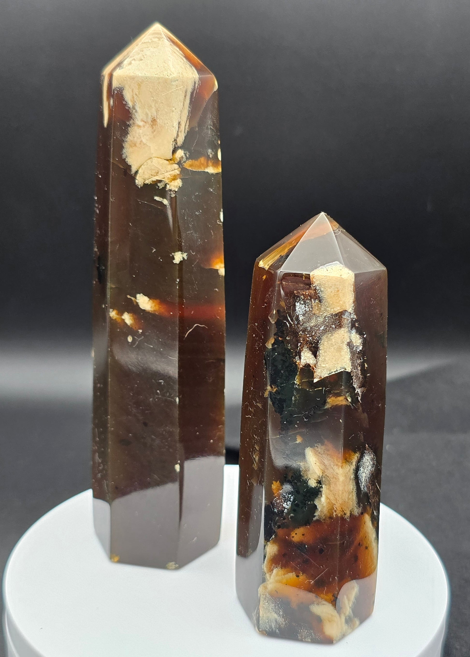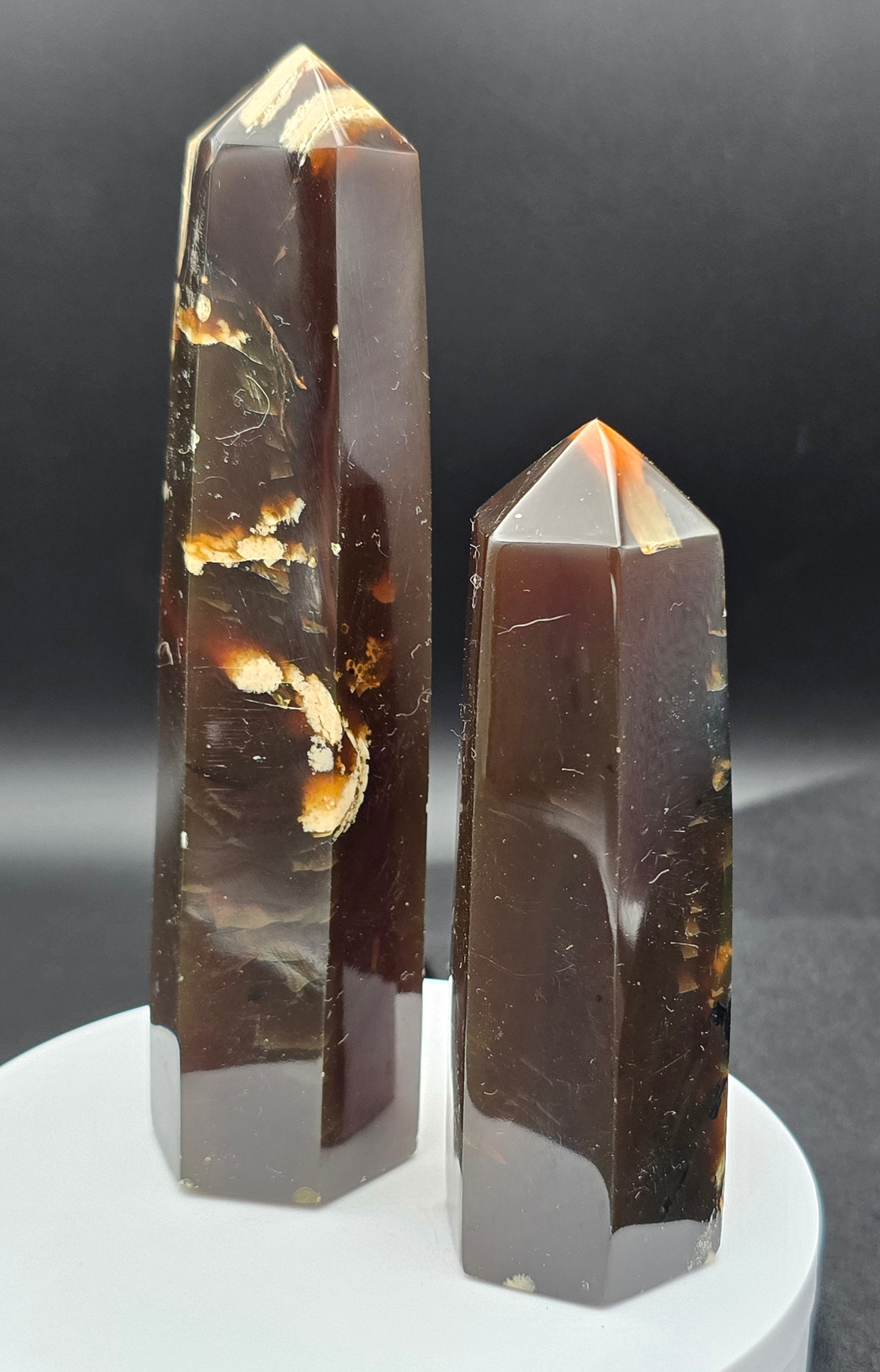 - Texture: Amber has a smooth and polished texture, but in a Raw Edge Tower, you can see the natural textures, inclusions, and patterns that give each piece its unique character.