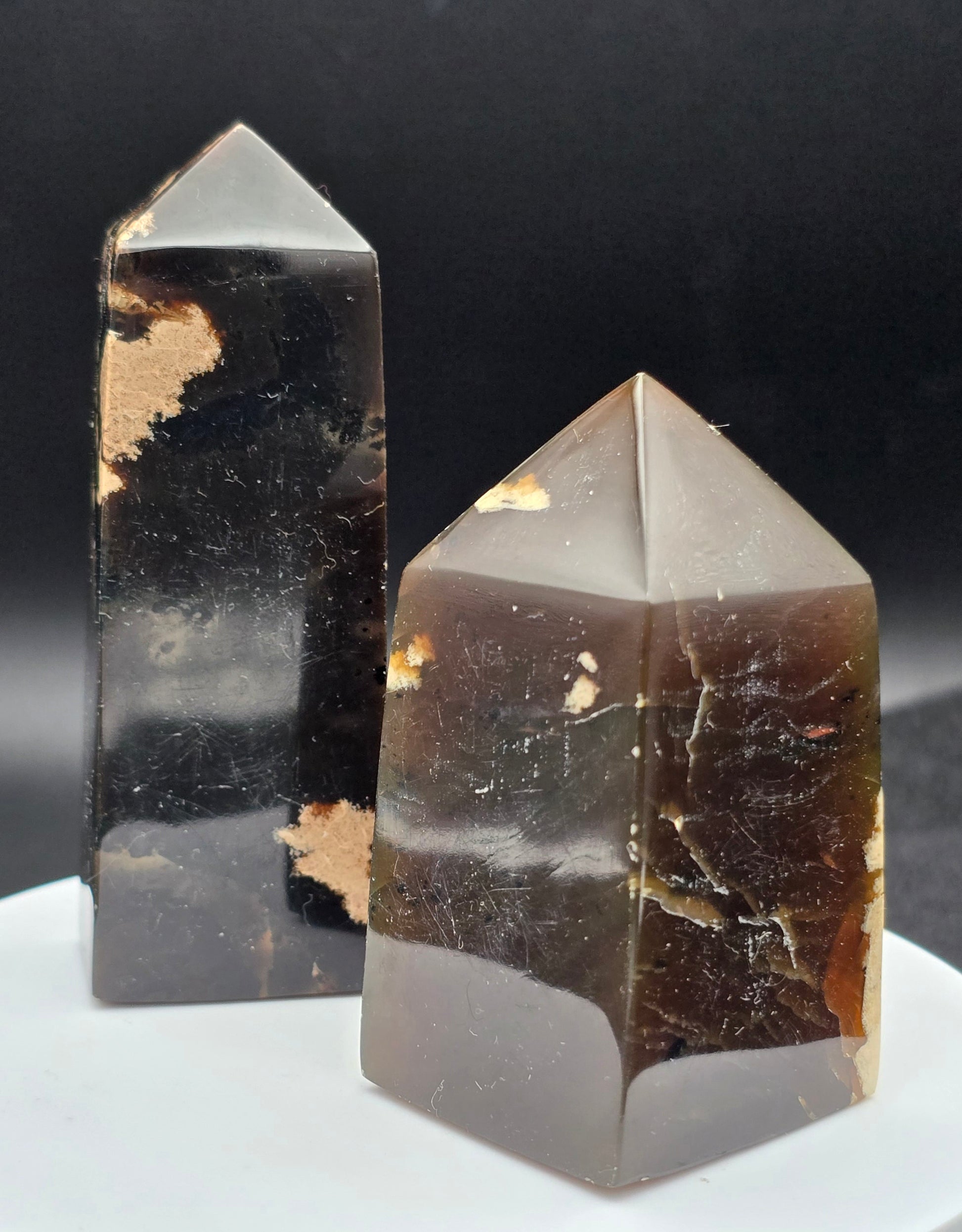 - Texture: Amber has a smooth and polished texture, but in a Raw Edge Tower, you can see the natural textures, inclusions, and patterns that give each piece its unique character.