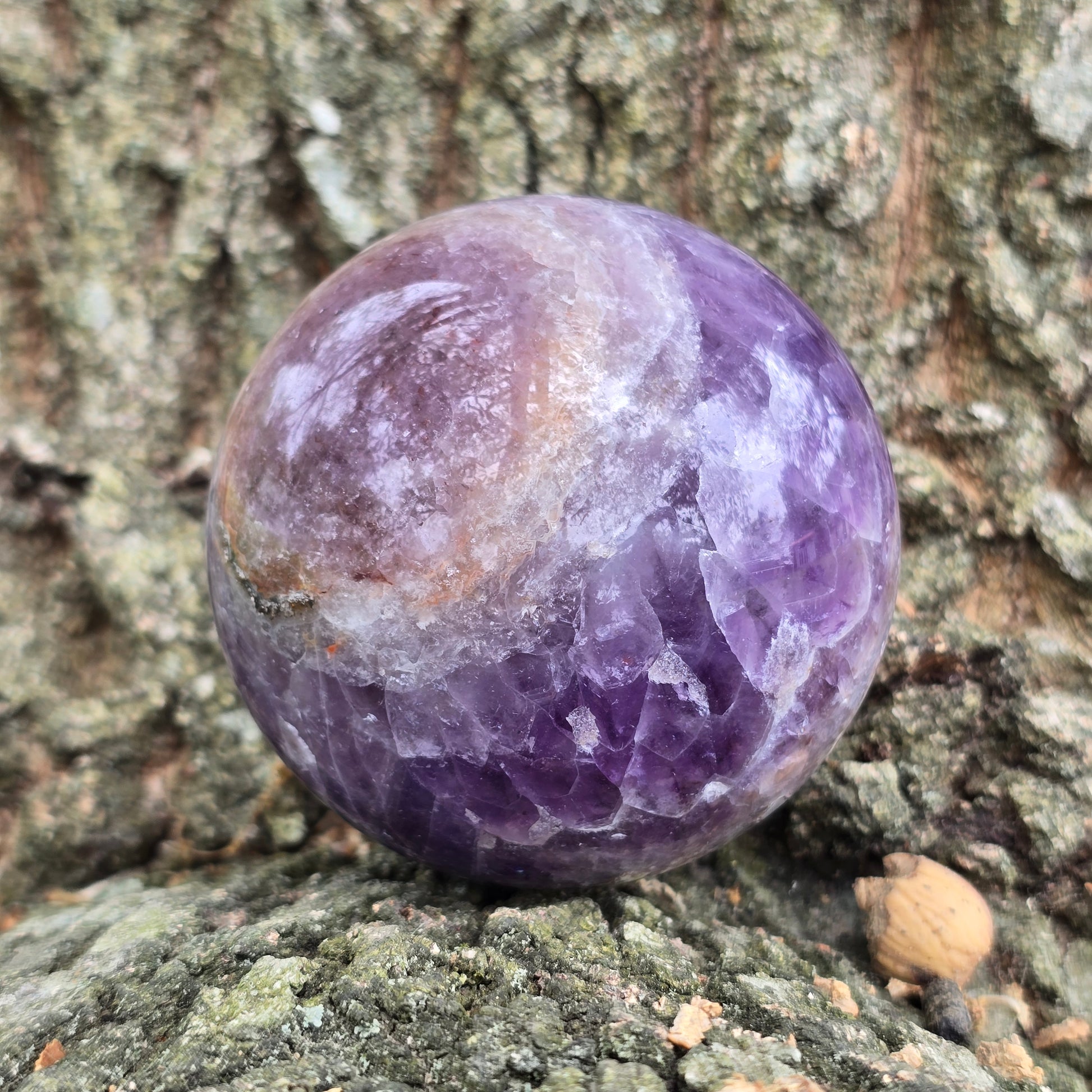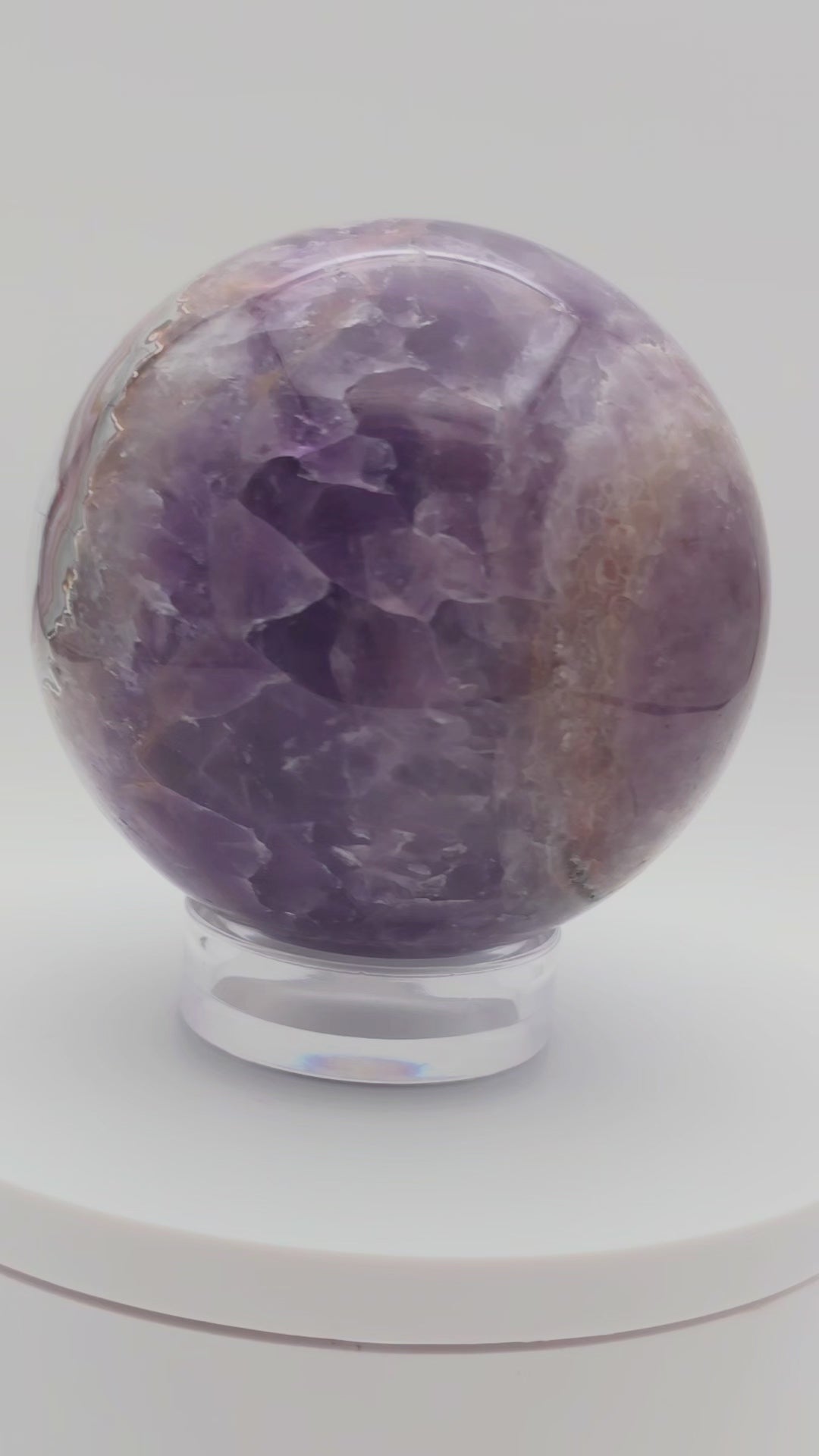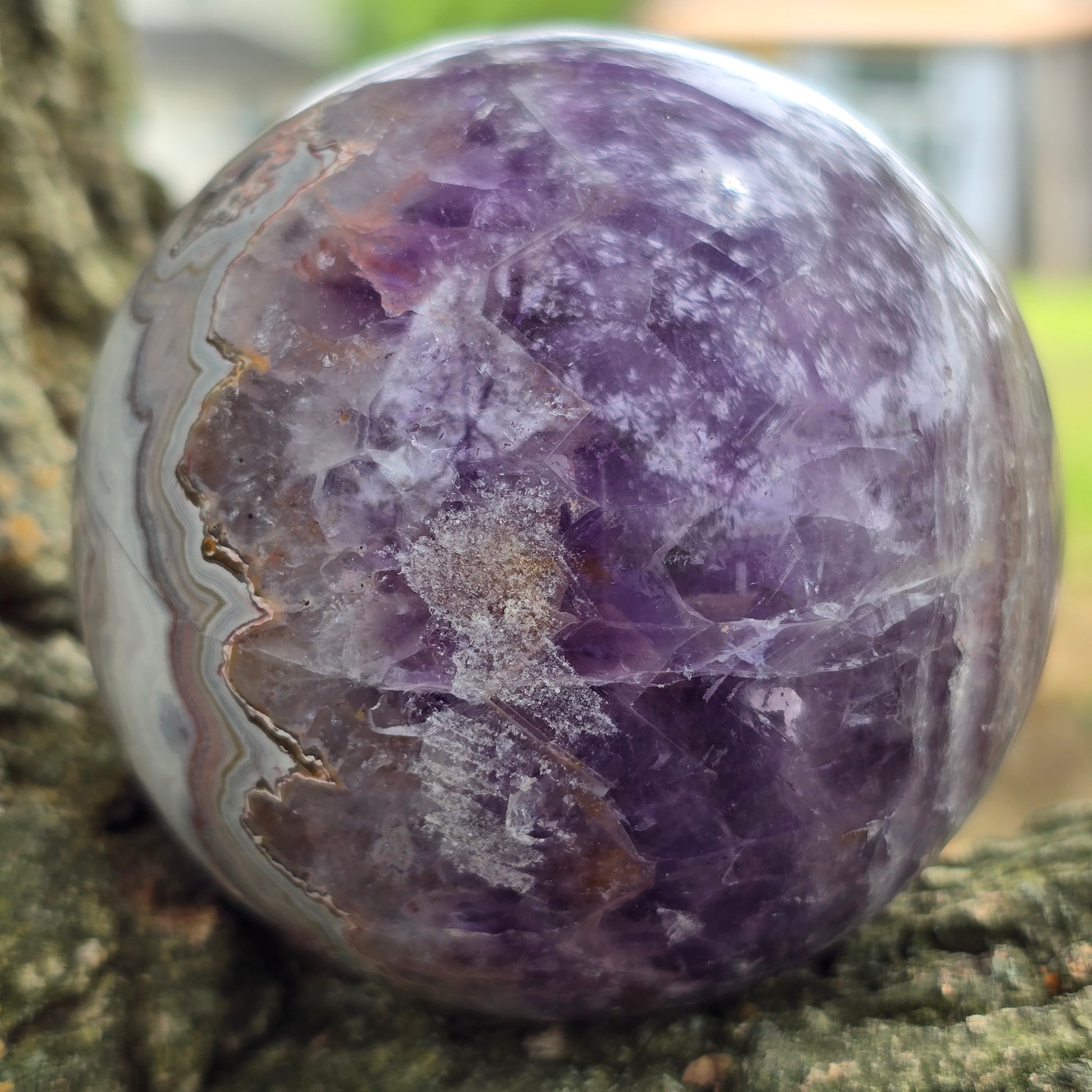 - Appearance: The sphere's surface may exhibit bands, swirls, or patterns typical of Agate formations, adding to its aesthetic appeal. Amethyst inclusions within the Agate matrix enhance its beauty.