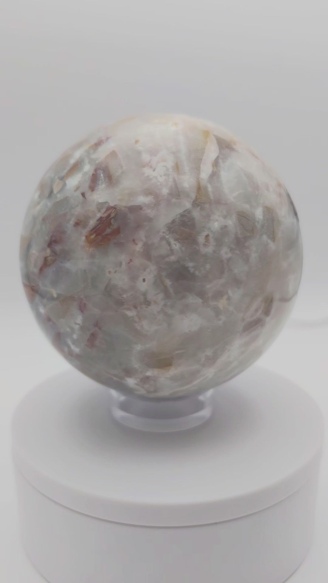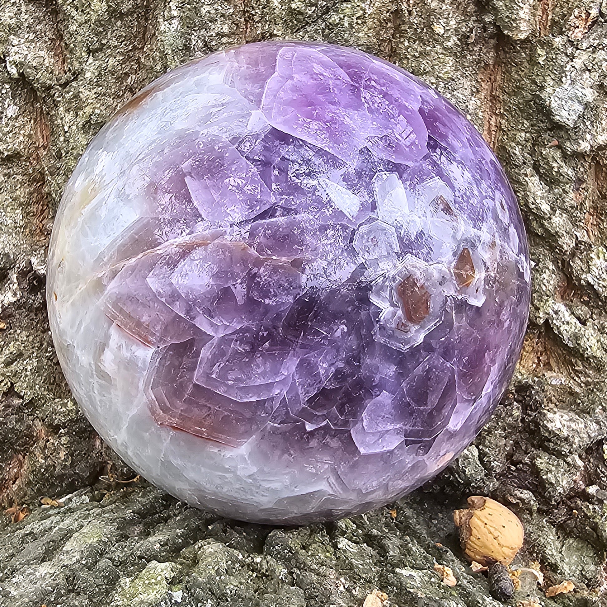 - Appearance: The sphere's surface may exhibit bands, swirls, or patterns typical of Agate formations, adding to its aesthetic appeal. Amethyst inclusions within the Agate matrix enhance its beauty.
