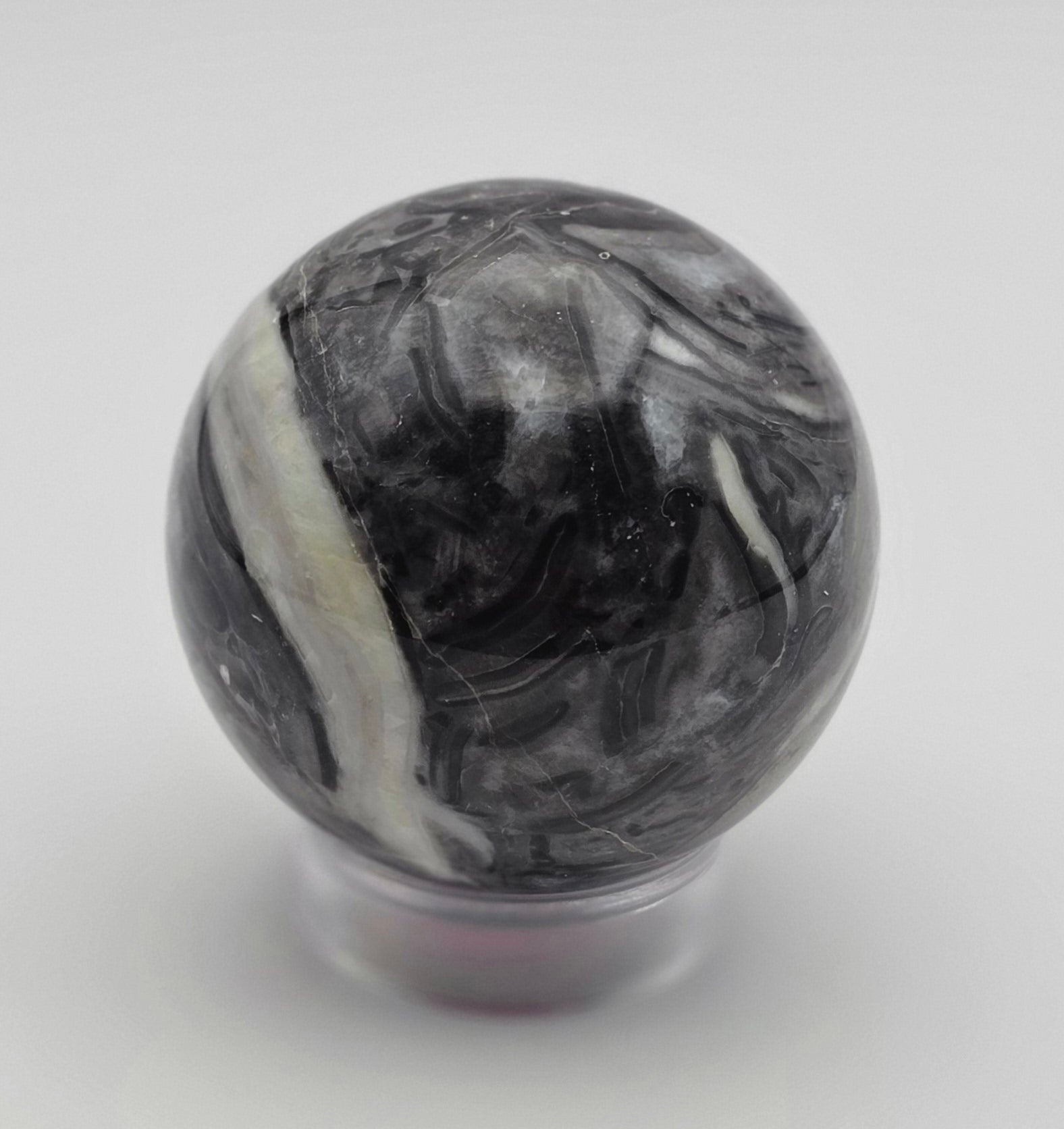 A Black Picasso sphere refers to a spherical object crafted from a variety of stone known as Black Picasso Jasper. Color: Black Picasso Jasper is characterized by its predominantly black color with intricate patterns, veins, or patches of contrasting colors such as gray, white, brown, or tan. These patterns often resemble brush strokes or abstract paintings, giving the stone its distinctive and artistic appearance. Texture: The surface of the Black Picasso Jasper sphere is typically smooth and polished, highlighting the stone's natural beauty and enhancing its tactile appeal. The polished surface may exhibit a glossy sheen, inviting touch and exploration.