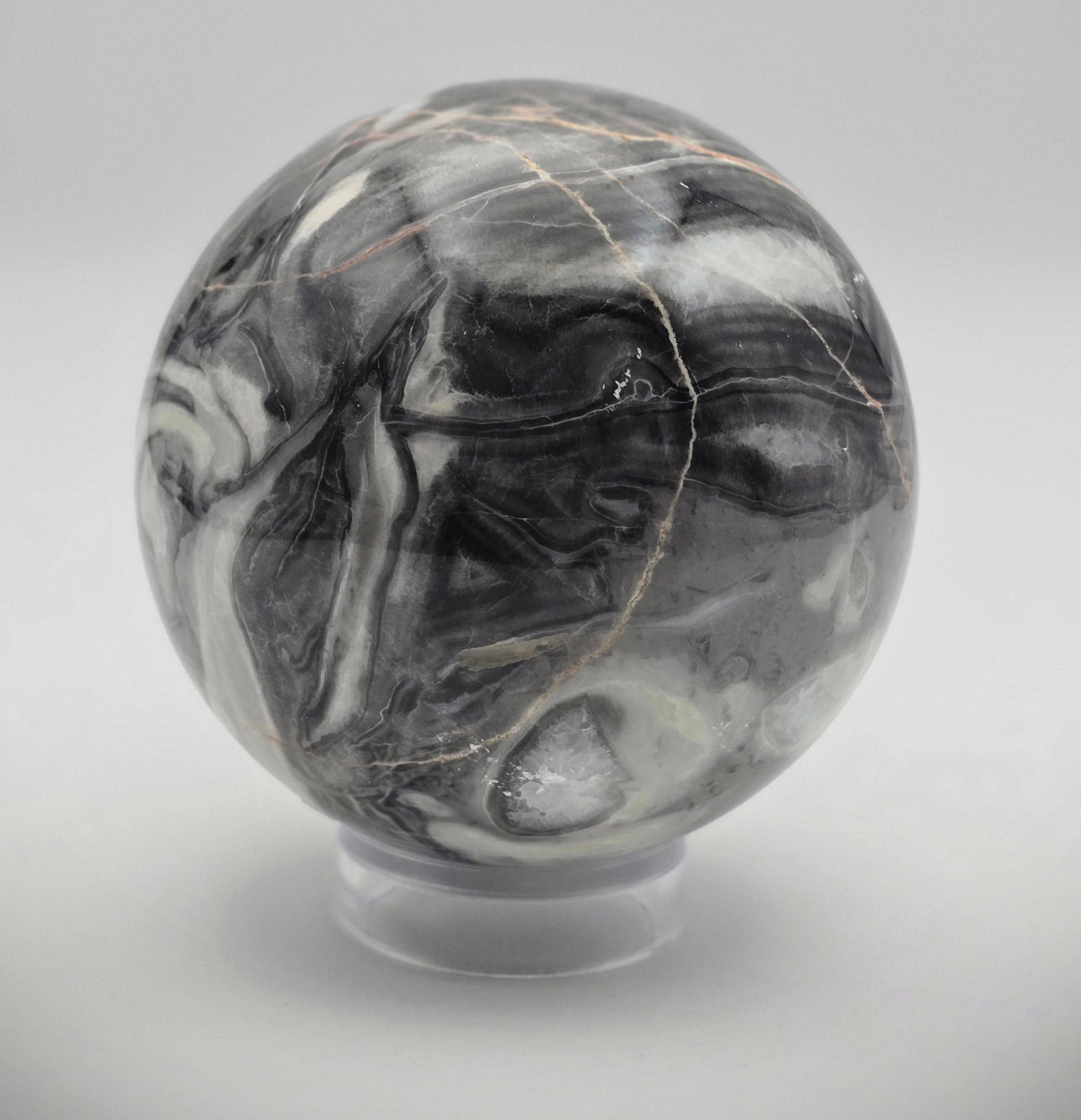 A Black Picasso sphere refers to a spherical object crafted from a variety of stone known as Black Picasso Jasper. Color: Black Picasso Jasper is characterized by its predominantly black color with intricate patterns, veins, or patches of contrasting colors such as gray, white, brown, or tan. These patterns often resemble brush strokes or abstract paintings, giving the stone its distinctive and artistic appearance. Texture: The surface of the Black Picasso Jasper sphere is typically smooth and polished, highlighting the stone's natural beauty and enhancing its tactile appeal. The polished surface may exhibit a glossy sheen, inviting touch and exploration.