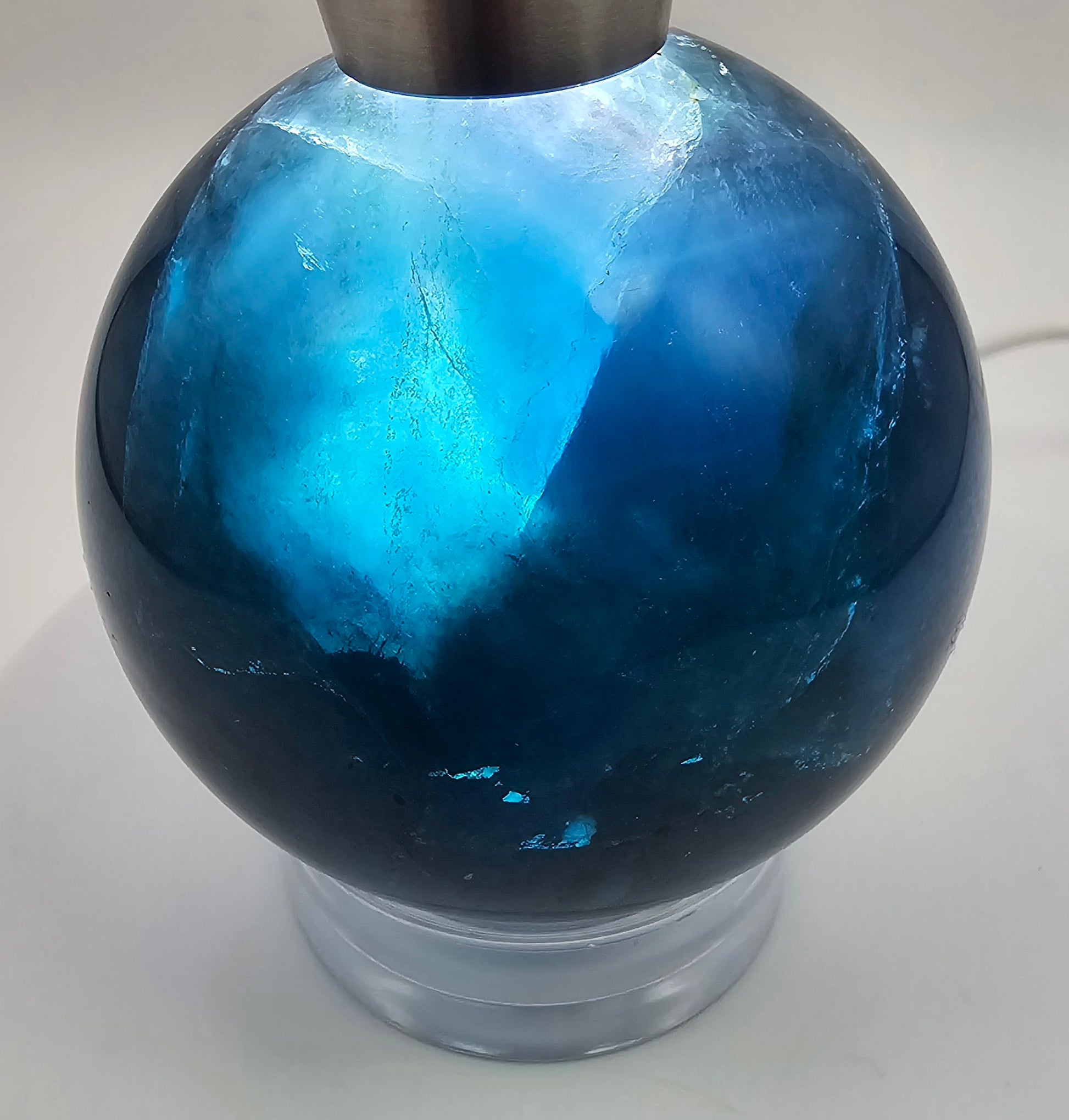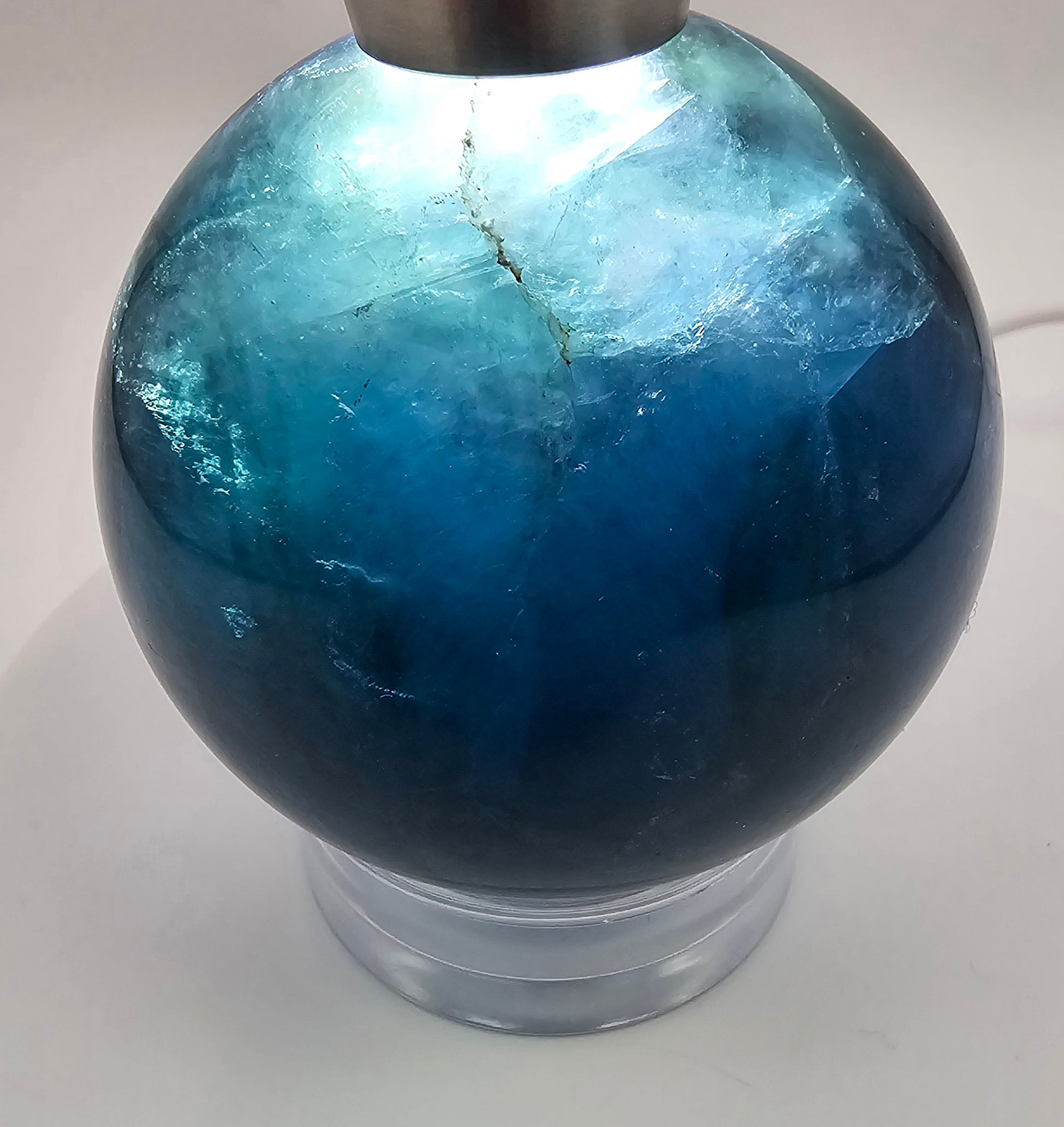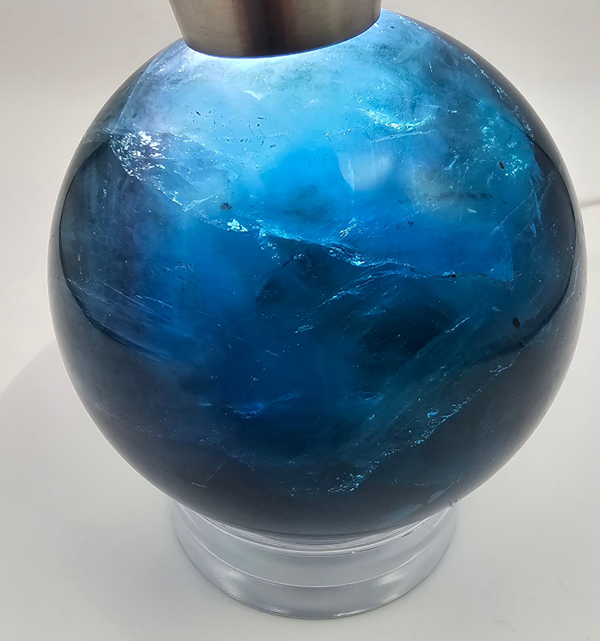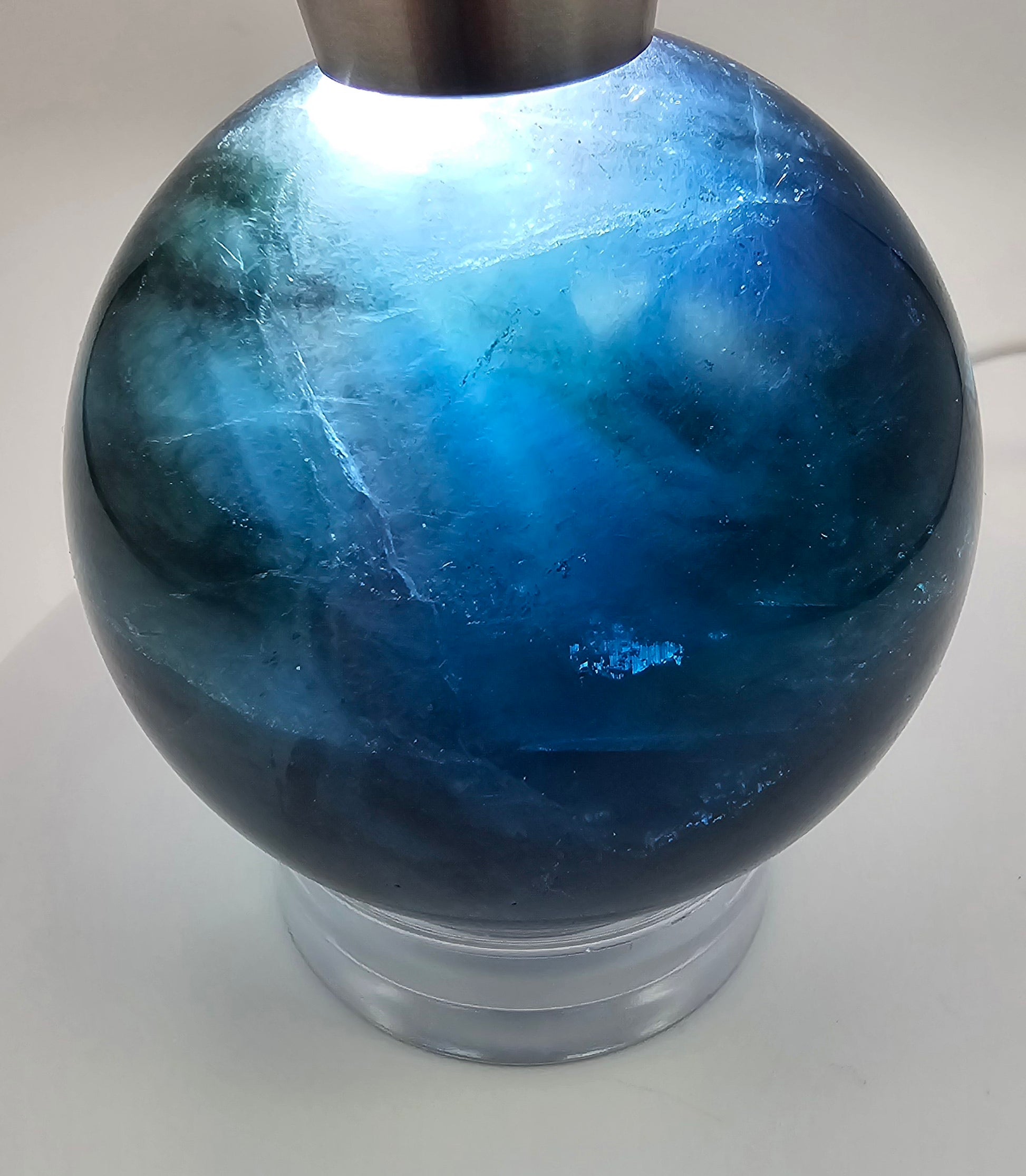 A blue fluorite sphere refers to a polished sphere-shaped crystal made from the mineral fluorite that exhibits blue coloration. Fluorite is a common mineral found in many parts of the world and comes in a variety of colors, including blue, purple, green, yellow, and clear.