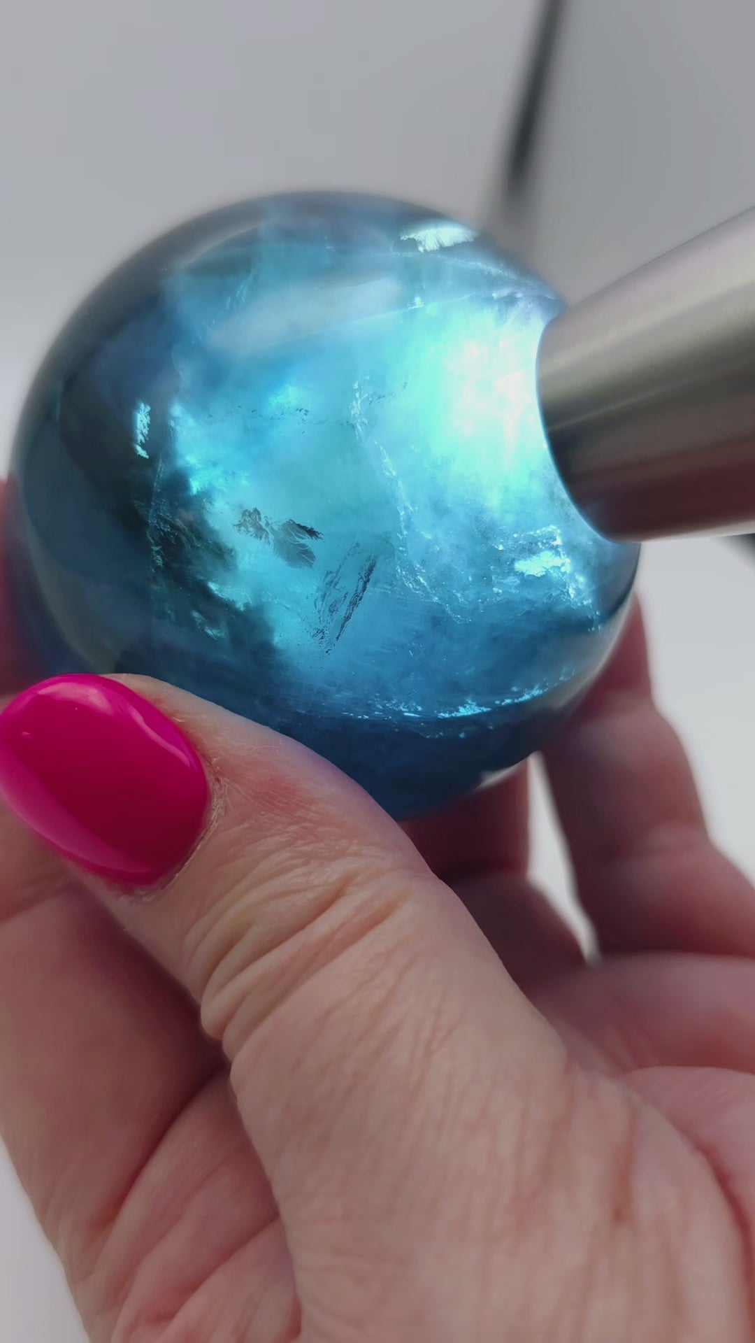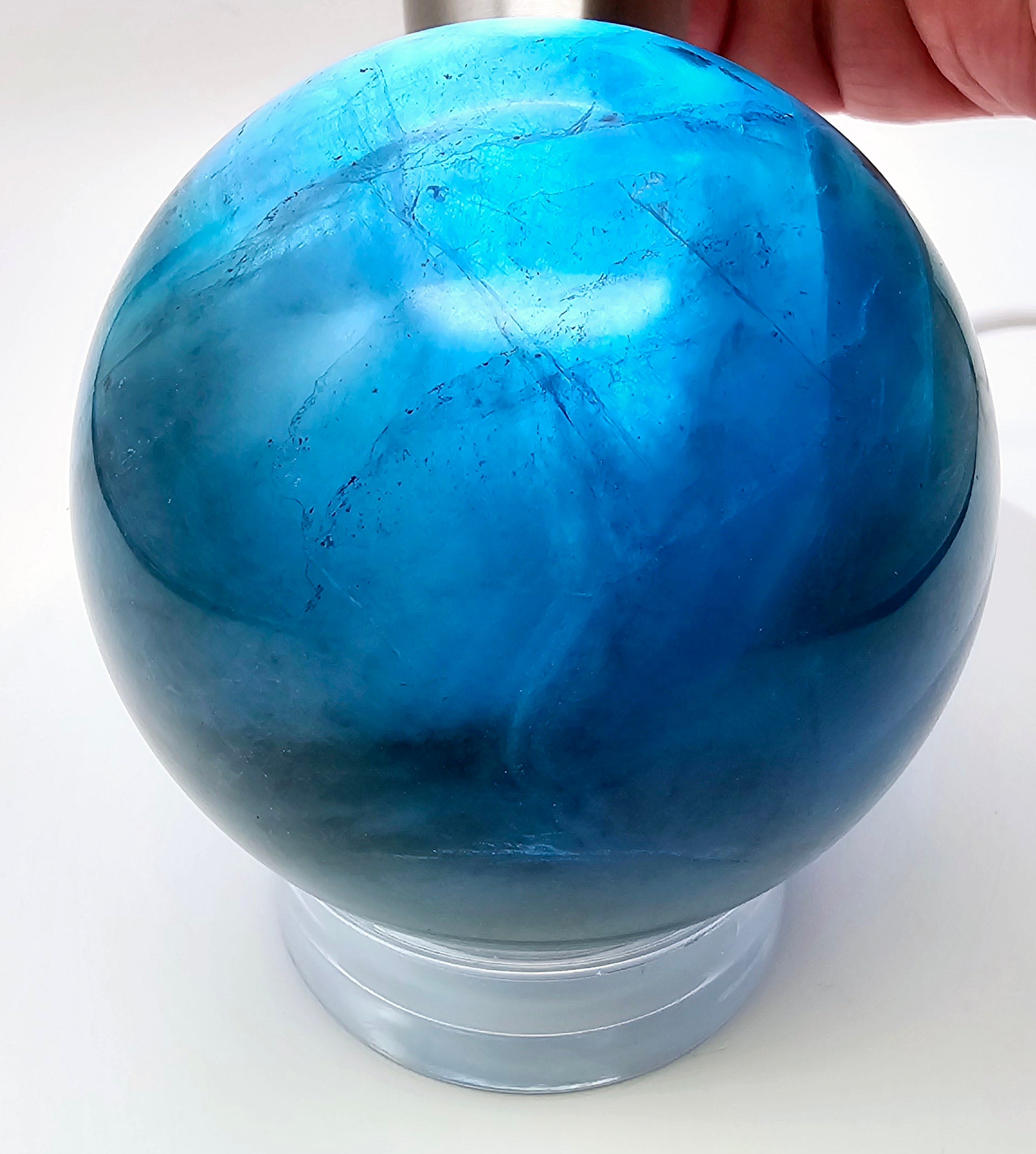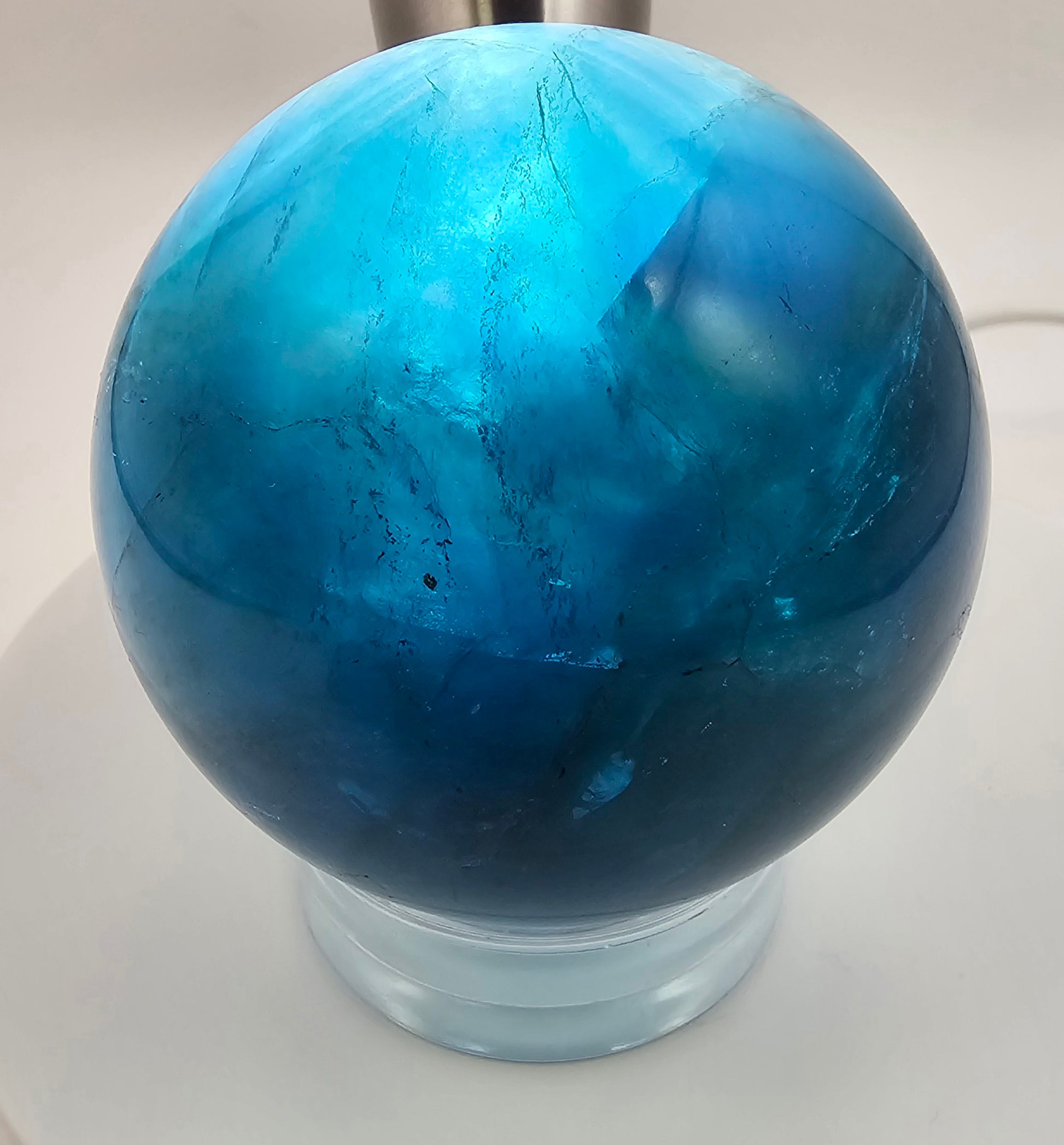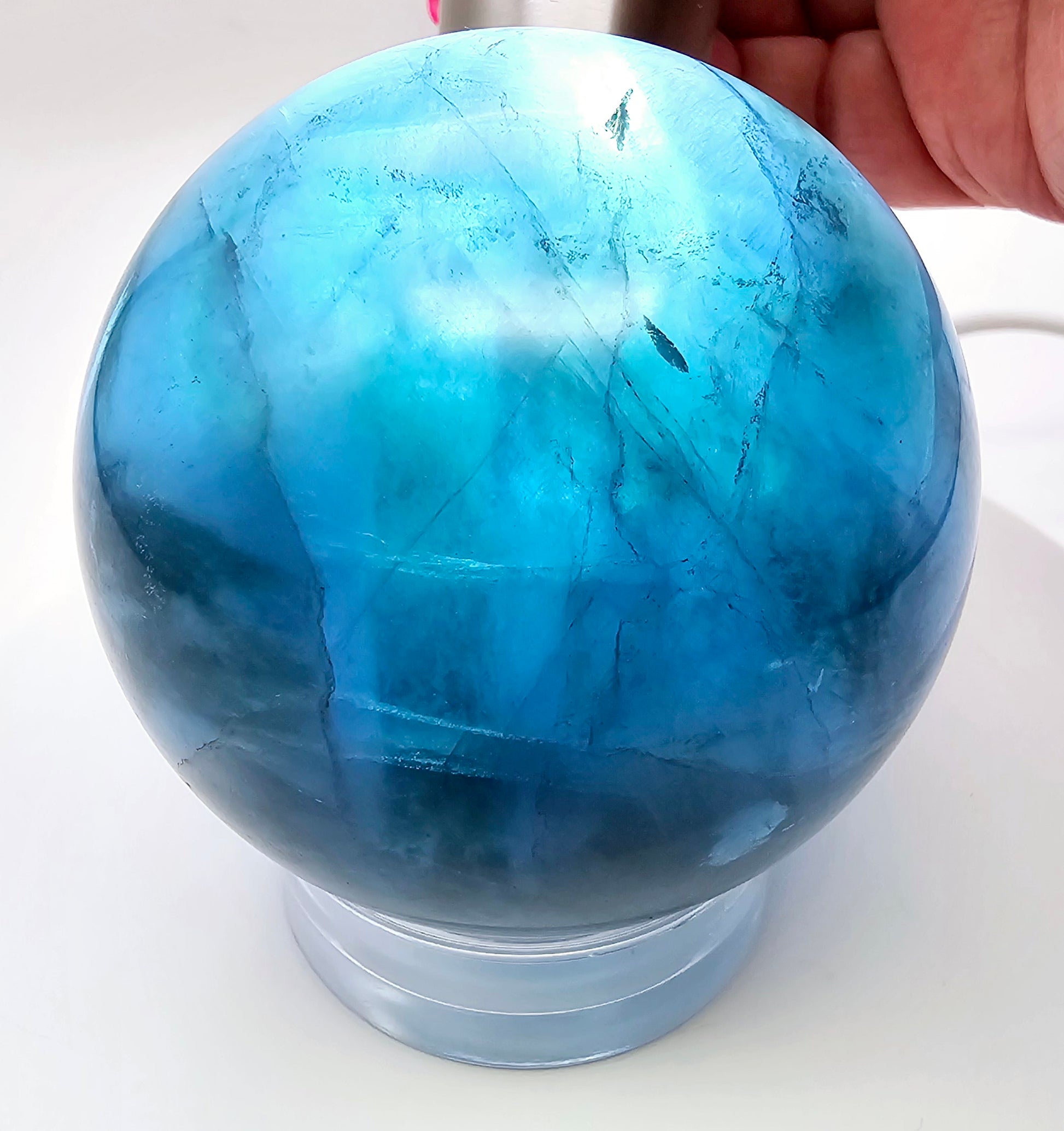 A blue fluorite sphere refers to a polished sphere-shaped crystal made from the mineral fluorite that exhibits blue coloration. Fluorite is a common mineral found in many parts of the world and comes in a variety of colors, including blue, purple, green, yellow, and clear.
