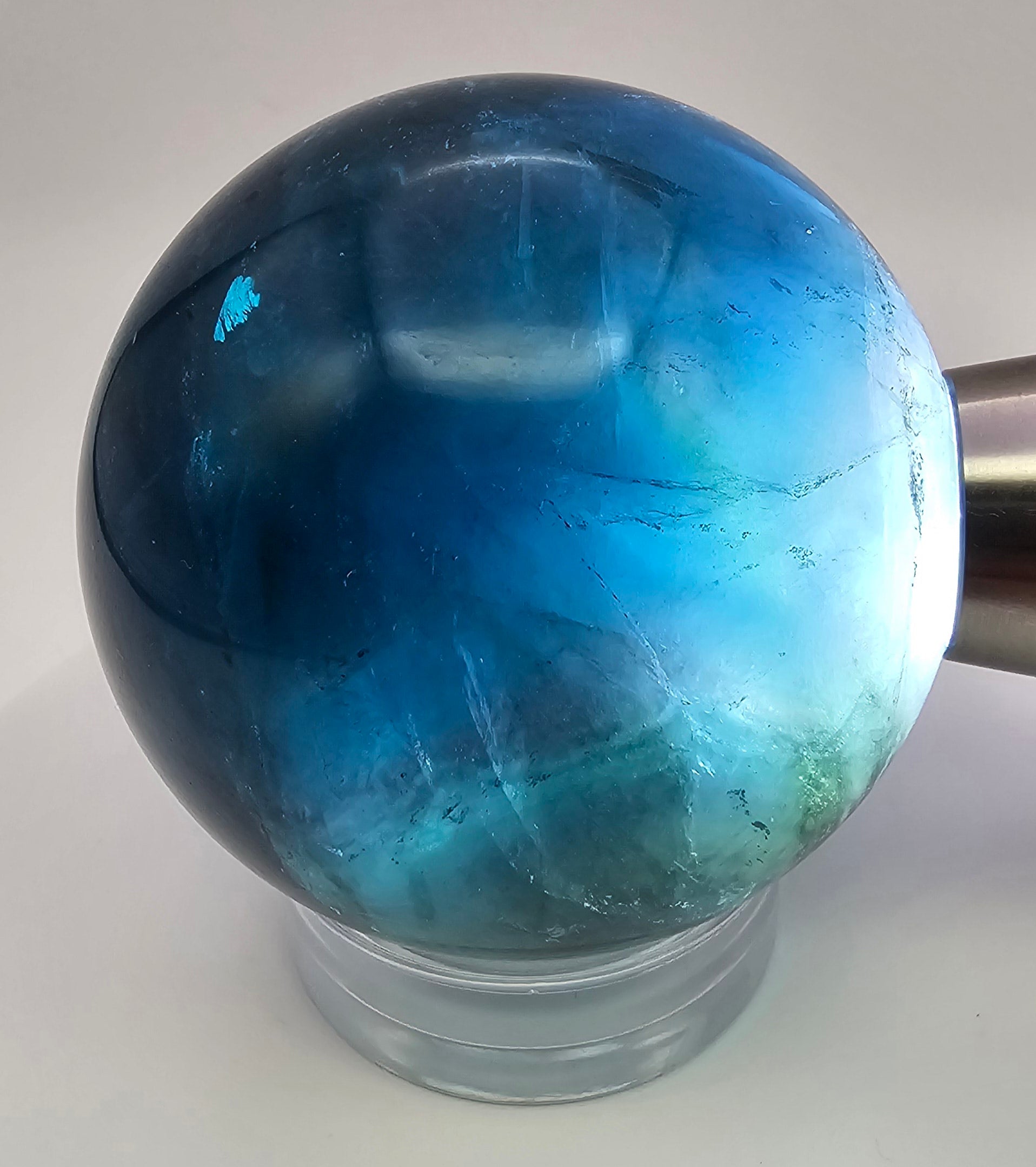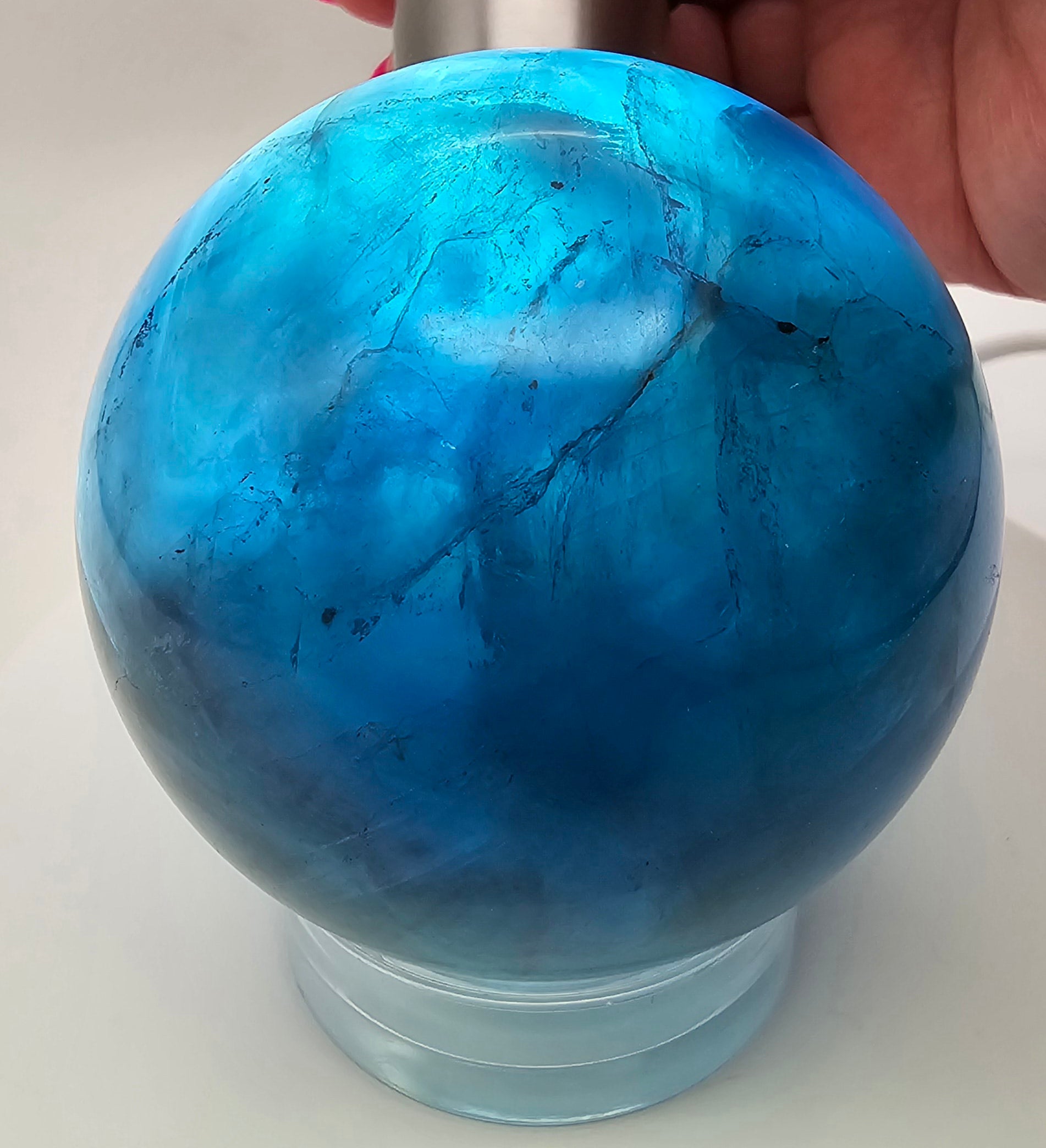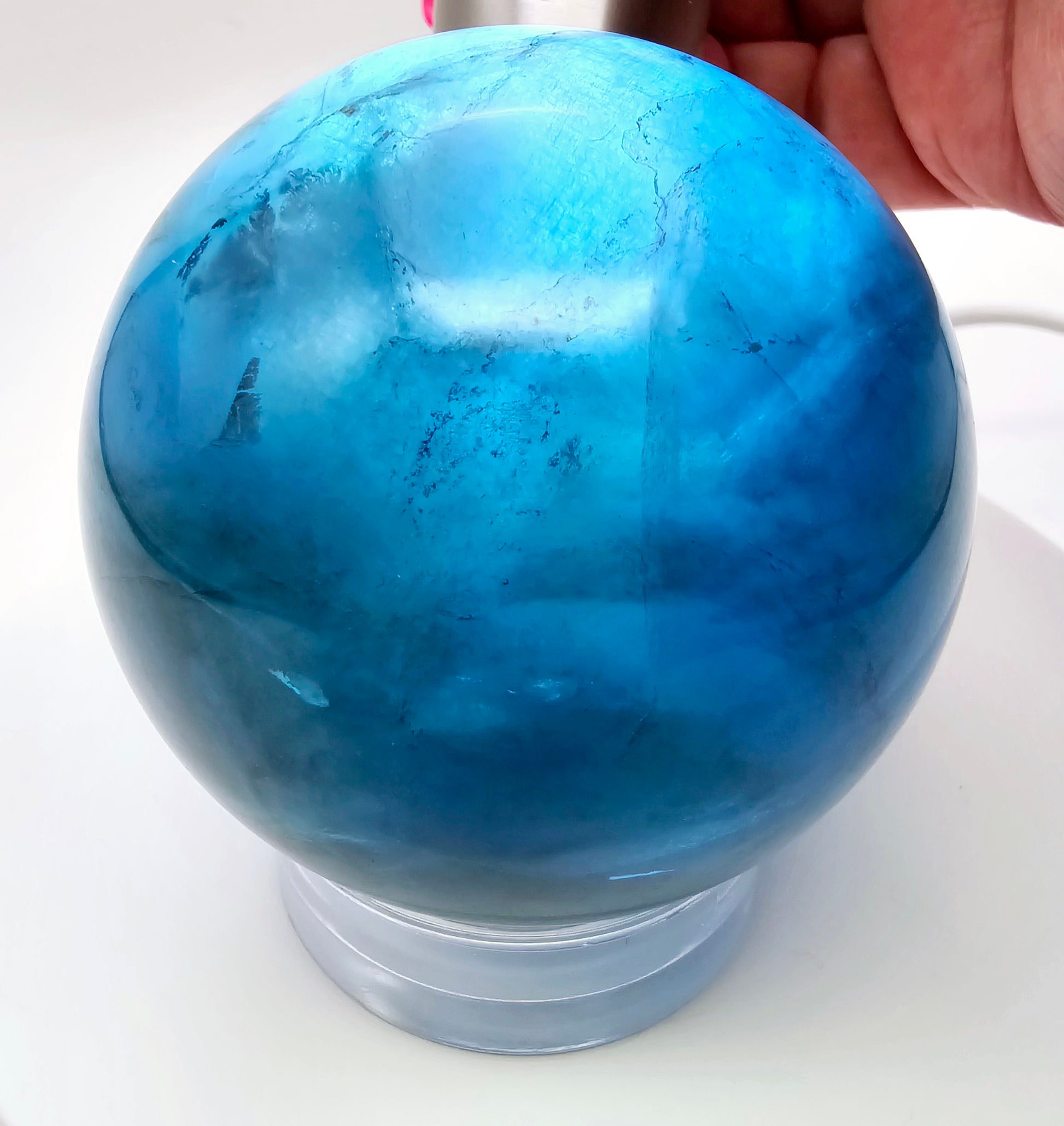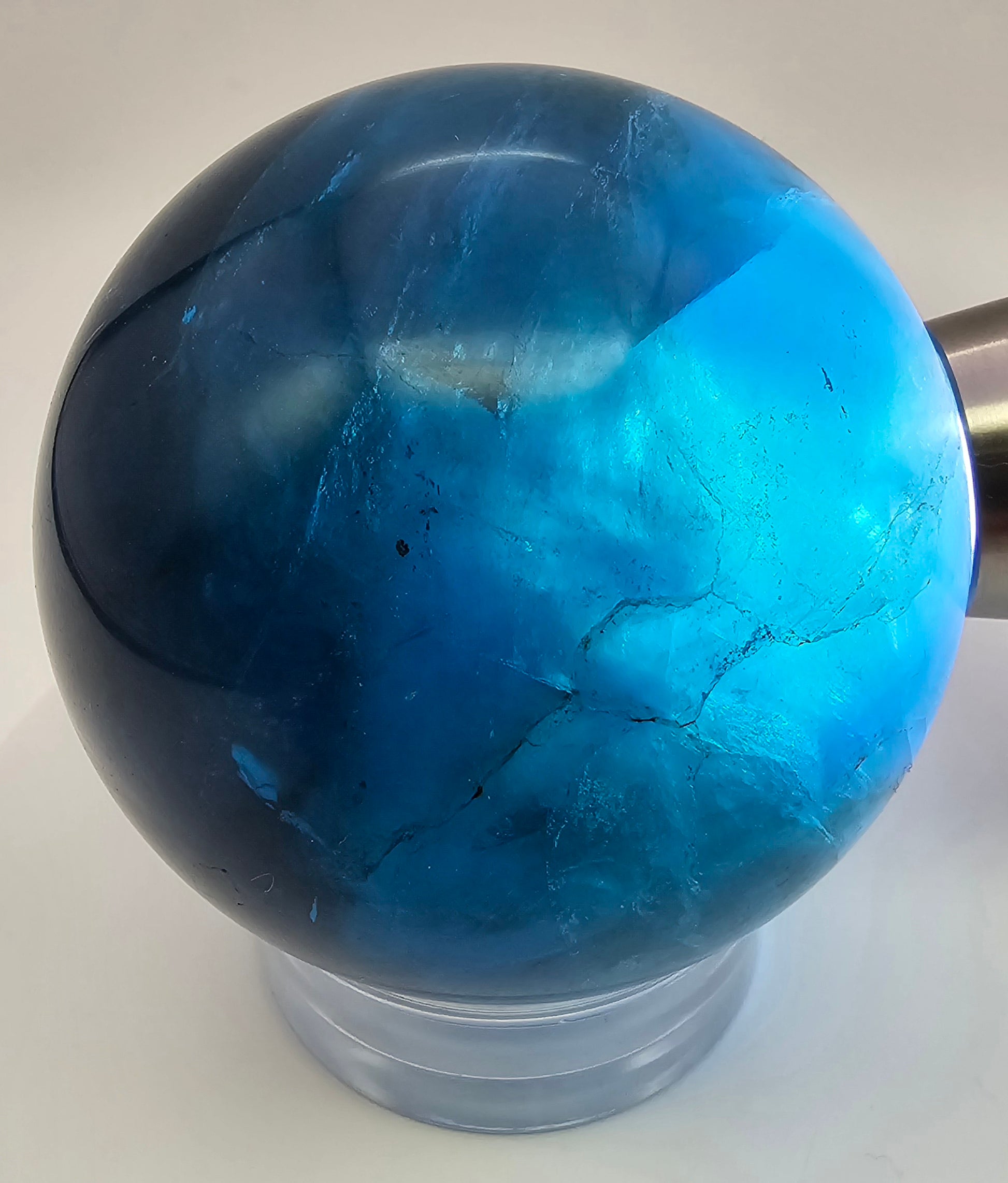 A blue fluorite sphere refers to a polished sphere-shaped crystal made from the mineral fluorite that exhibits blue coloration. Fluorite is a common mineral found in many parts of the world and comes in a variety of colors, including blue, purple, green, yellow, and clear.