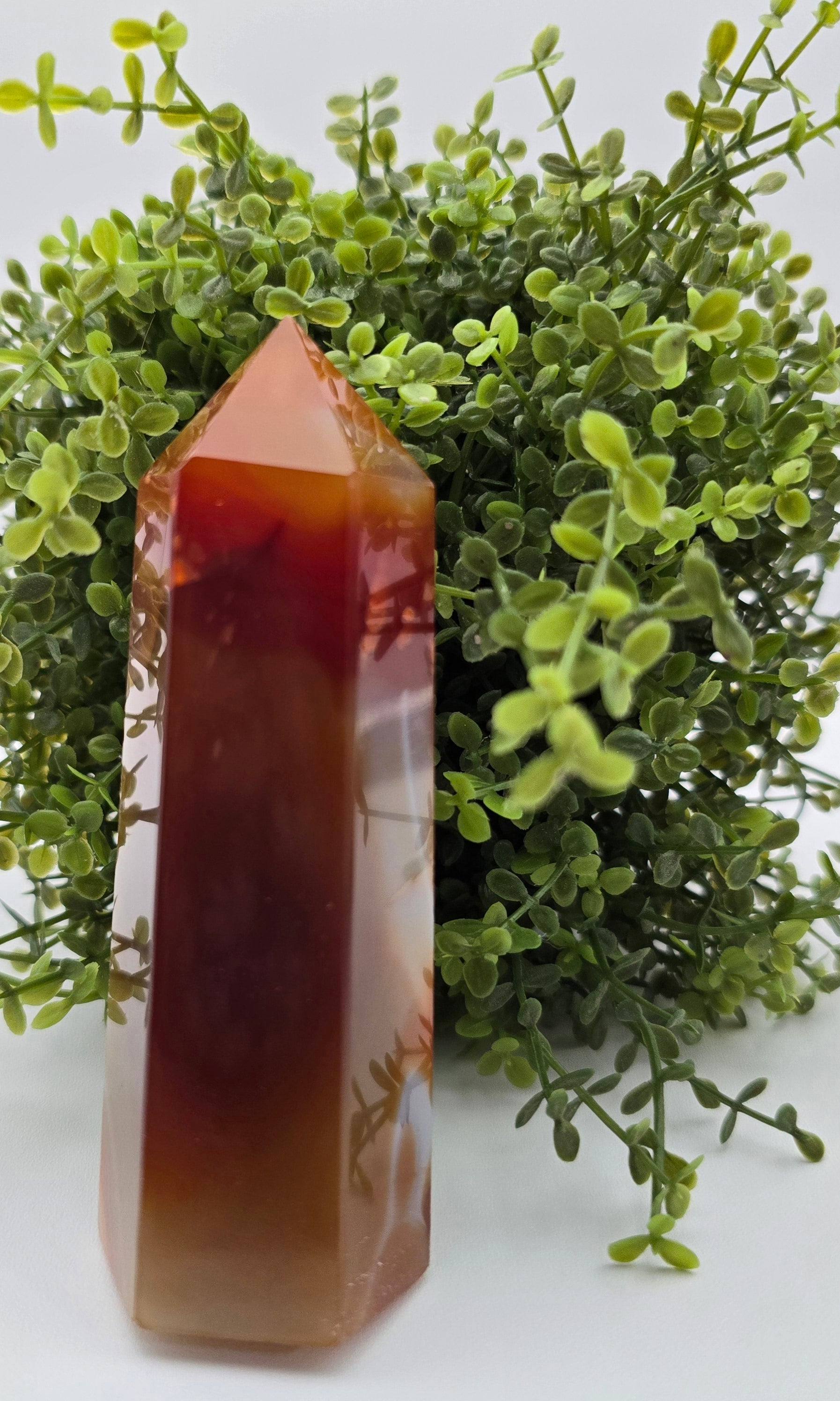 The Carnelian tower is a captivating gemstone structure that exudes warmth and vitality, offering a range of metaphysical benefits. Here's a detailed description along with its associated advantages: