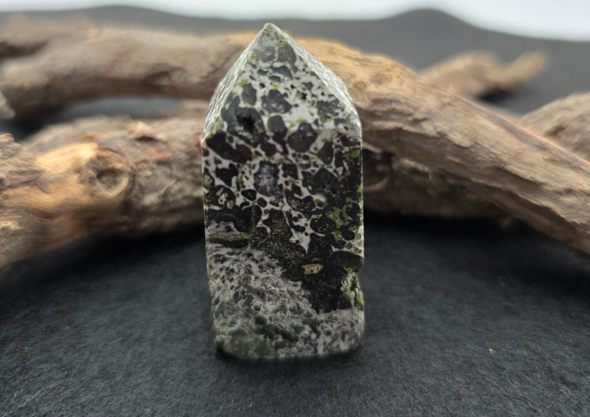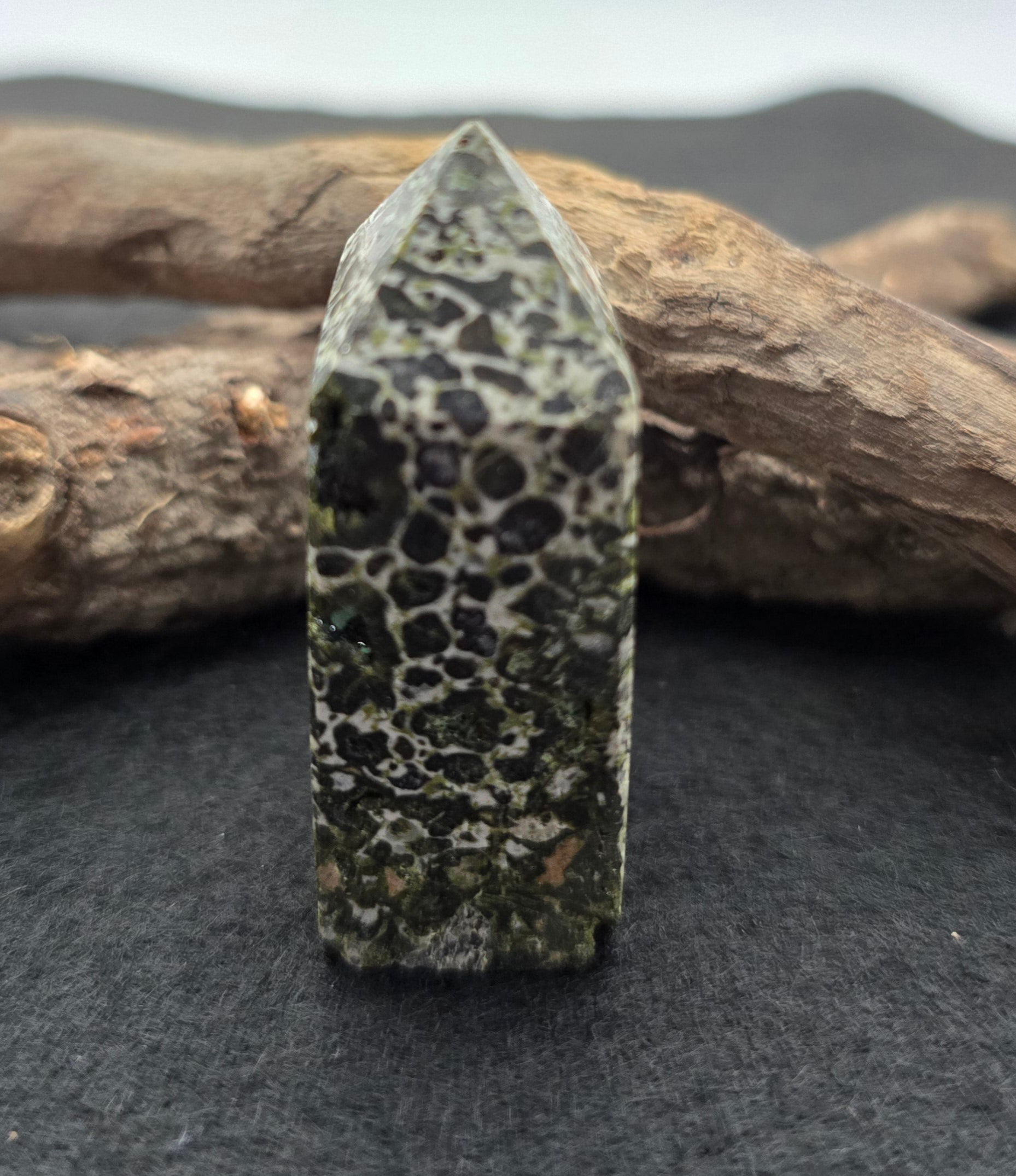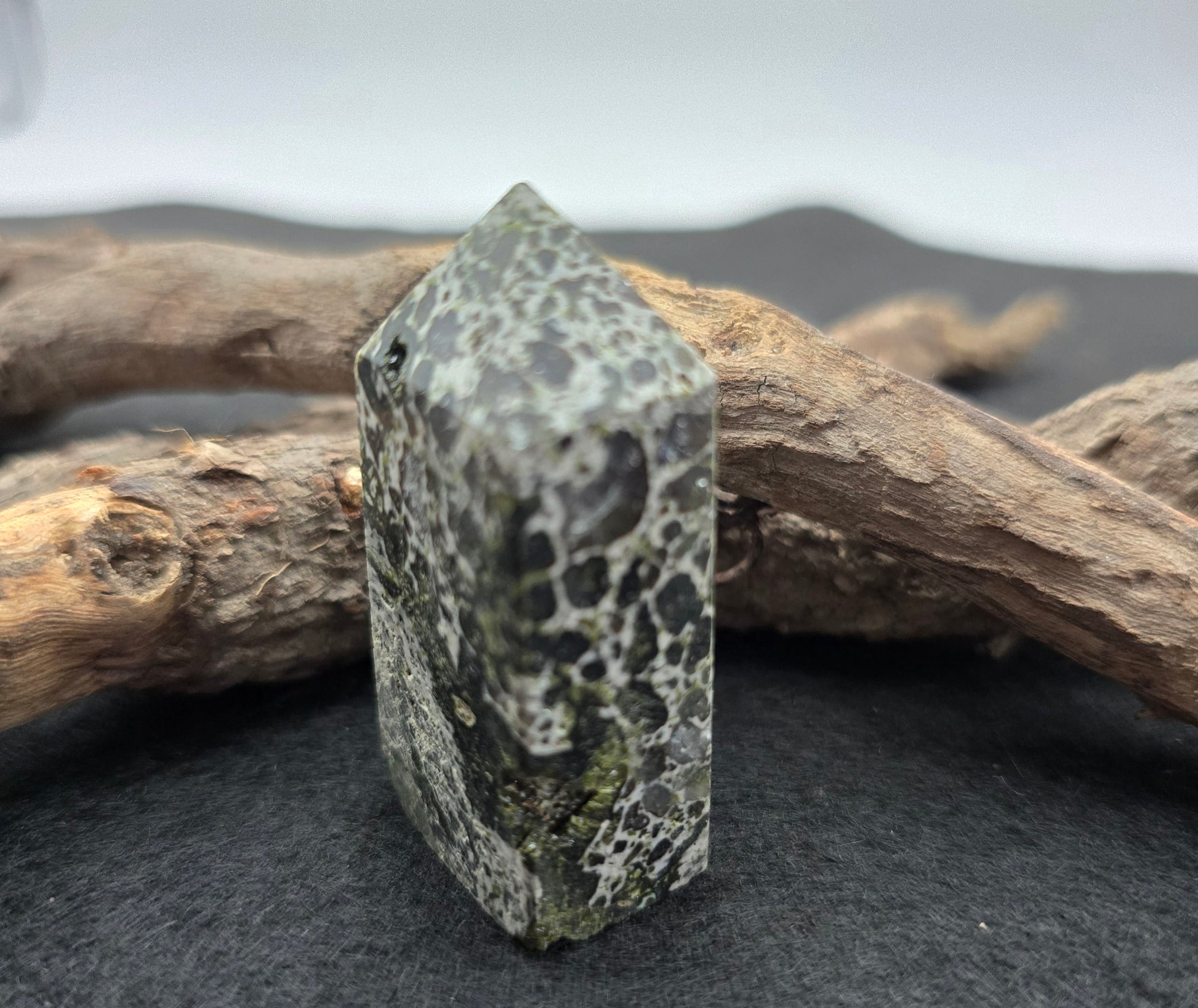 As light dances across the surface of the Chrysocolla and Copper tower, it reveals intricate patterns and formations within the stone, reminiscent of rippling waves and swirling currents. These natural motifs add depth and character to the tower, inviting contemplation and reflection on the interconnectedness of all things.