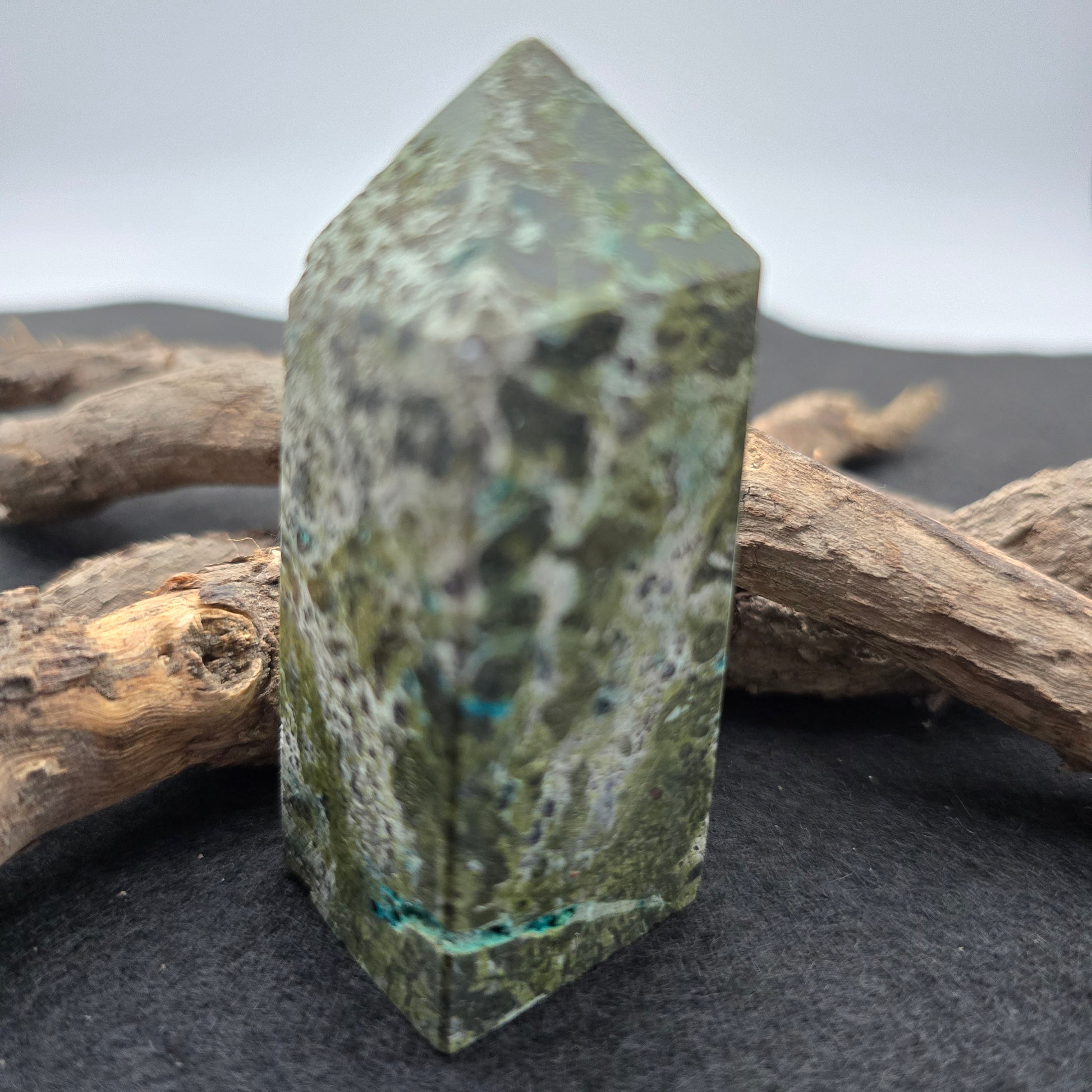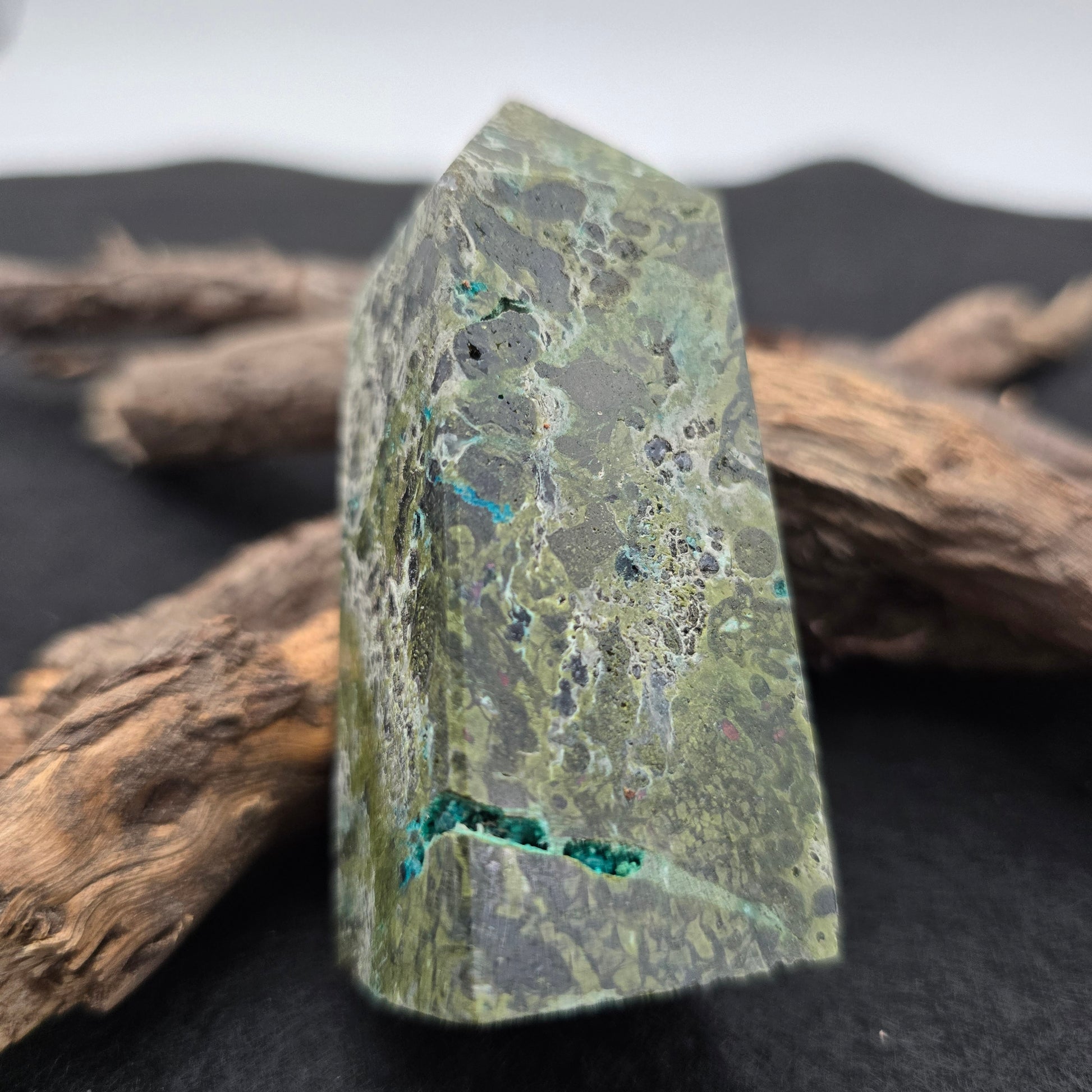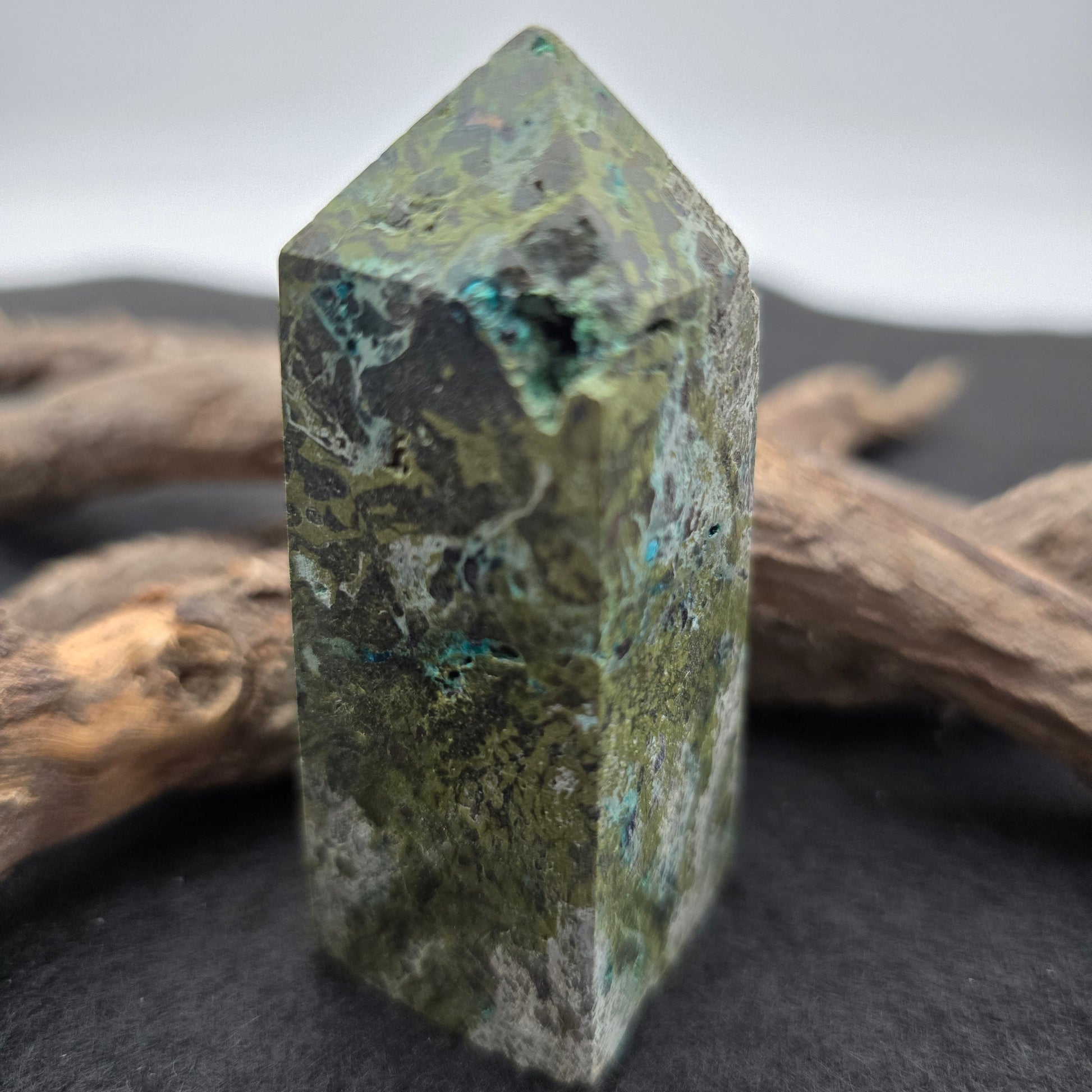 As light dances across the surface of the Chrysocolla and Copper tower, it reveals intricate patterns and formations within the stone, reminiscent of rippling waves and swirling currents. These natural motifs add depth and character to the tower, inviting contemplation and reflection on the interconnectedness of all things.
