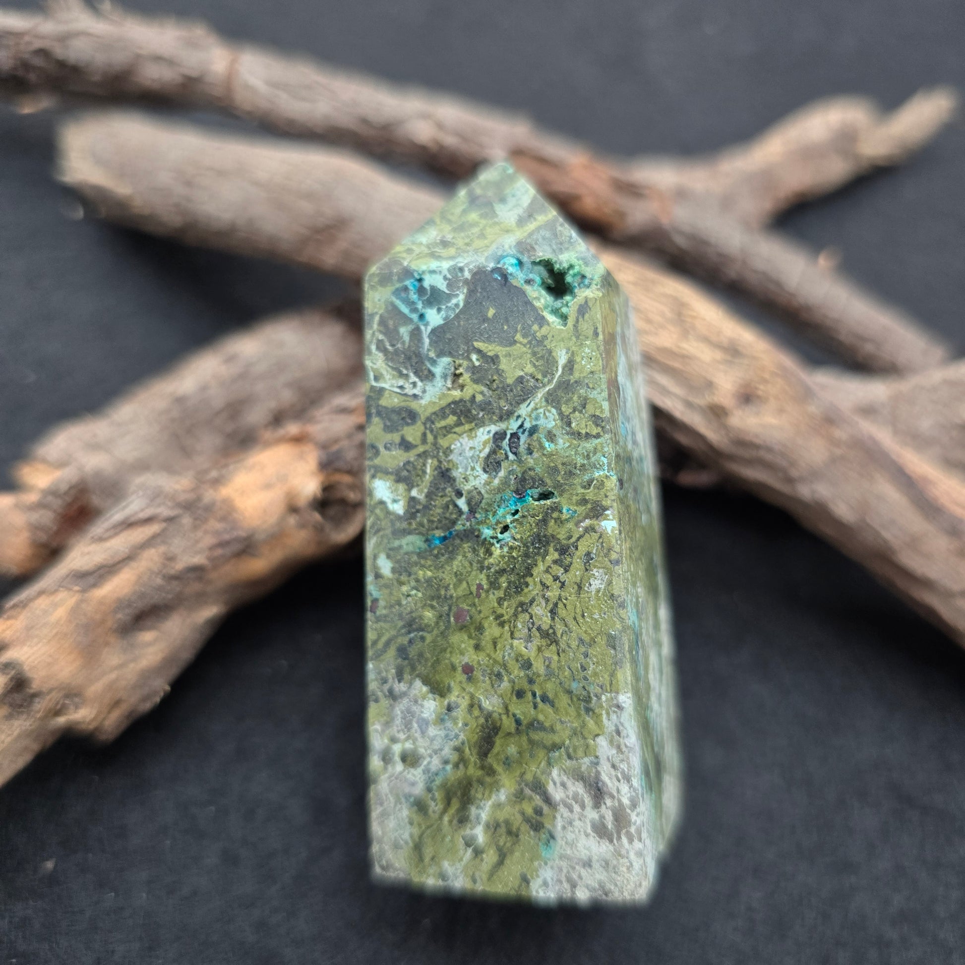 Standing as a testament to the harmonious fusion of earth's elements, the Chrysocolla and Copper tower emanates a tranquil yet vibrant energy. Its surface glows with the mesmerizing hues of Chrysocolla, ranging from serene blues and greens to subtle hints of turquoise and teal. Intertwined with the Chrysocolla are veins of shimmering Copper, adding a warm, metallic luster to the tower's appearance.