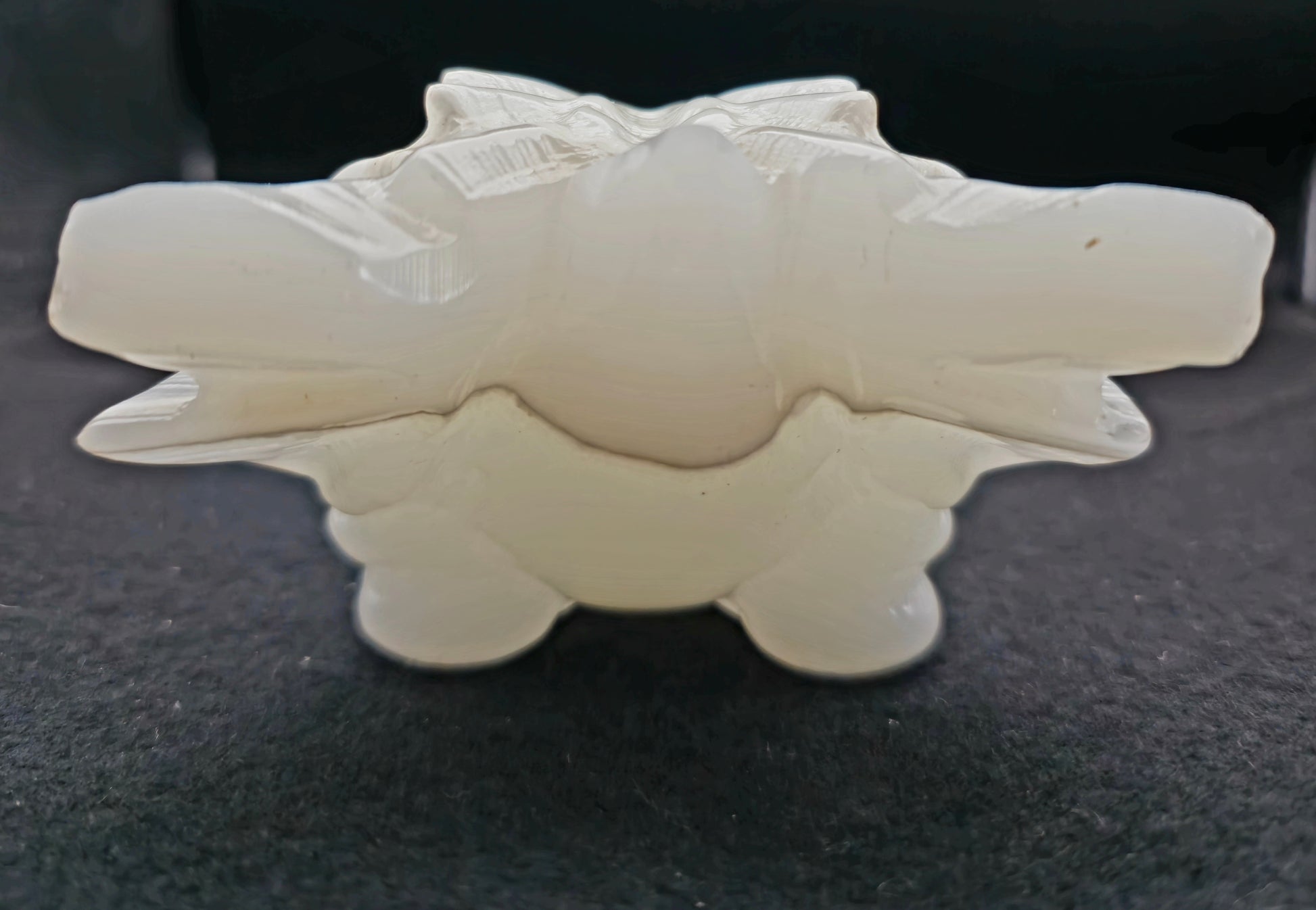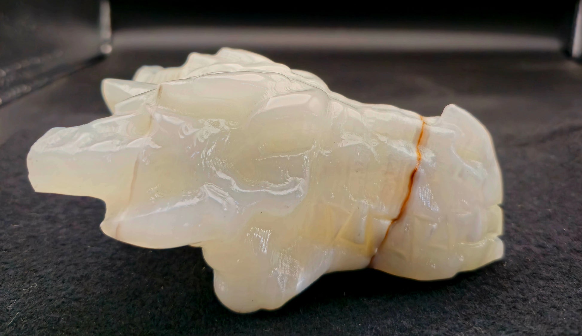 - Color: The dragon head is predominantly black, featuring the deep, glossy tones characteristic of Onyx. Depending on the specific piece of Onyx used, it may also include bands or veins of white or other colors, adding depth and visual interest.
