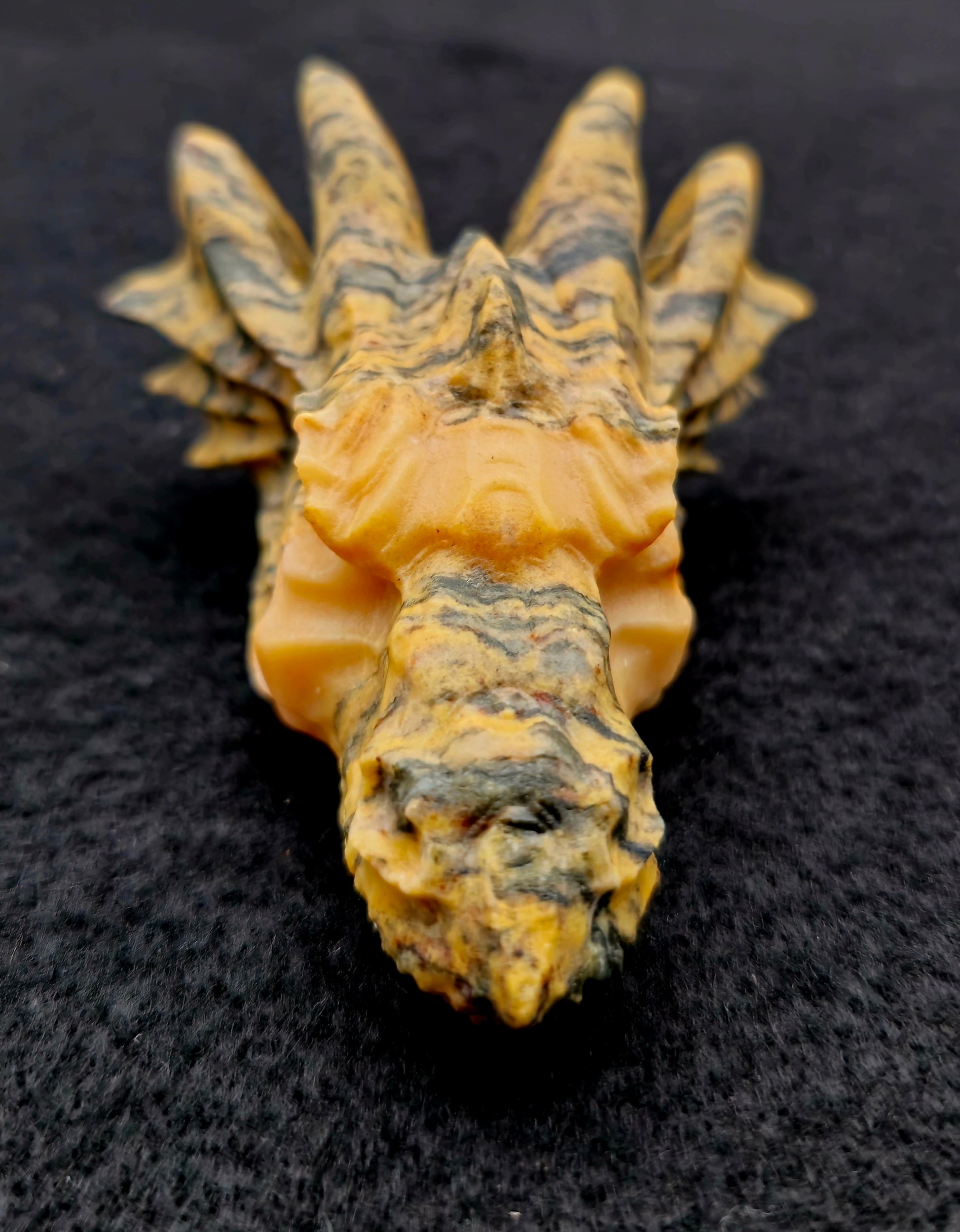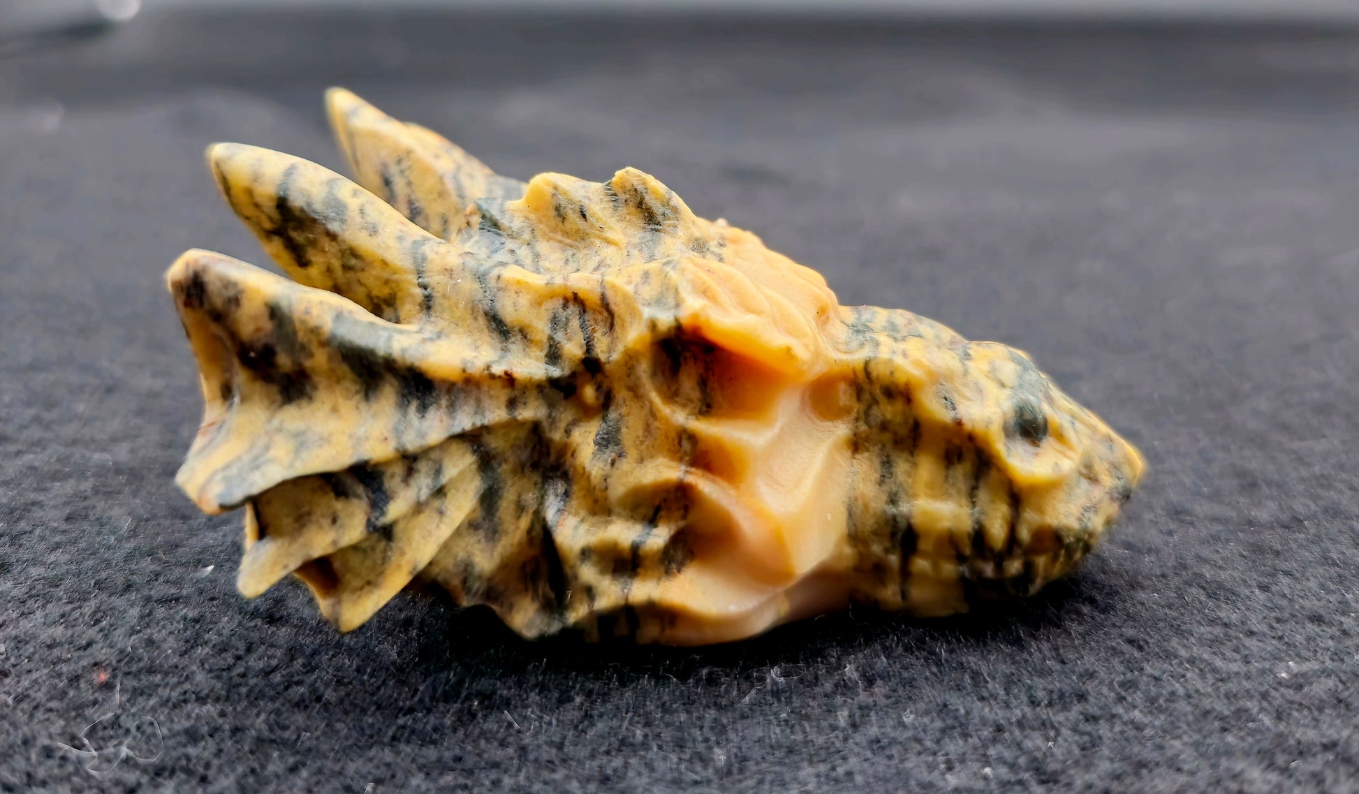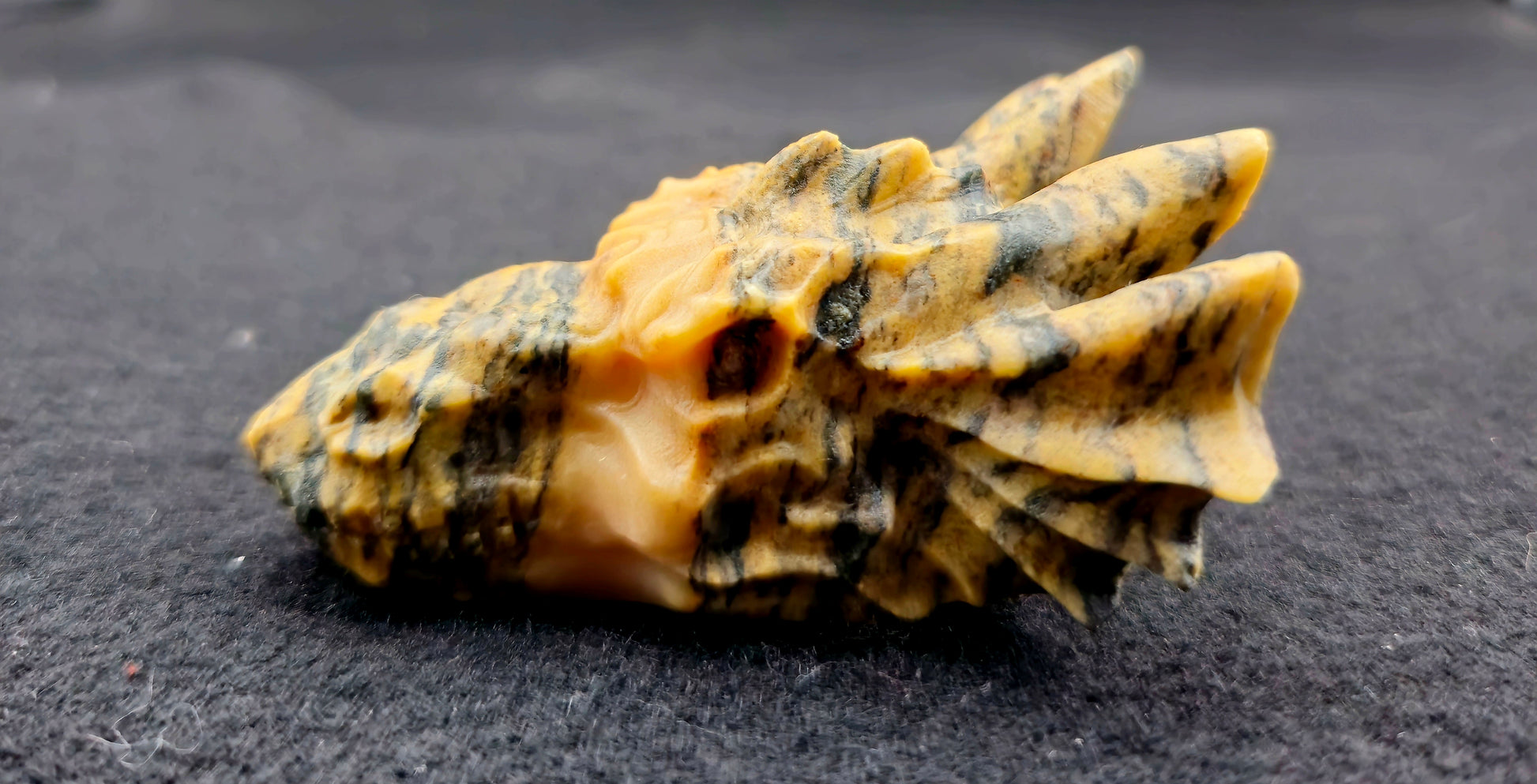 Overall, a dragon head made from Tiger Skin Jasper stone is a captivating piece that melds natural beauty with artistic mastery, creating an object of both aesthetic and symbolic significance. The unique patterns and colors of the jasper add an extra layer of intrigue and allure to the mythical dragon imagery.