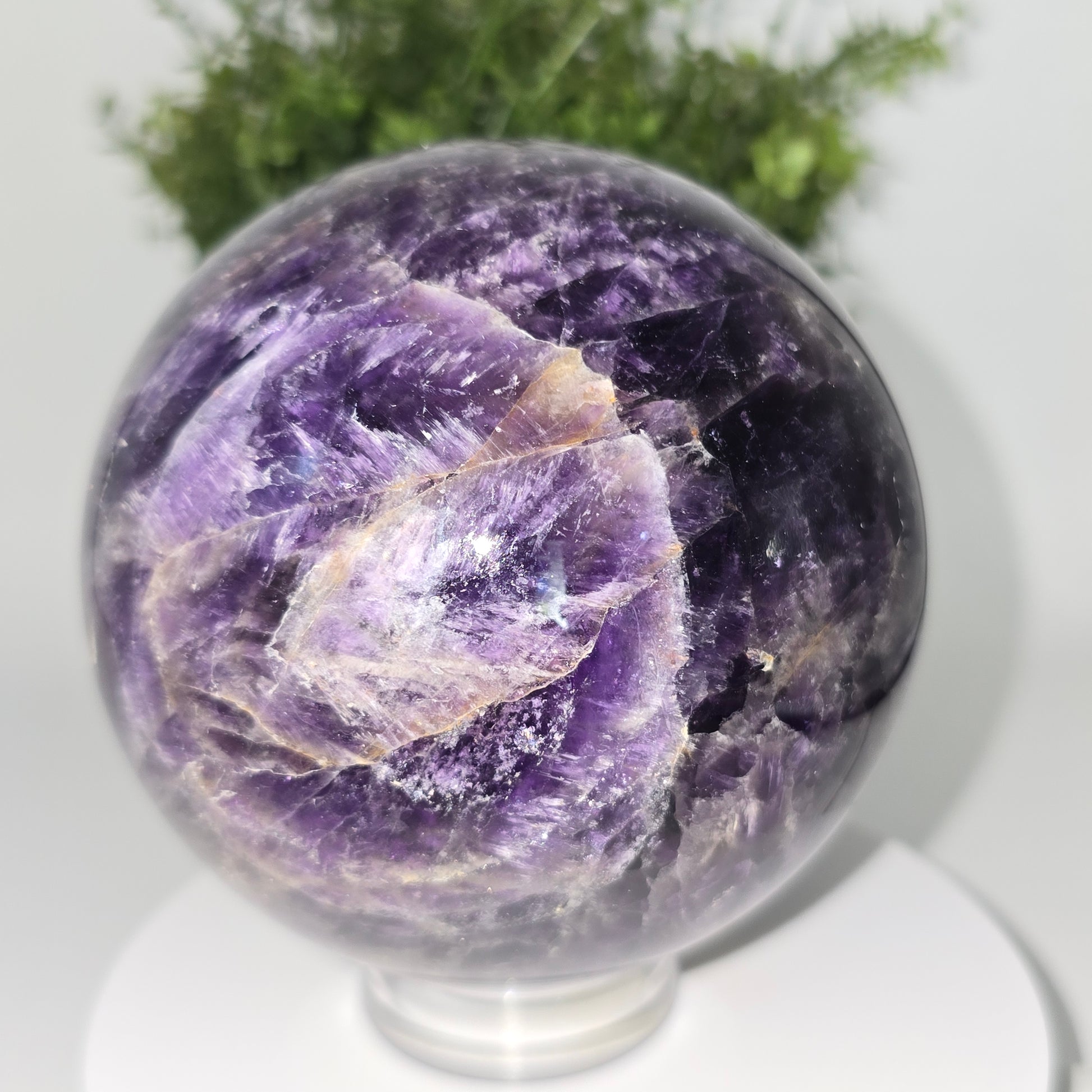 Appearance Material: Dream Amethyst, also known as Chevron Amethyst, is a unique variety of amethyst characterized by its distinctive banded patterns. Color: The sphere showcases a stunning combination of purple and white or lavender hues, forming chevron-like patterns that give the stone its name. Shape: The stone is polished into a perfect sphere, which enhances its natural beauty and allows the patterns to be viewed from all angles. Size: Sizes vary, but common diameters range from 2 to 4 inches (5 to 10 cm), with larger spheres being available as well. Finish: The sphere is polished to a smooth, glossy finish, enhancing the vibrancy of the colors and patterns.