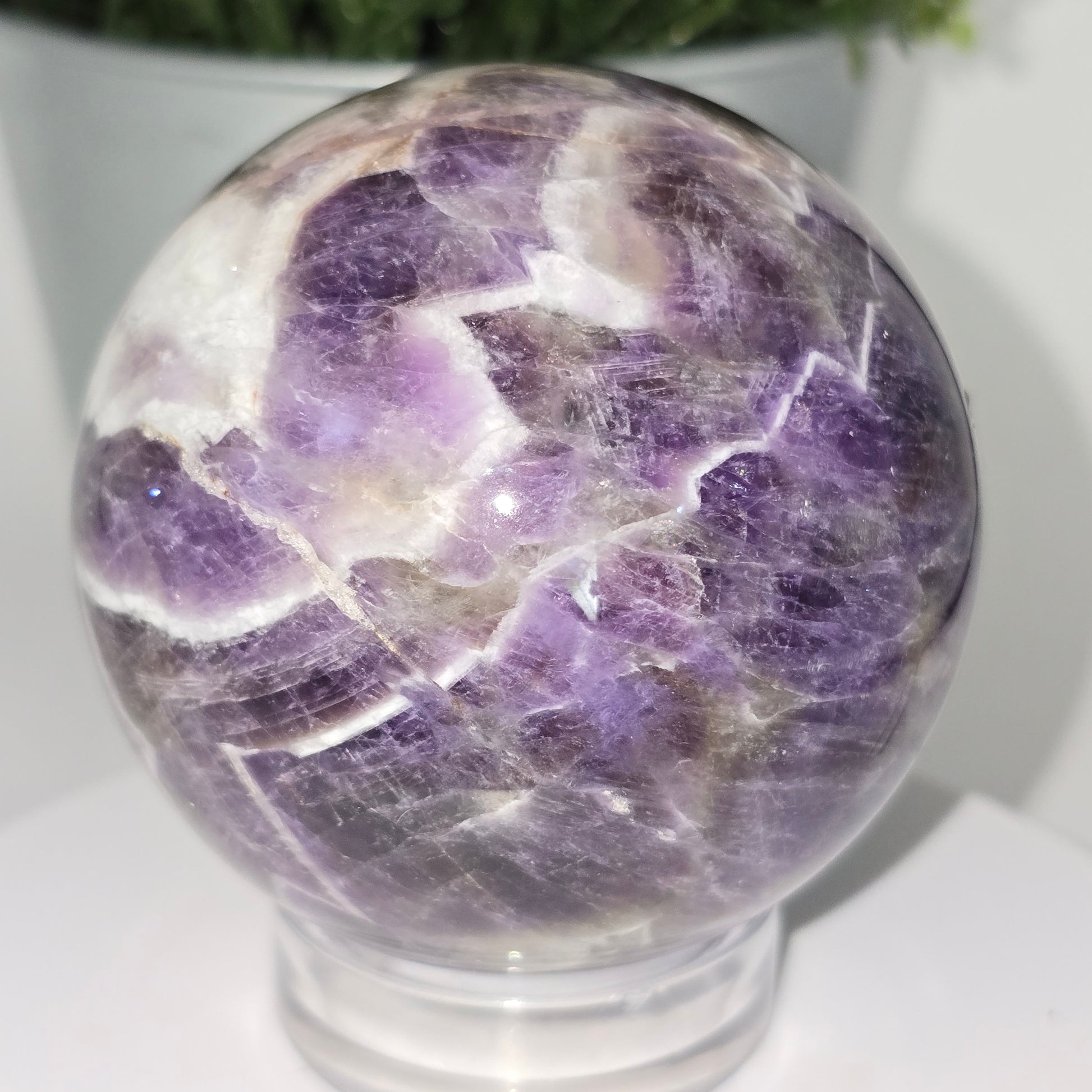 Appearance Material: Dream Amethyst, also known as Chevron Amethyst, is a unique variety of amethyst characterized by its distinctive banded patterns. Color: The sphere showcases a stunning combination of purple and white or lavender hues, forming chevron-like patterns that give the stone its name. Shape: The stone is polished into a perfect sphere, which enhances its natural beauty and allows the patterns to be viewed from all angles. Size: Sizes vary, but common diameters range from 2 to 4 inches (5 to 10 cm), with larger spheres being available as well. Finish: The sphere is polished to a smooth, glossy finish, enhancing the vibrancy of the colors and patterns.
