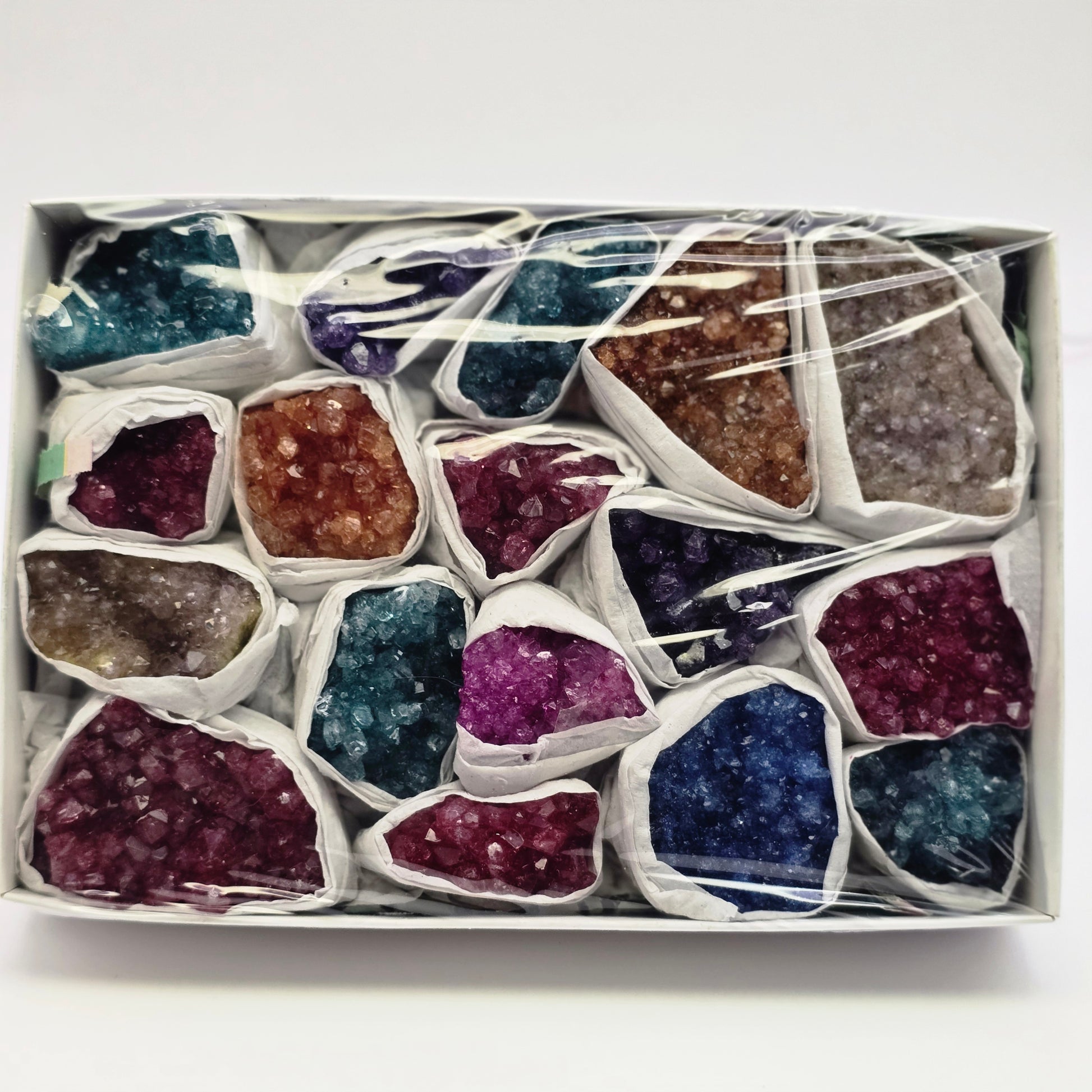 Our flat contains 17 beautifully dyed amethyst crystal for your collection. The crystals range from .75"-1.5" in length.