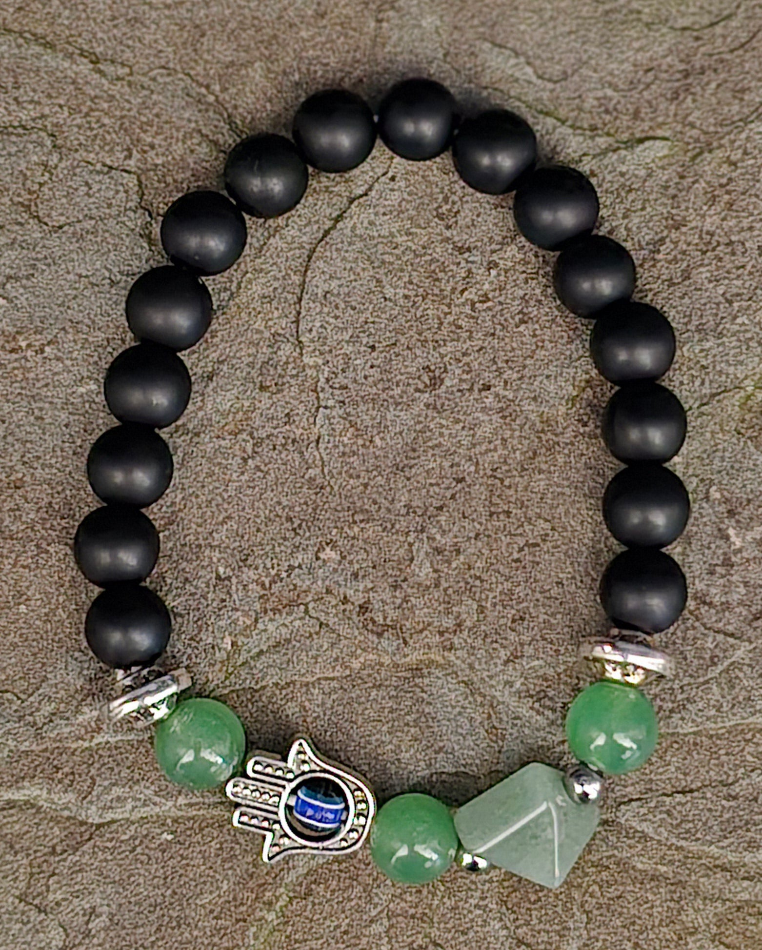 Symbolic Meaning: The Green Strawberry Evil Eye Hamsa Hand Bracelet carries several symbolic meanings: Love and Balance: Green Strawberry Quartz is associated with love, compassion, and emotional balance, fostering harmony in relationships and inner peace. Protection: The Hamsa Hand and Evil Eye symbolize protection from negative energies and malicious intentions, creating a shield of spiritual defense around the wearer. Blessings and Good Fortune: The Hamsa Hand is believed to attract blessings and positive energy, bringing abundance and prosperity into the wearer's life.