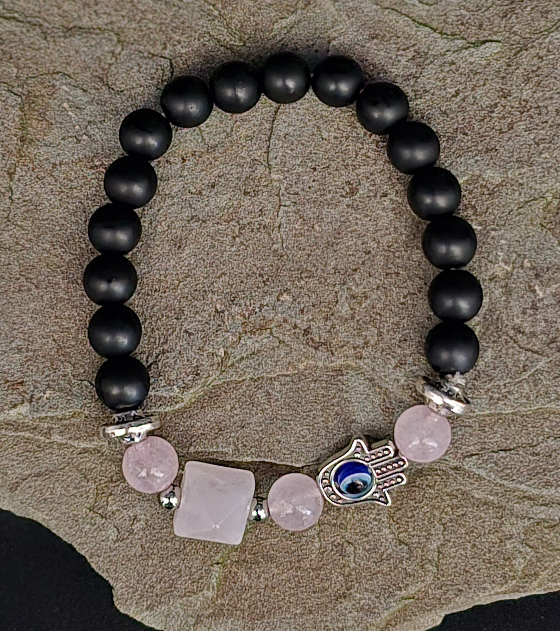 Symbolic Meaning: The Rose Quartz Evil Eye Hamsa Hand Bracelet carries several symbolic meanings: Love and Compassion: Rose Quartz is associated with unconditional love, compassion, and emotional healing, fostering deep connections with oneself and others. Protection: The Hamsa Hand and Evil Eye symbolize protection from negative energies and malevolent forces, creating a shield of spiritual defense around the wearer. Heart Opening: Rose Quartz is believed to open the heart chakra, promoting forgiveness, empathy, and self-love, leading to greater inner harmony and well-being.