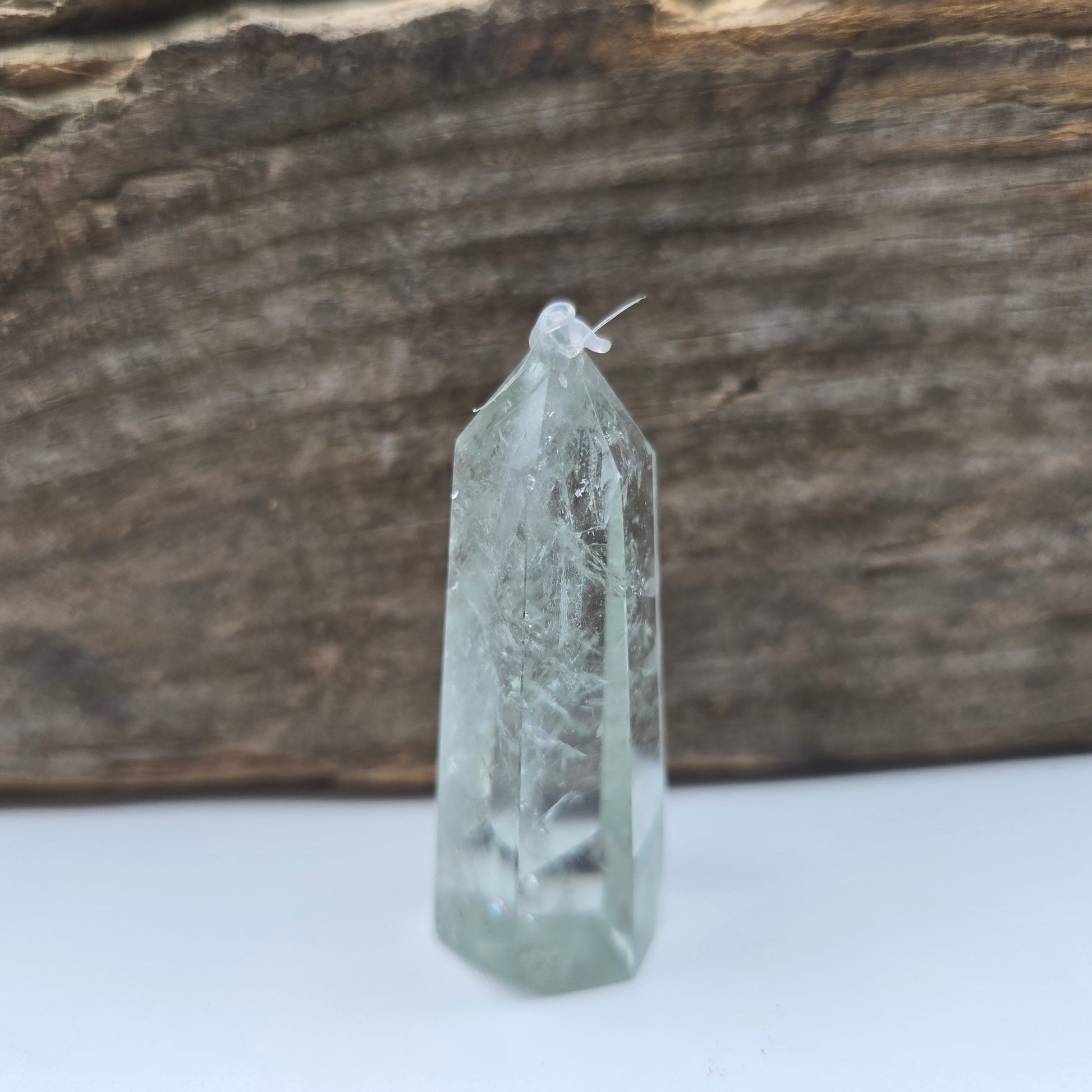 Green Amethyst, also known as Prasiolite, is a variety of quartz that ranges in color from pale green to a deeper, more vibrant green. Green Amethyst towers typically have a pointed, obelisk-like shape, designed to direct energy. The color can range from a light, almost mint green to a richer, olive green, often with natural inclusions and patterns within the crystal. Formation: It is usually created by heat-treating Amethyst or Citrine, which changes the stone's color to green.