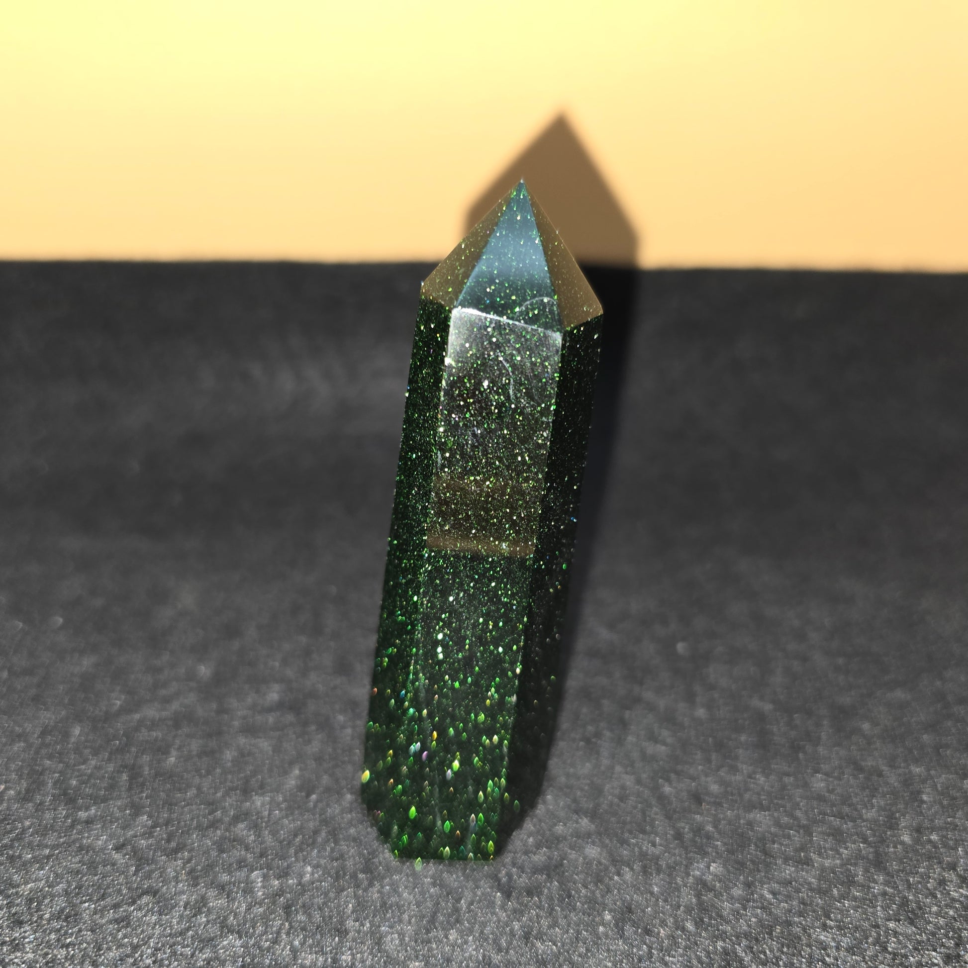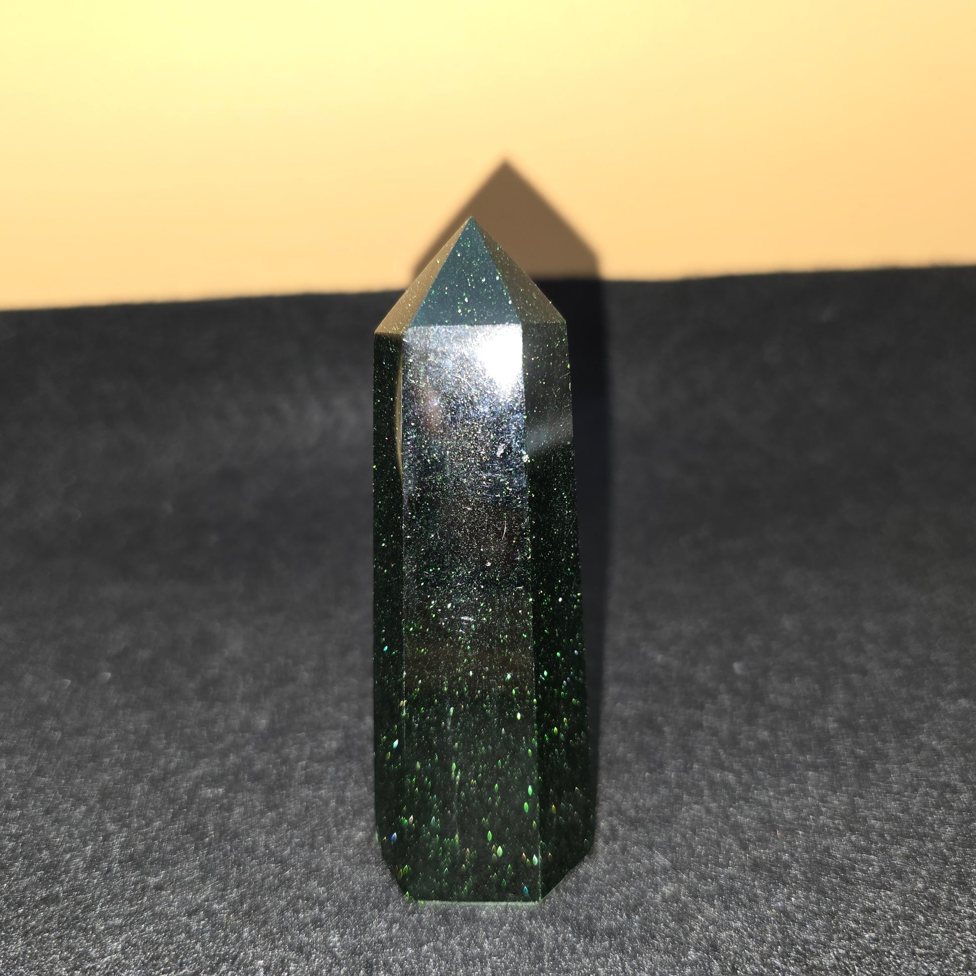 Green Sandstone, often referred to as Green Goldstone, is a man-made glass characterized by its vibrant green color and sparkling copper inclusions. The copper flecks within the glass create a mesmerizing shimmer reminiscent of a lush green forest under sunlight. When crafted into a tower shape, Green Sandstone retains its natural sparkle and enhances the aesthetic appeal, making it a popular choice for both decorative and metaphysical purposes.