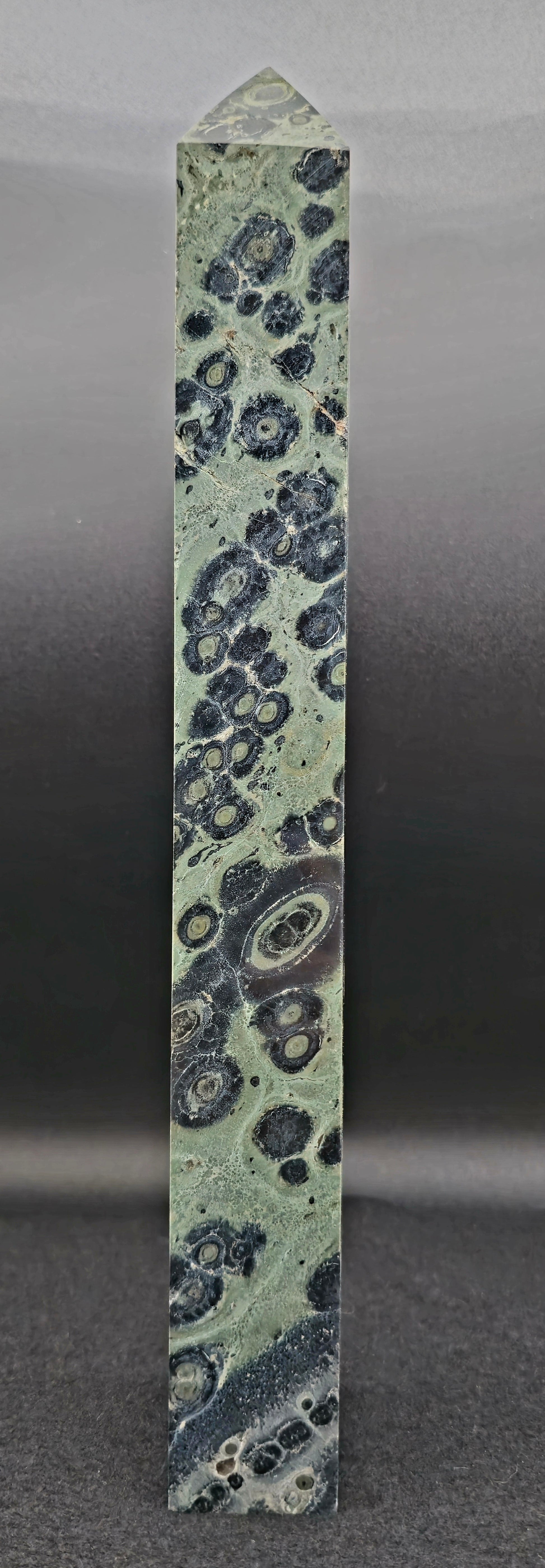 Appearance: Kambaba Jasper towers are typically carved into tall, slender shapes, resembling the form of a tower or obelisk. The natural patterns and colors of the Kambaba Jasper create a mesmerizing display, with shades of dark green, black, and sometimes hints of lighter hues intermingling to form intricate designs reminiscent of the natural world.