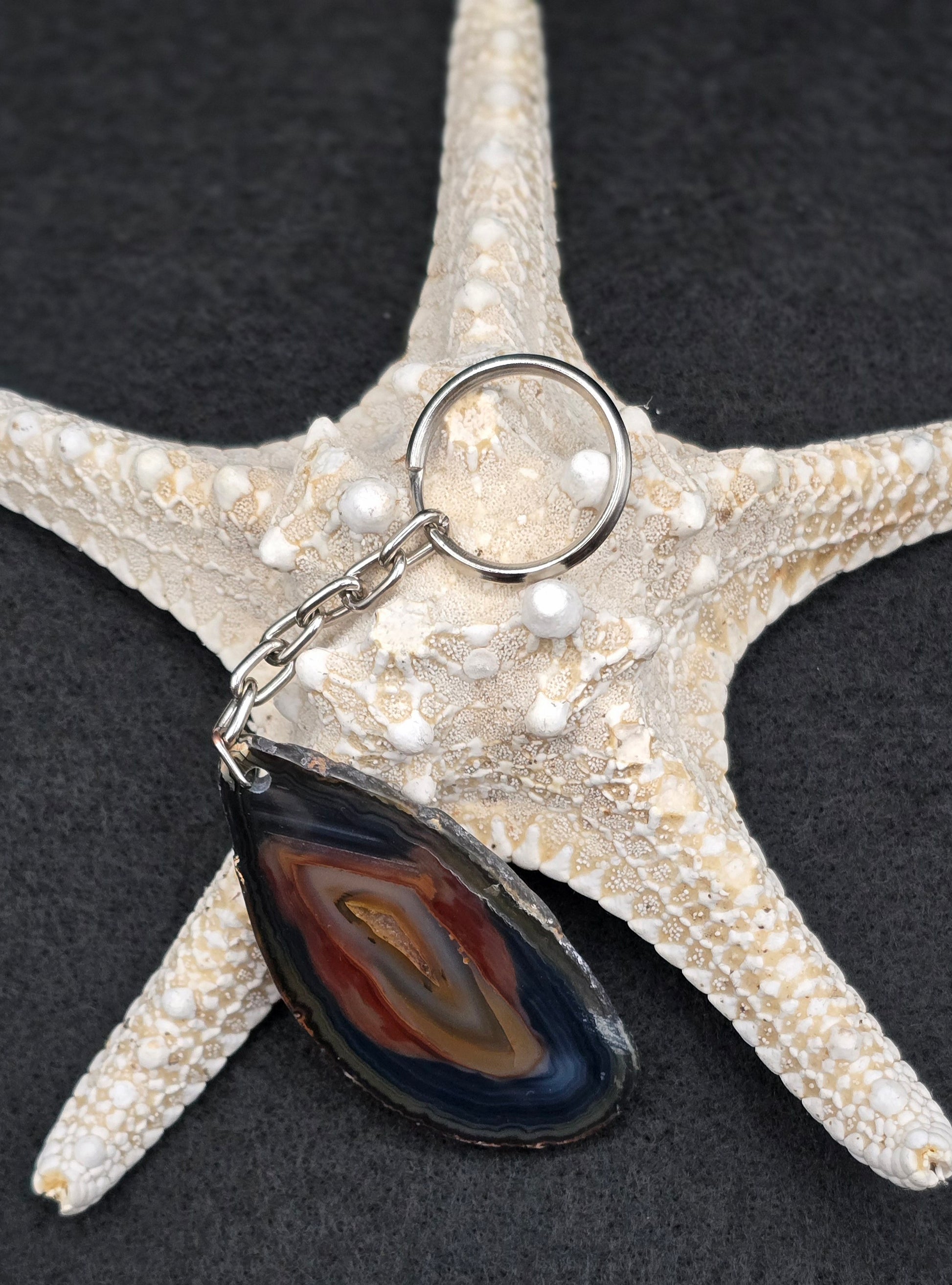Here are some features and potential benefits of a Gray/Blue Agate slice keychain: Natural Beauty: Gray or blue agate slices often display intricate banding patterns and soothing color variations, making each keychain a unique and visually appealing piece of natural art. The cool tones of gray or blue can add a touch of serenity and calmness to your everyday accessories. Communication and Expression: Blue is often associated with qualities such as communication, clarity, and self-expression. Carrying a Gray/Blue Agate slice keychain with you may help enhance your communication skills, improve your ability to express yourself, and promote clarity of thought. Throat Chakra Alignment: Blue is the color associated with the throat chakra, which governs communication, self-expression, and speaking one's truth. Carrying a Gray/Blue Agate slice keychain can help balance and harmonize the energy of your throat chakra, promoting clear and authentic communication. Emotional Healing and Stability: Gray is often associated with qualities such as stability, neutrality, and emotional balance. Carrying a Gray/Blue Agate slice keychain with you may help promote emotional healing, soothe turbulent emotions, and provide a sense of stability during challenging times. Protection and Grounding: Agate is known for its stabilizing and grounding properties. Carrying a Gray/Blue Agate slice keychain can help ground your energy, ward off negative energies, and provide a sense of protection and security. Creativity and Inspiration: Blue agate is associated with stimulating creativity and inspiring imagination. Carrying a Gray/Blue Agate slice keychain may help spark new ideas, enhance artistic expression, and fuel your passion for creative endeavors. Gift Giving: Gray/Blue Agate slice keychains make thoughtful gifts for friends, family, or colleagues who appreciate natural beauty and symbolism. They can serve as a meaningful token of your friendship, support, or well wishes.