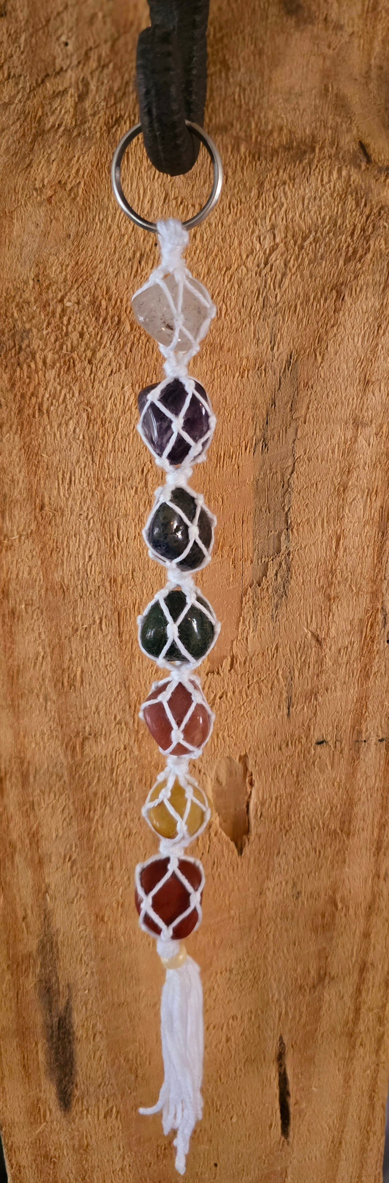 A Chakra tumble key chain is a key chain adorned with various crystals or stones representing the seven main chakras of the body. Each chakra is associated with specific energy centers along the spine, and different crystals are believed to correspond with each chakra, helping to balance and align its energy.