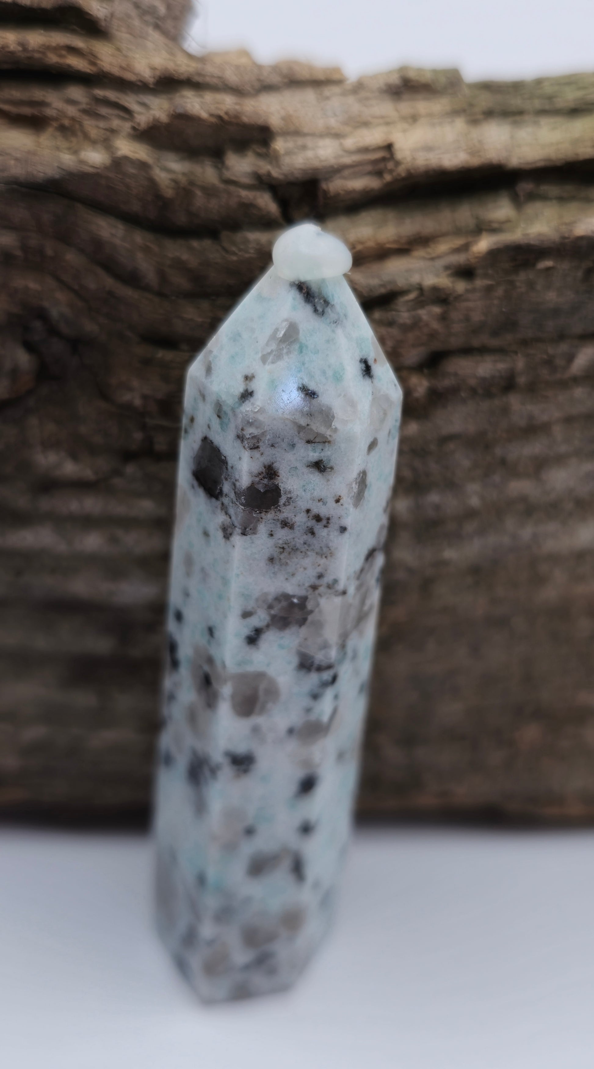 The Kiwi Jasper Tower is a beautifully polished crystal tower, made from the stunning Kiwi Jasper stone. Known for its unique blend of serene blue-green hues and speckled patterns, this crystal tower is not only a visual delight but also a powerful tool for enhancing personal well-being and environmental harmony.