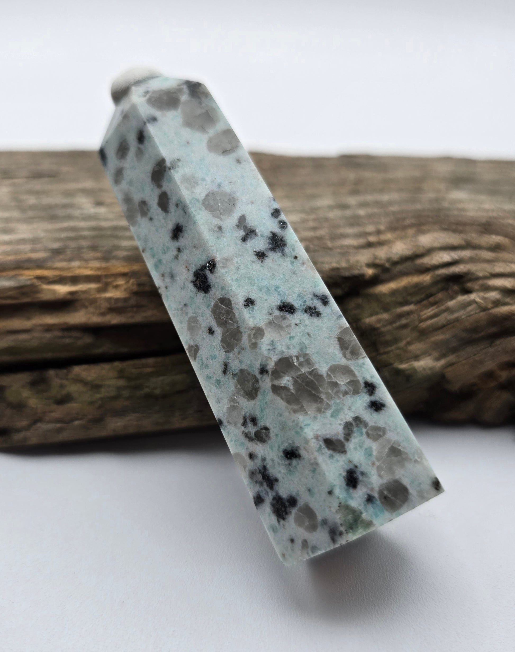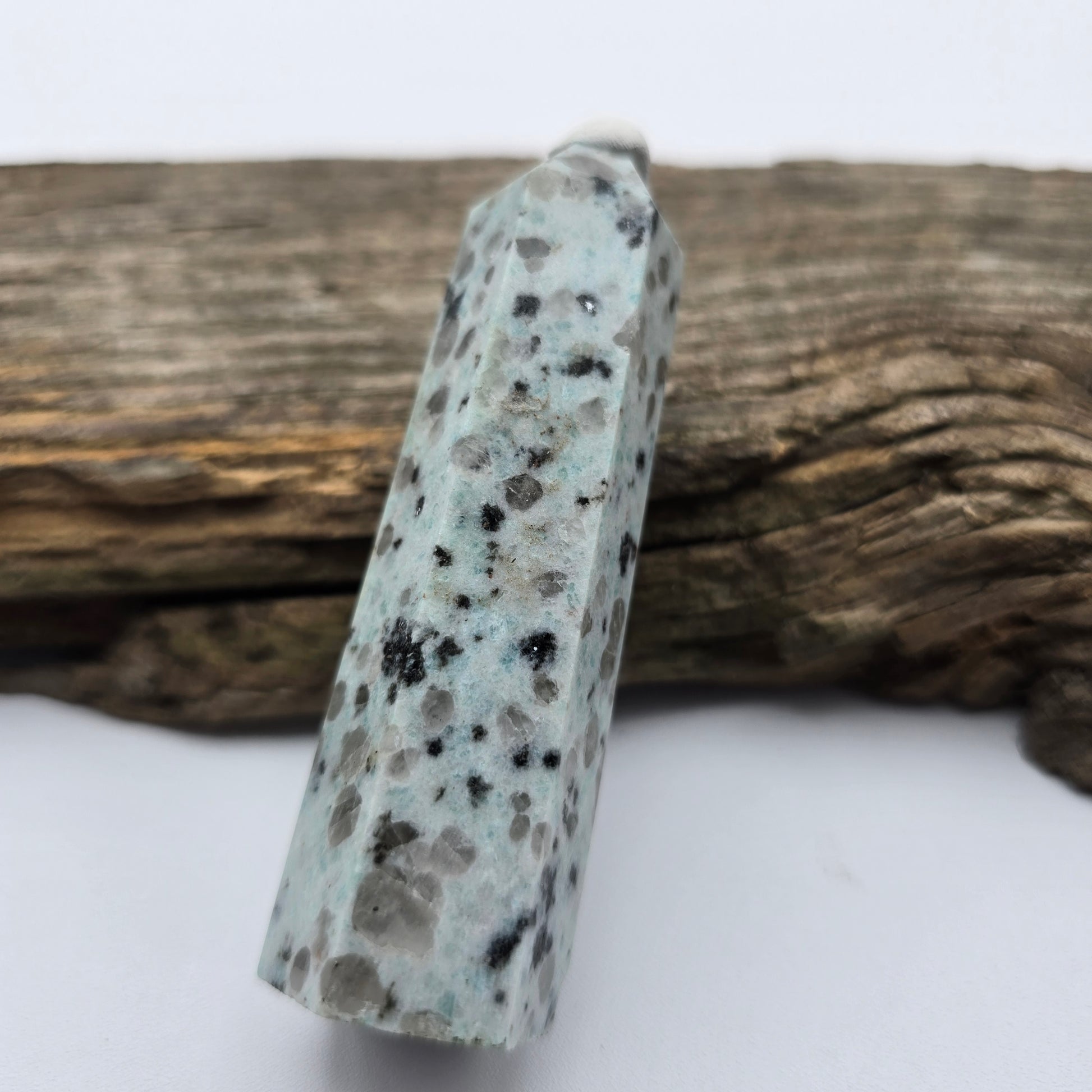 The Kiwi Jasper Tower is a beautifully polished crystal tower, made from the stunning Kiwi Jasper stone. Known for its unique blend of serene blue-green hues and speckled patterns, this crystal tower is not only a visual delight but also a powerful tool for enhancing personal well-being and environmental harmony.