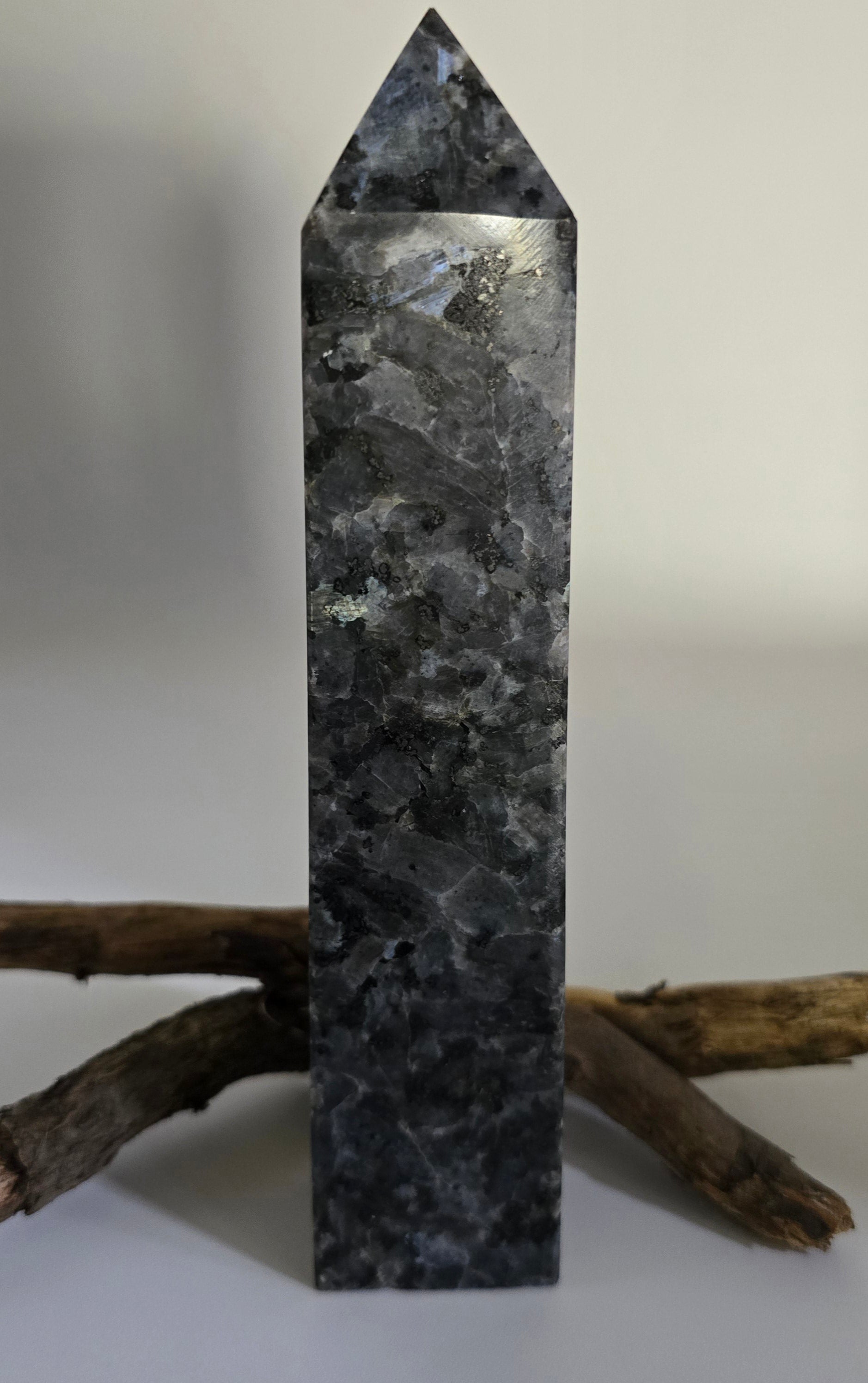 The Larvikite Tower is a striking crystal formation made from the captivating Larvikite stone. Renowned for its mesmerizing labradorescence, this crystal displays a spectrum of shimmering colors, predominantly silvery blue and black. Polished into a tower shape, the Larvikite Tower serves both as a decorative piece and a potent tool for enhancing spiritual and physical well-being.
