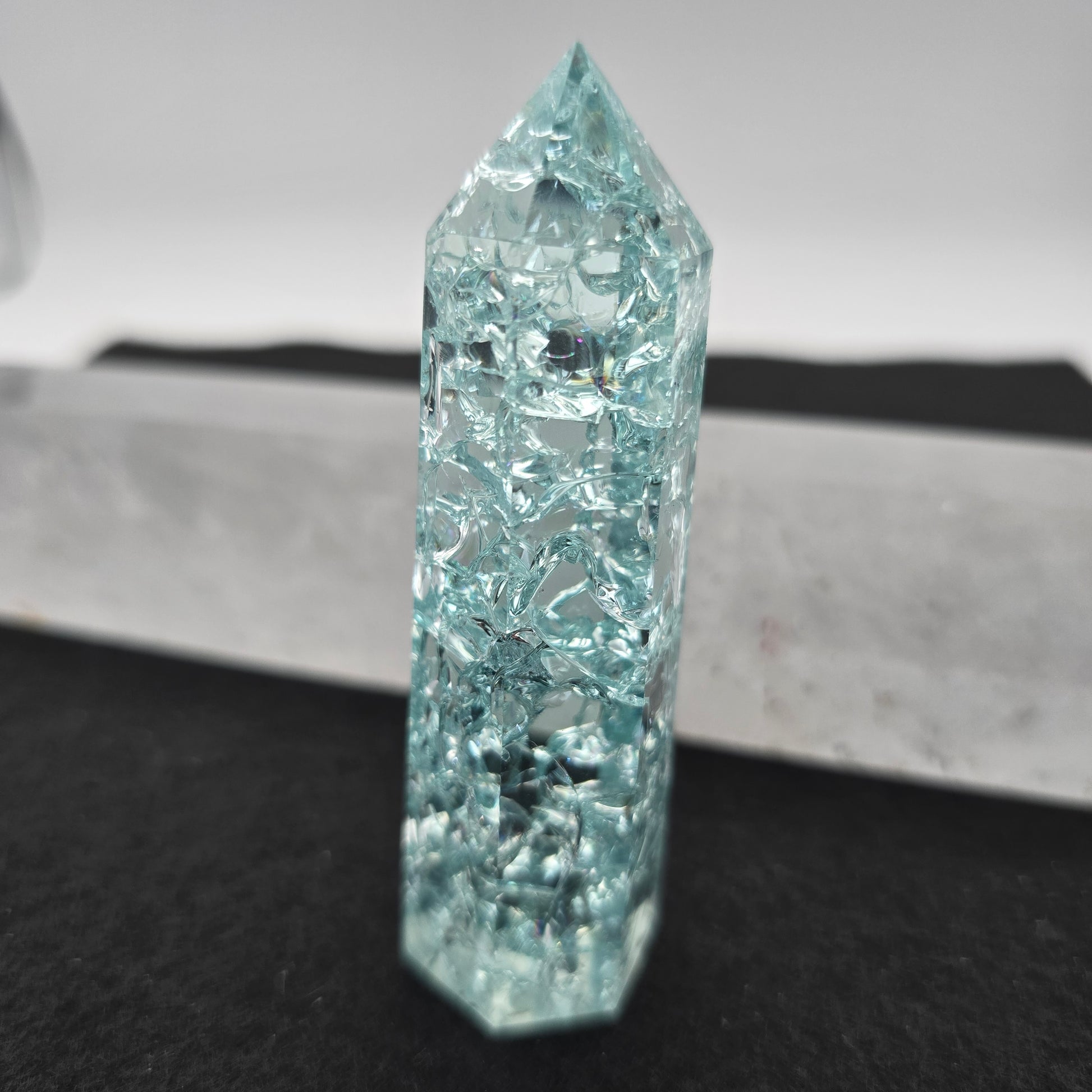 The Light Blue Crackle Quartz Tower is a stunning gemstone structure that radiates calmness and elegance.