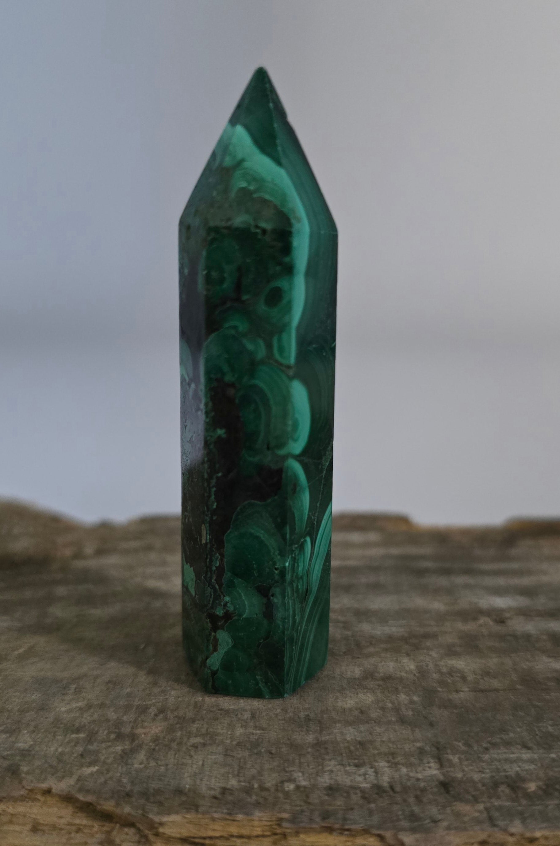 The Malachite Tower is a stunning crystal formation crafted from the vibrant green Malachite stone. With its intricate bands and swirls of varying shades of green, this polished tower is both a captivating decorative piece and a powerful tool for emotional and physical healing.