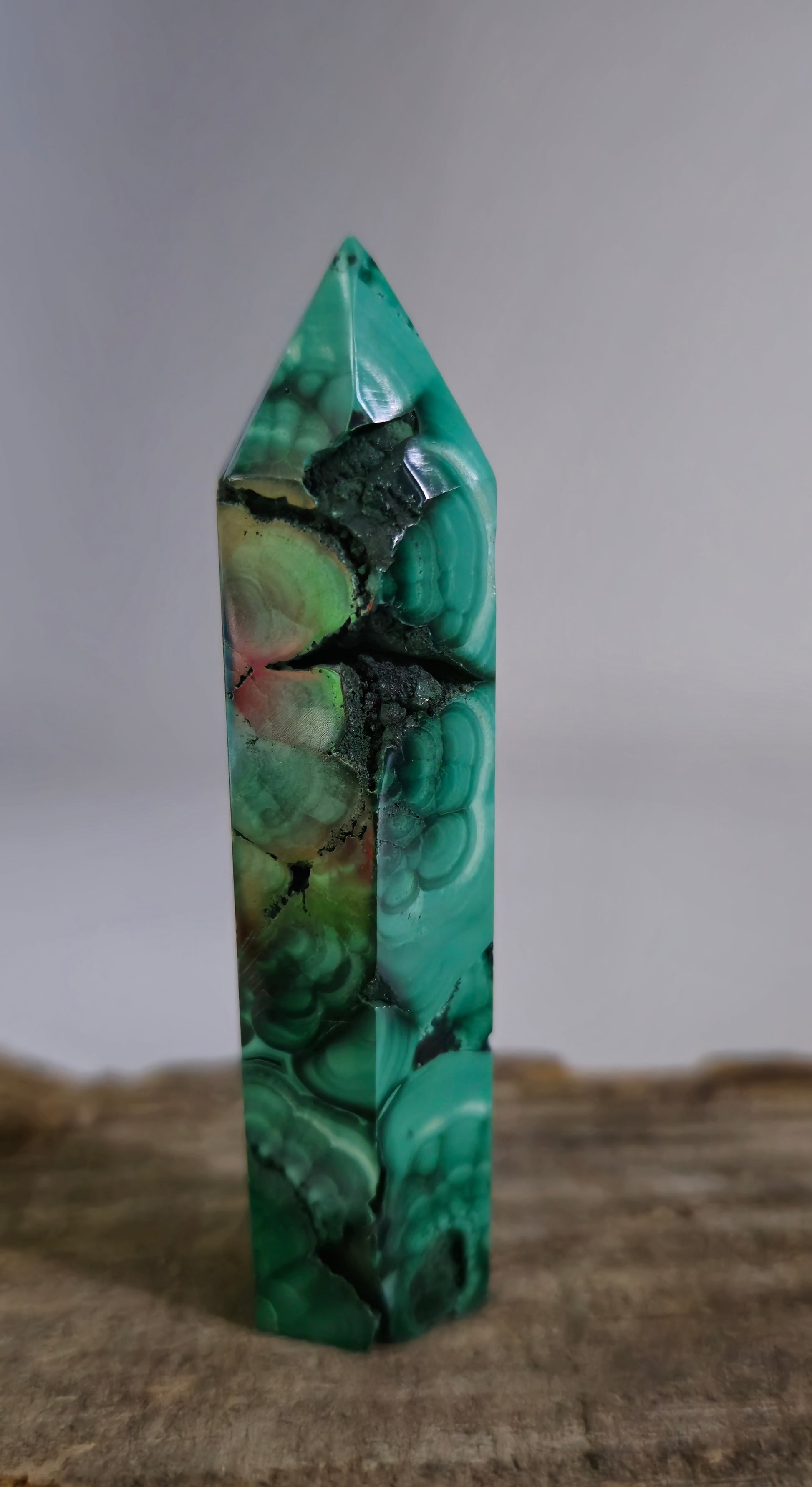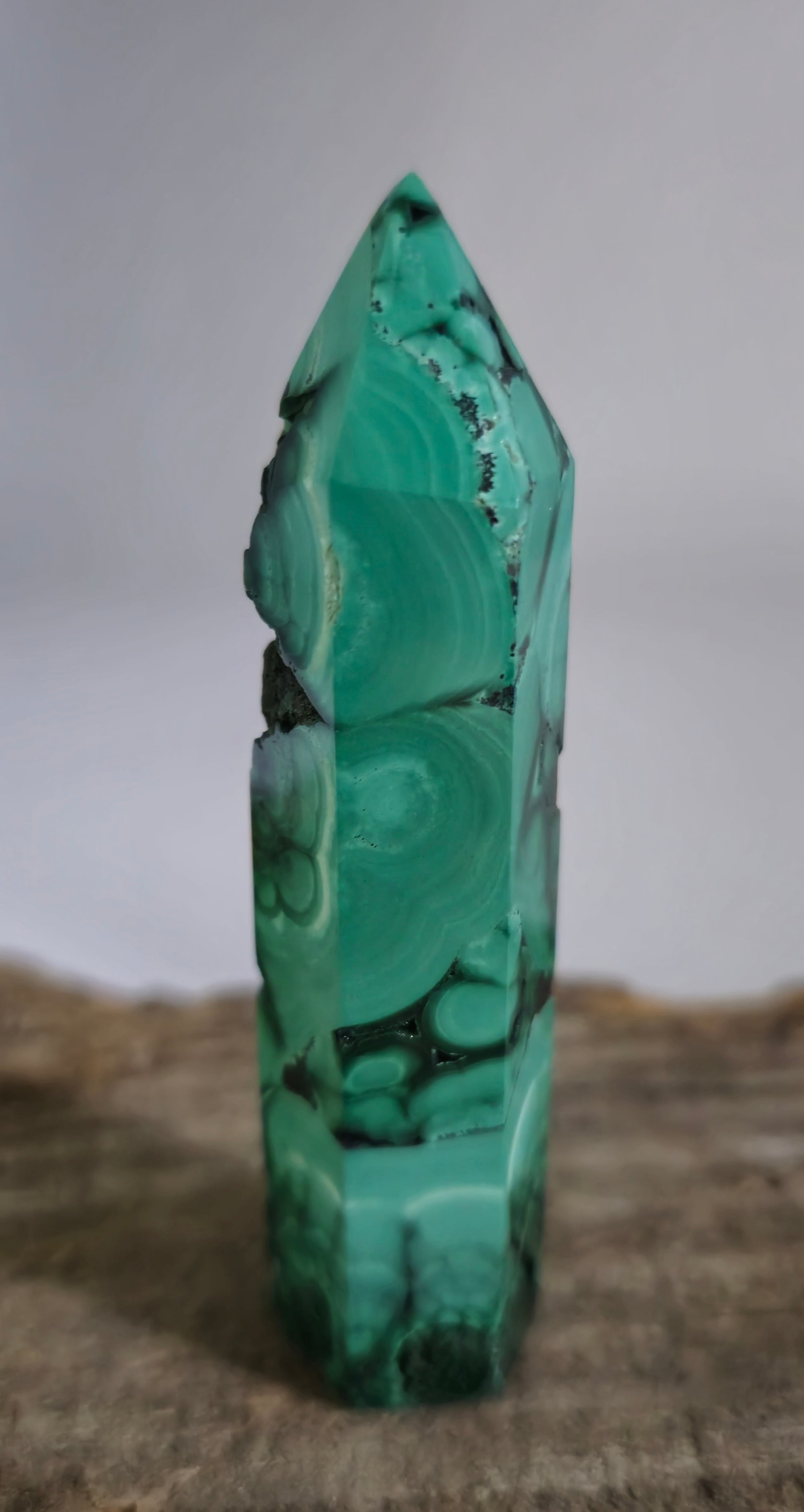 The Malachite Tower is a stunning crystal formation crafted from the vibrant green Malachite stone. With its intricate bands and swirls of varying shades of green, this polished tower is both a captivating decorative piece and a powerful tool for emotional and physical healing.