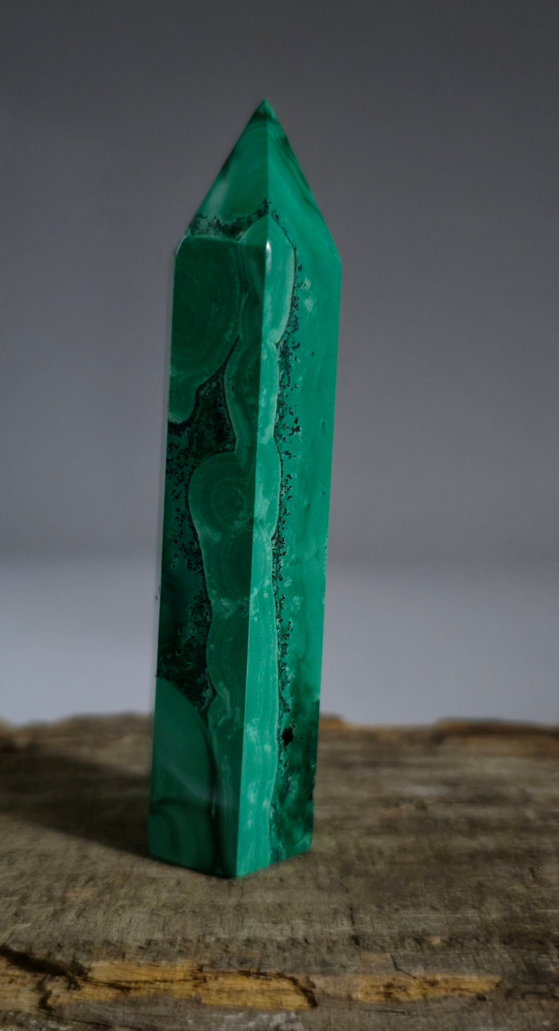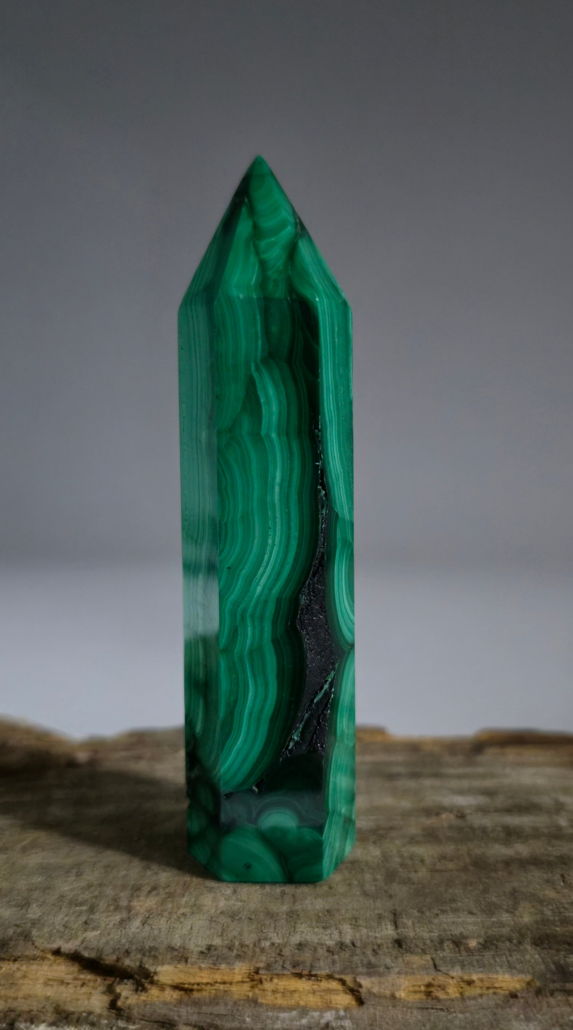The Malachite Tower is a stunning crystal formation crafted from the vibrant green Malachite stone. With its intricate bands and swirls of varying shades of green, this polished tower is both a captivating decorative piece and a powerful tool for emotional and physical healing.