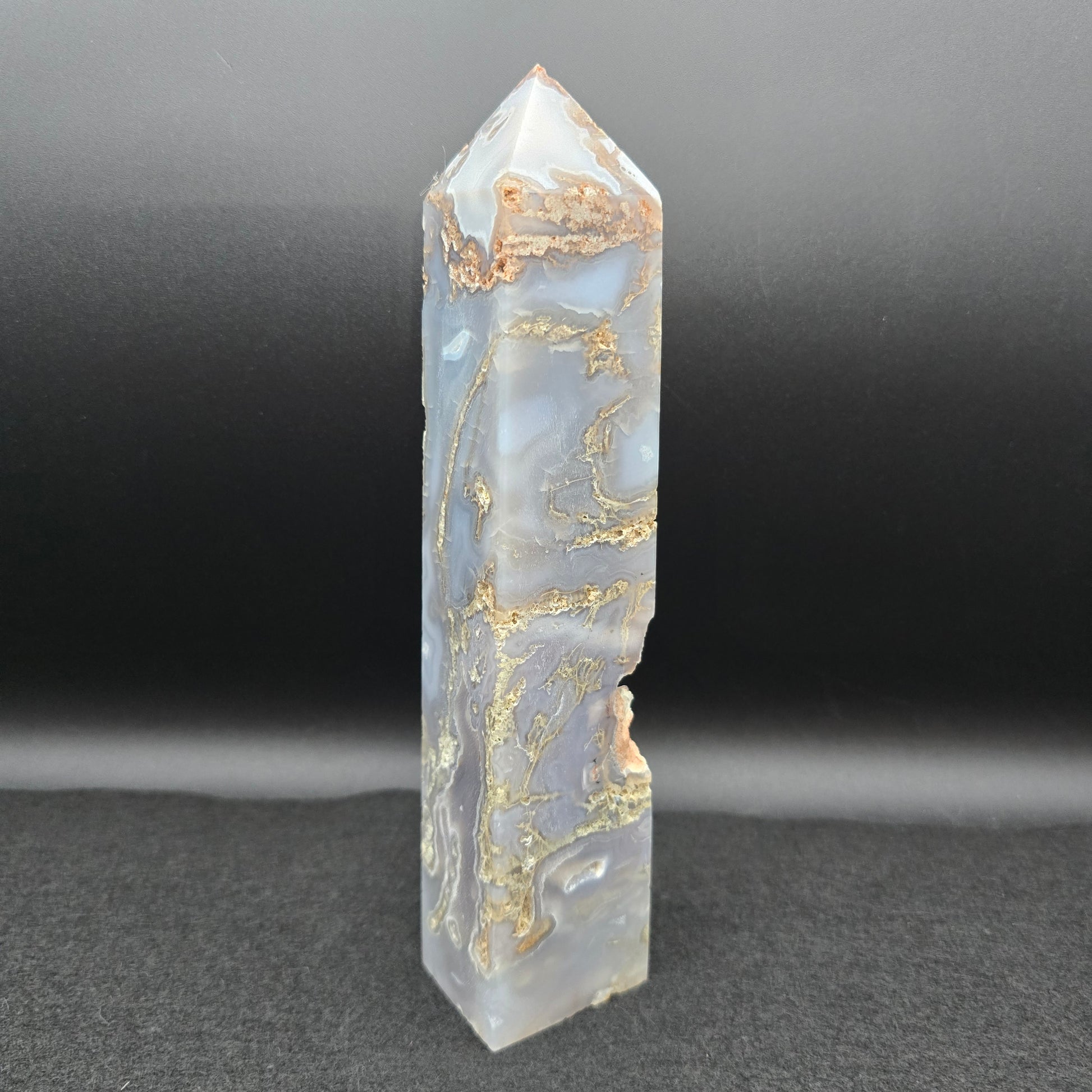 A Moss Agate tower is typically a polished, upright piece of this stone, shaped into a point at the top. This form is often used in crystal healing and meditation practices, as the pointed shape is believed to direct energy upwards.