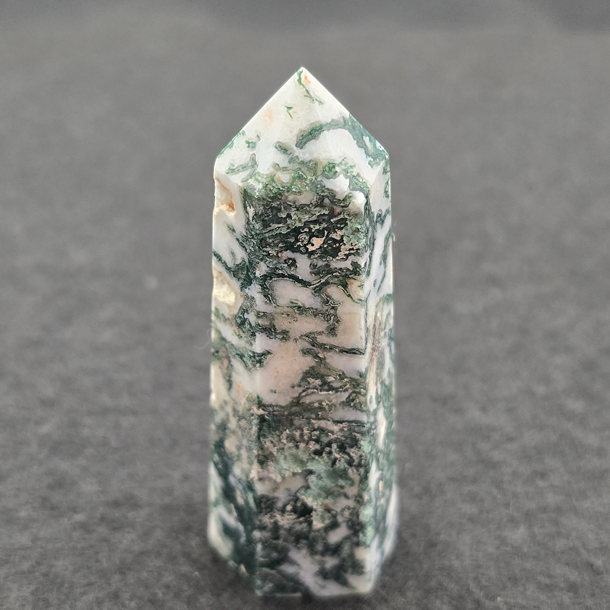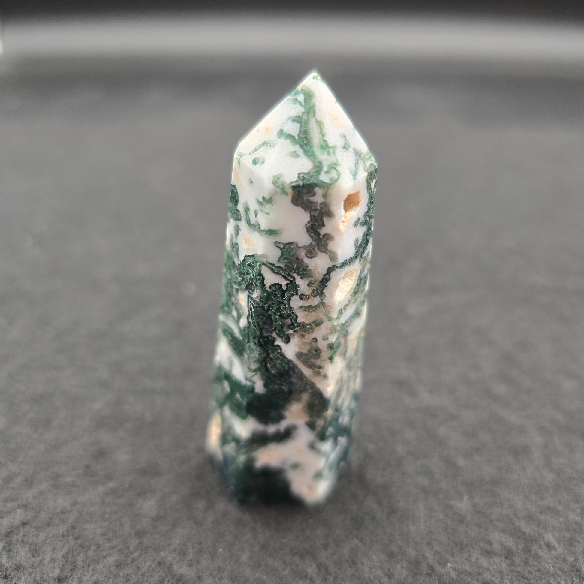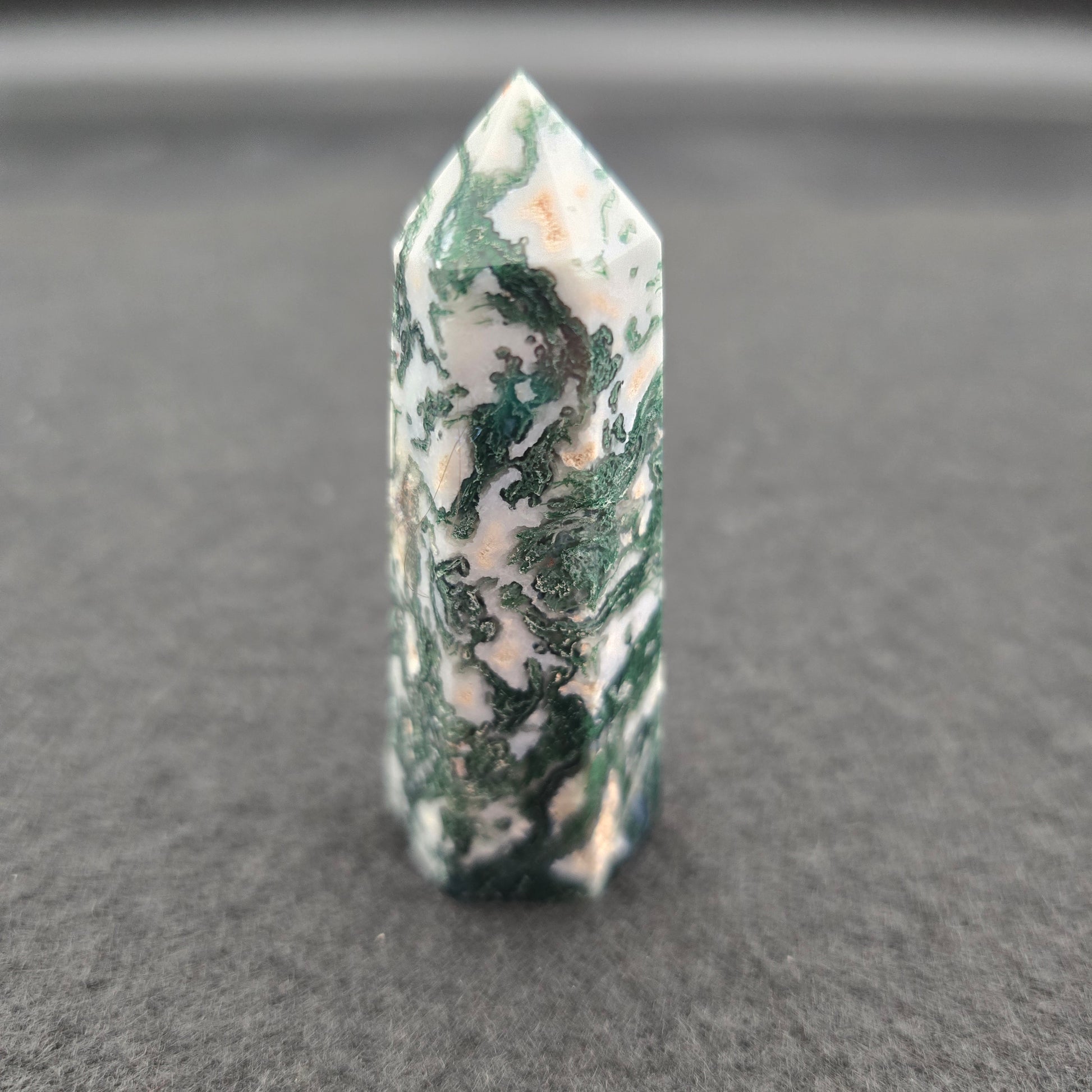 A Moss Agate tower is typically a polished, upright piece of this stone, shaped into a point at the top. This form is often used in crystal healing and meditation practices, as the pointed shape is believed to direct energy upwards.