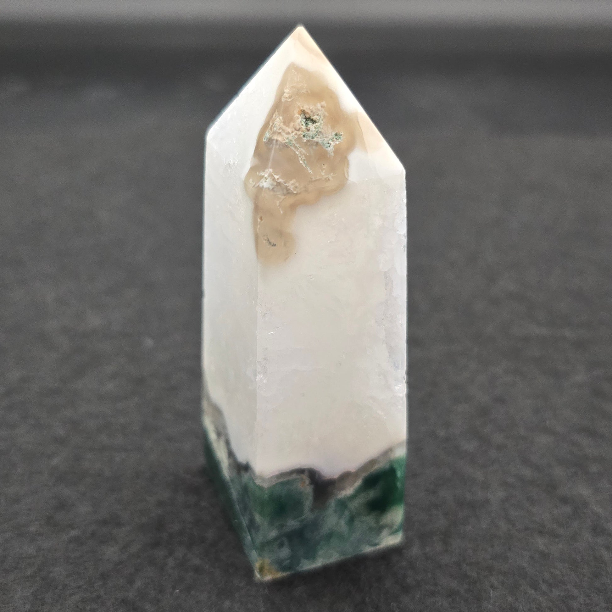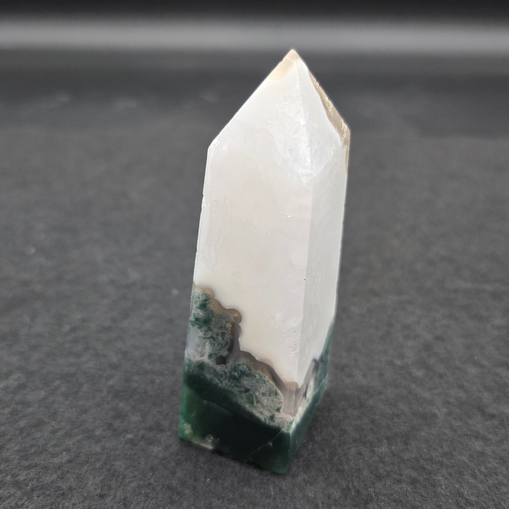 A Moss Agate tower is typically a polished, upright piece of this stone, shaped into a point at the top. This form is often used in crystal healing and meditation practices, as the pointed shape is believed to direct energy upwards.