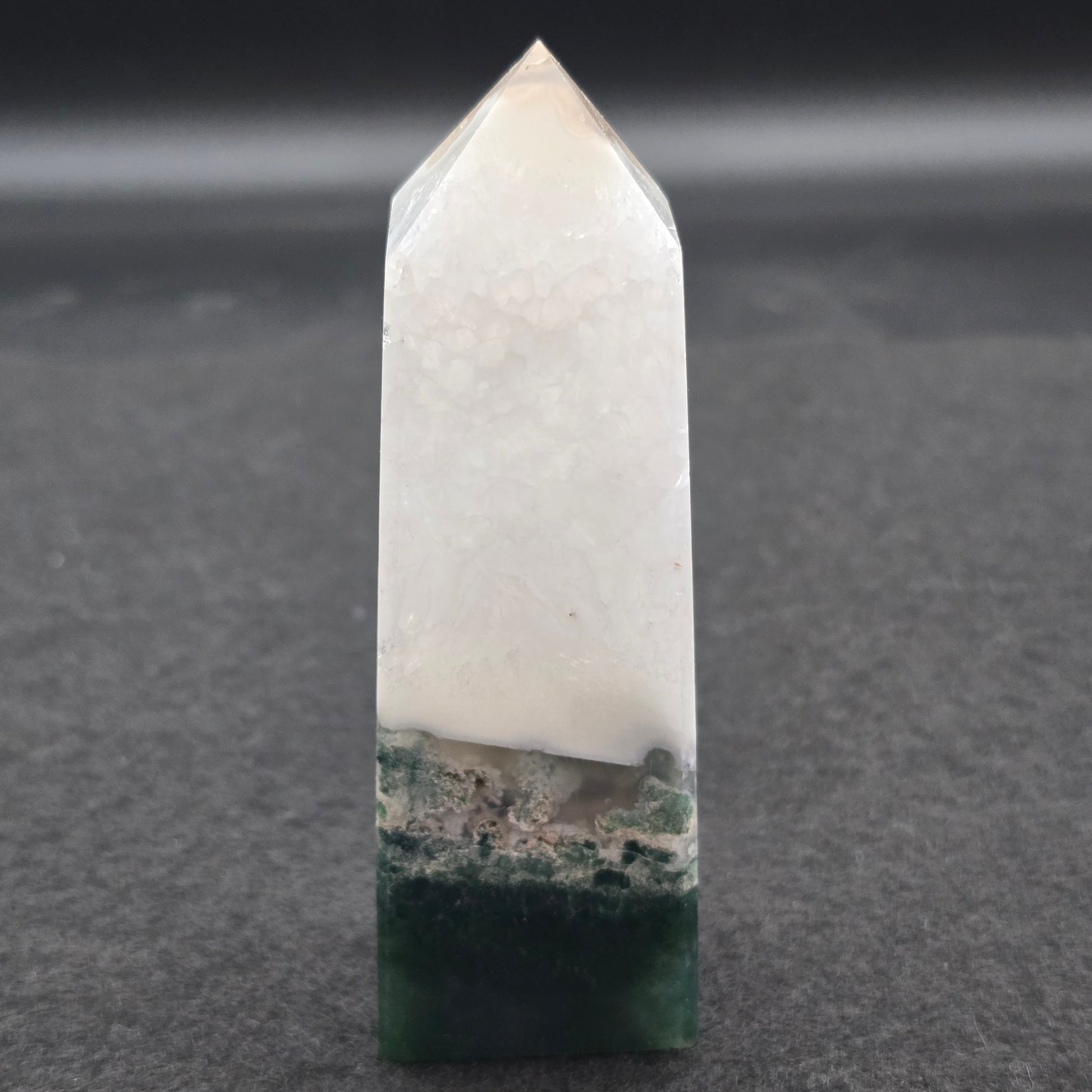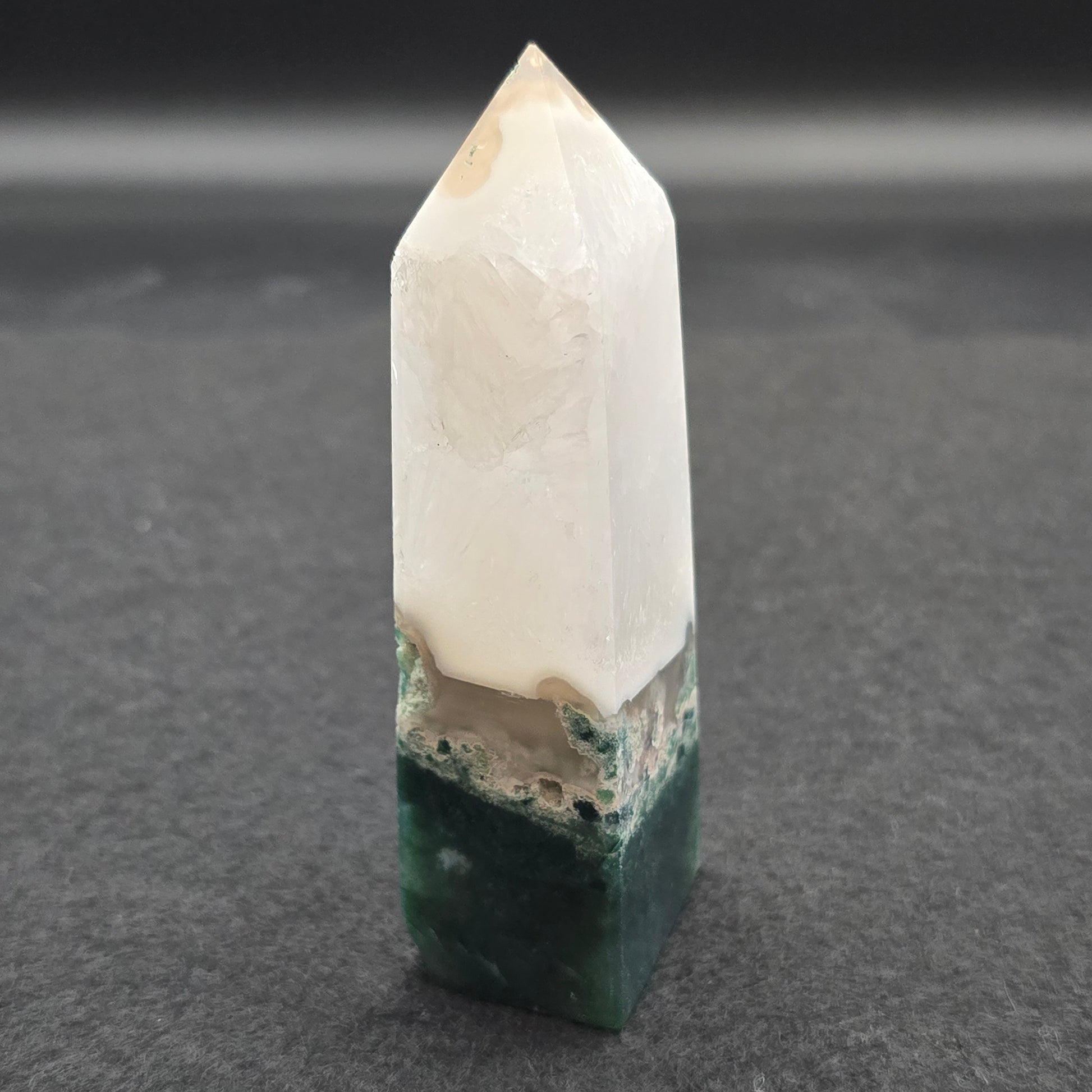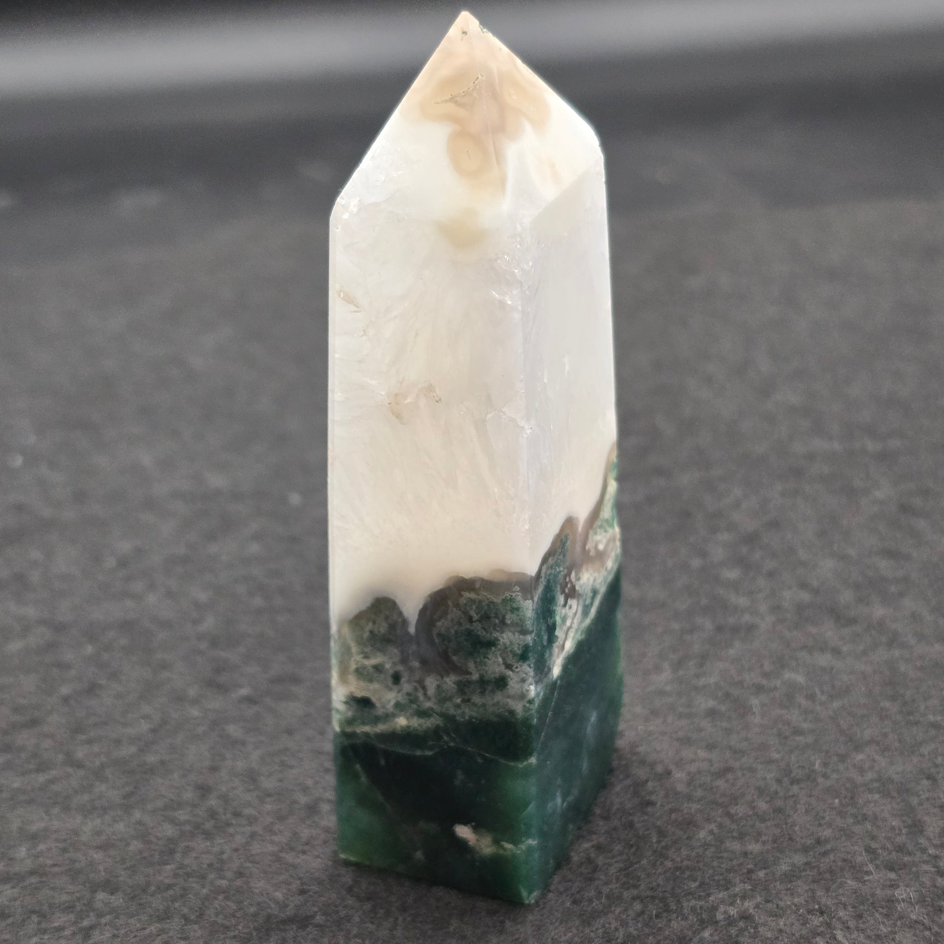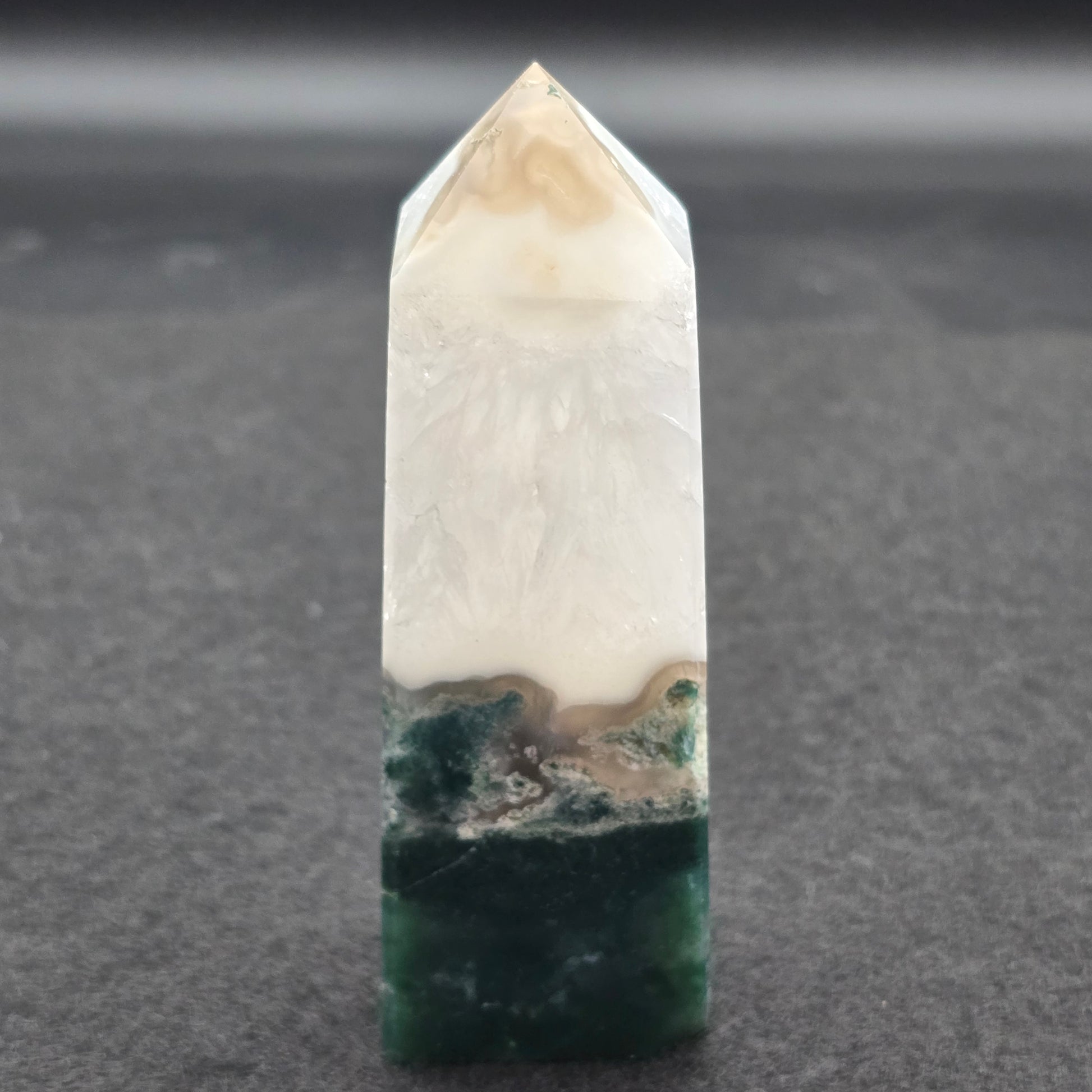 A Moss Agate tower is typically a polished, upright piece of this stone, shaped into a point at the top. This form is often used in crystal healing and meditation practices, as the pointed shape is believed to direct energy upwards.