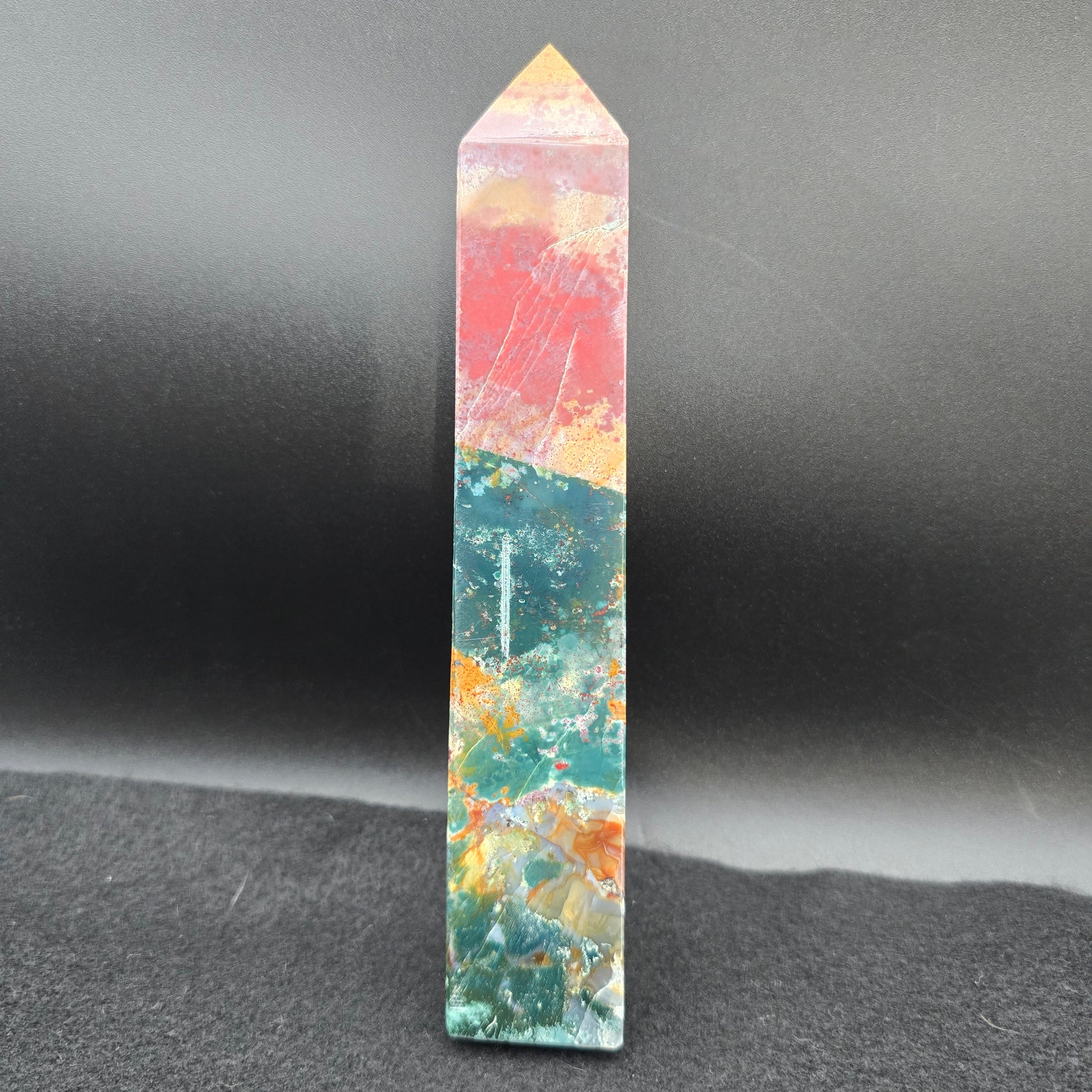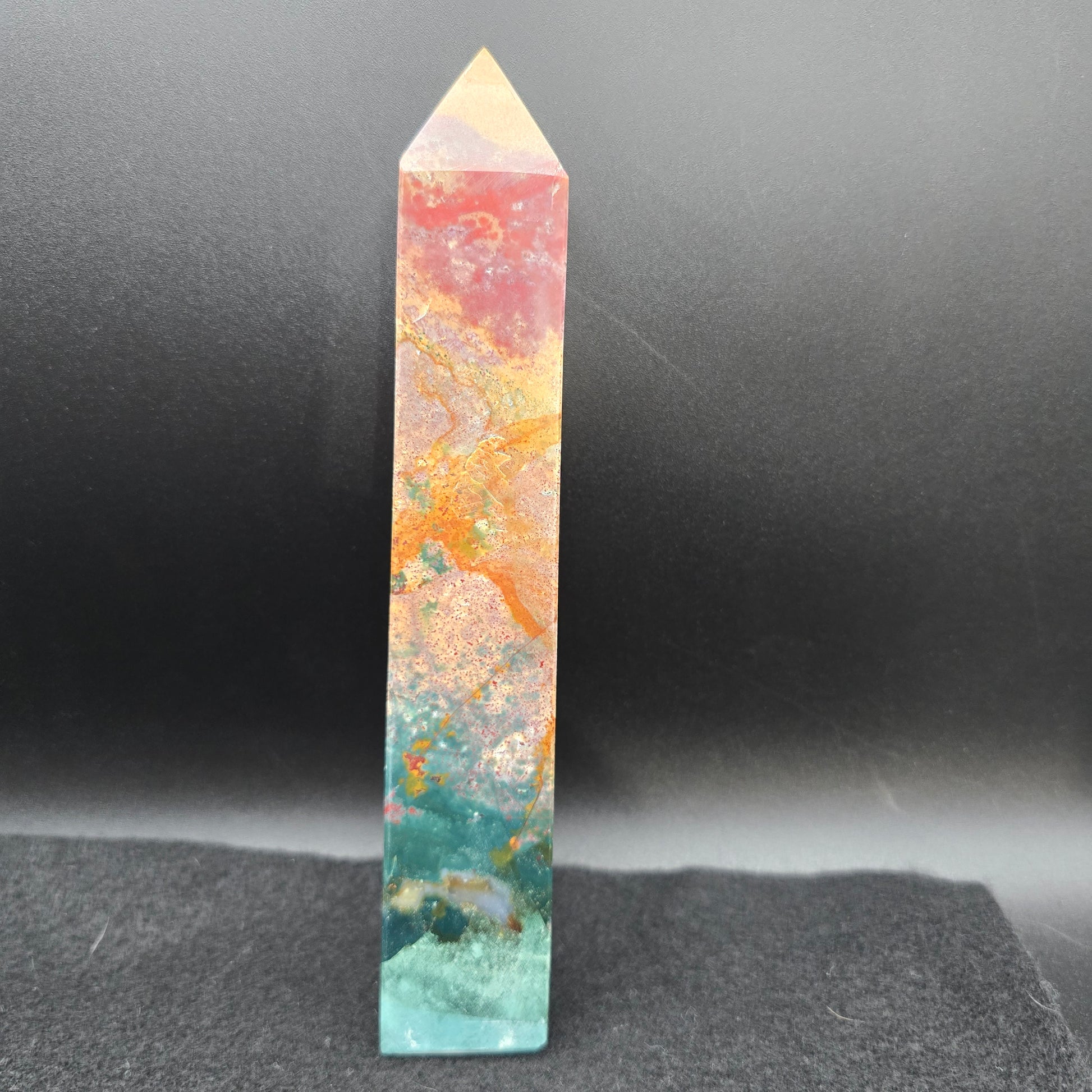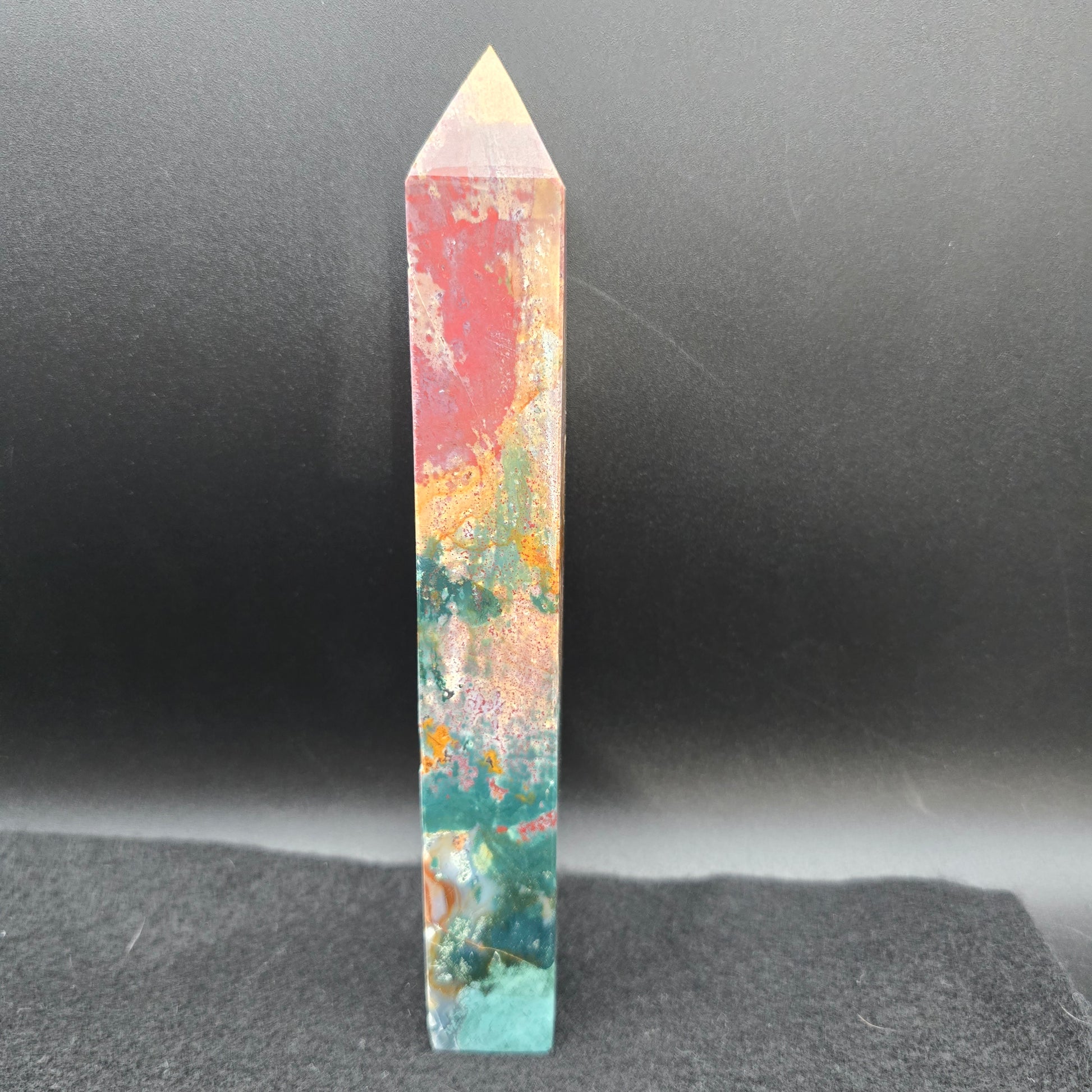 An Ocean Jasper tower is a polished, pointed piece of Ocean Jasper shaped into a tower or obelisk form. Towers are used in energy healing and metaphysical practices to direct and amplify energy.