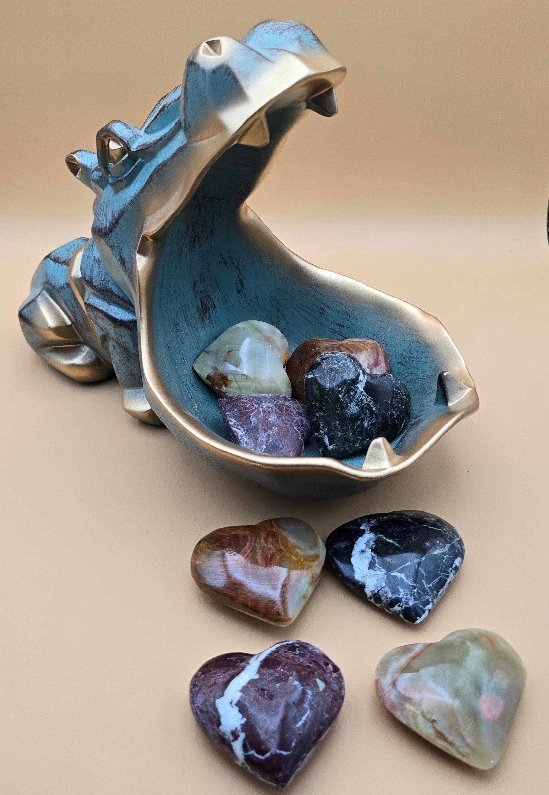 - The natural patterns and colors of the stone make each heart unique, with no two pieces being exactly alike.