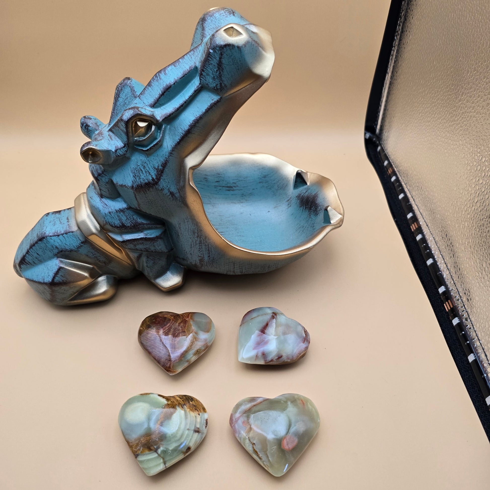 - Onyx: Known for its vibrant bands of color and translucency, onyx hearts often have a polished, glossy finish that brings out the stone's natural patterns and hues.