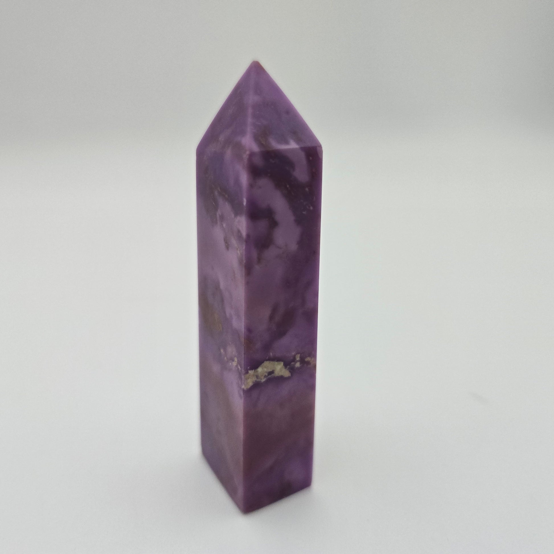 A Phosphosiderite tower is a polished, pointed piece of Phosphosiderite shaped into a tower or obelisk form. Phosphosiderite is a mineral that typically exhibits a range of purple to pink colors, often with a pearly or vitreous luster.