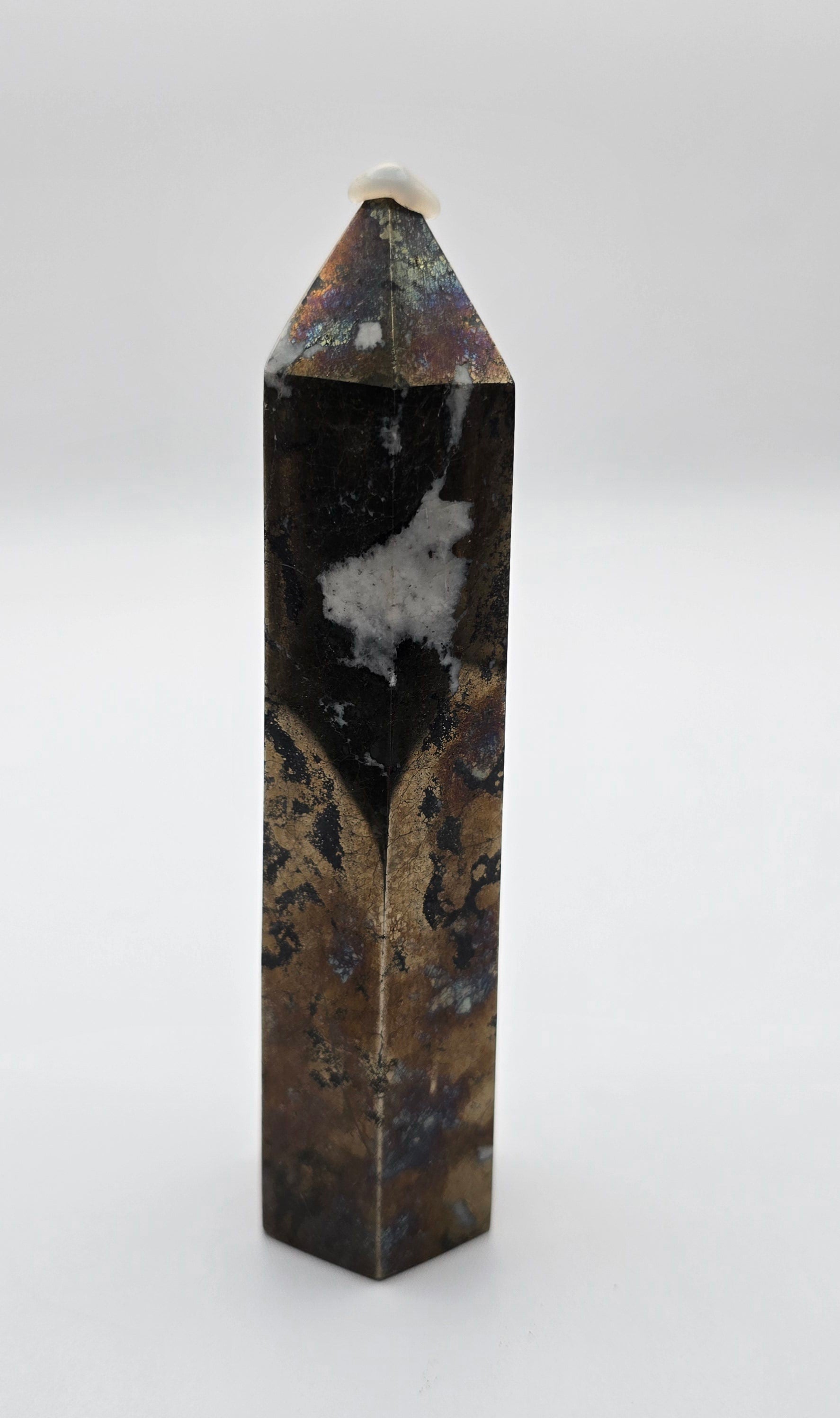 Crafted from natural pyrite, this Healers Gold Tower is not only a stunning addition to any crystal collection, but it is also believed to have healing properties. Pyrite is known to promote physical and emotional well-being, making this tower a beneficial tool for meditation and mindfulness practices. Bring positive energy into your life with Pyrite Tower